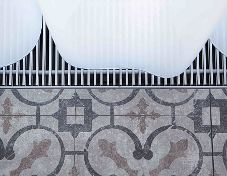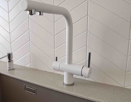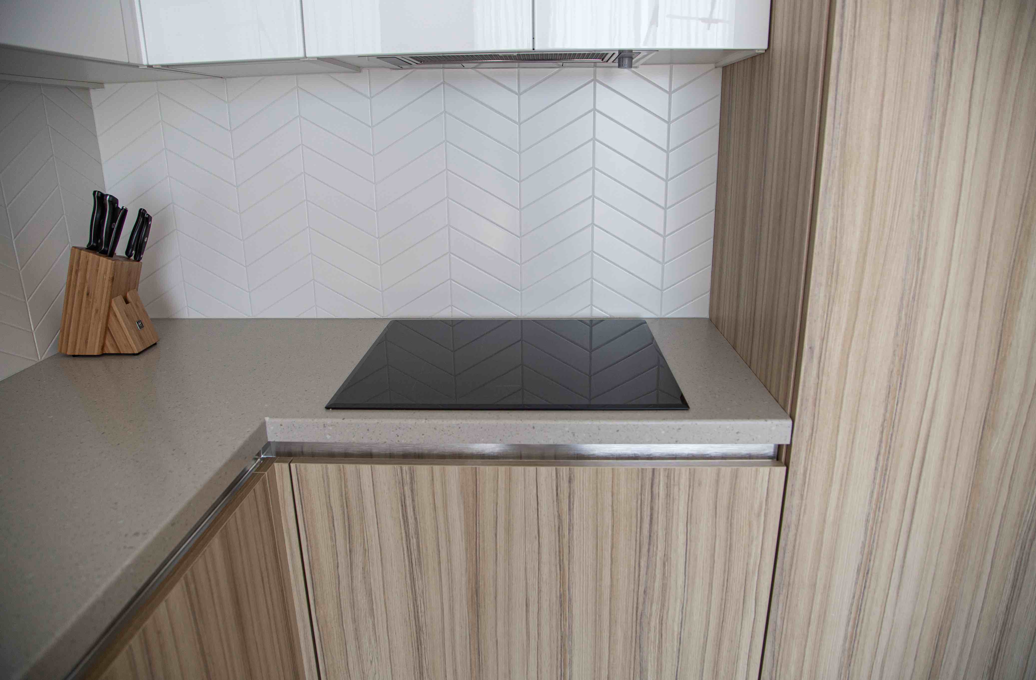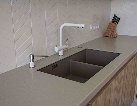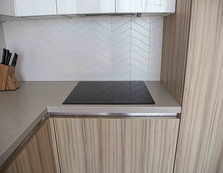 В качестве отопительных приборов в кухне-гостиной используем внутрипольный конвектор и вертикальный трубчатый радиатор, также по всей площади помещения уложили электрический «теплый пол». Потолок выполнен из гипсокартона в один уровень, с нишами под шторы и светодиодную подсветку. В отделке стен использовалась декоративная штукатурка, рабочая зона кухни облицована мелкоразмерной плиткой в раскладке «елка», на полу уложен керамогранит.