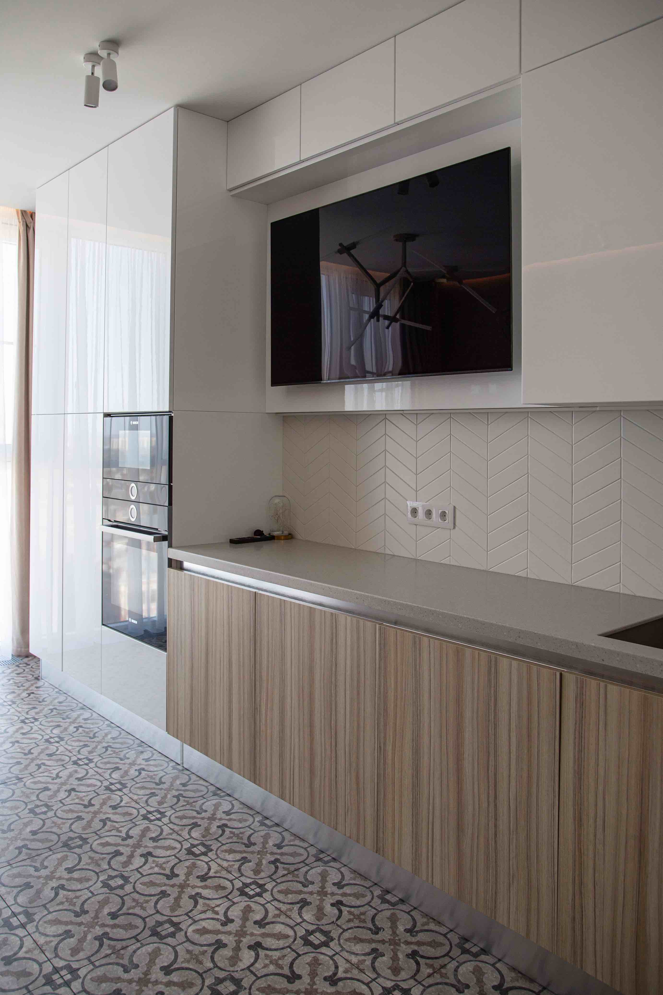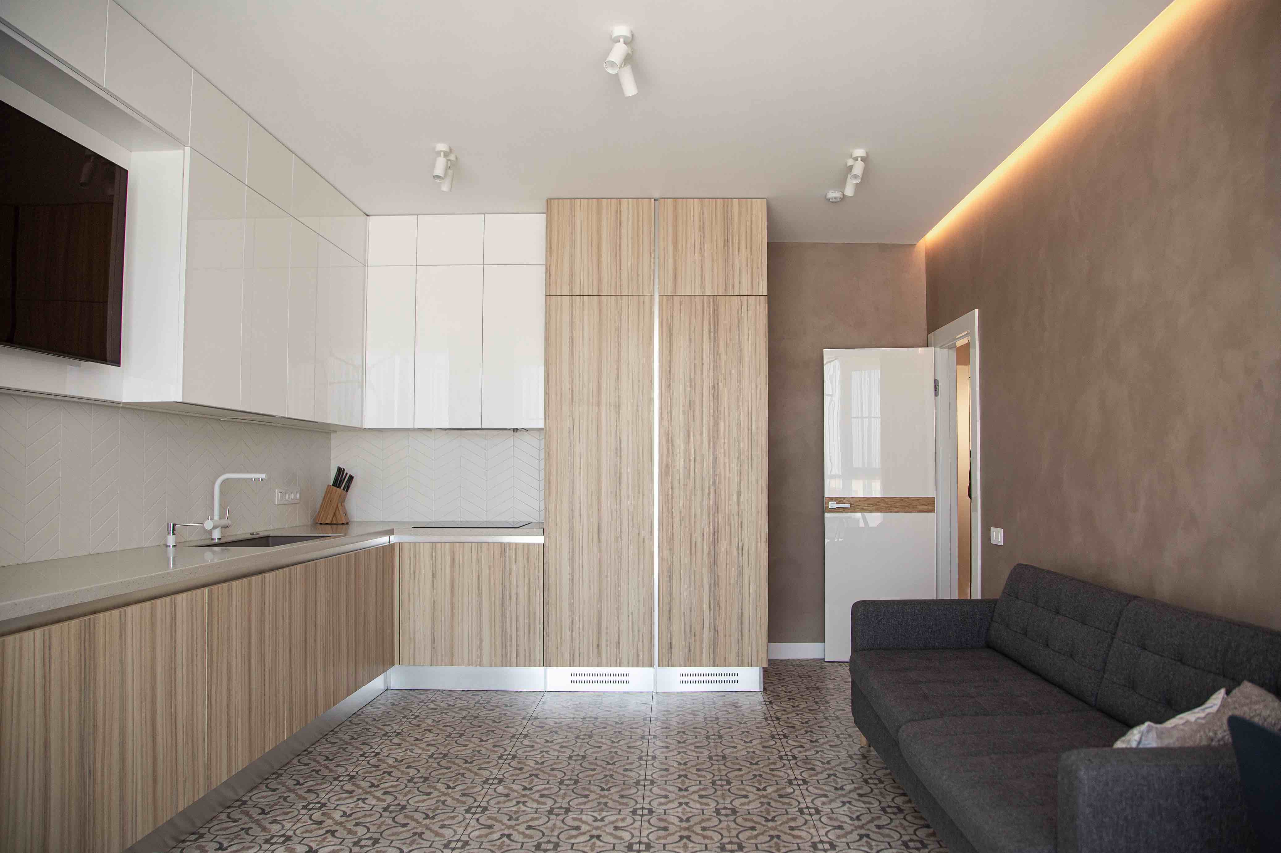 Площадь кухни-гостиной составила 21,5 м2, которая увеличилась за счёт объединения с лоджией. В ней мы полностью демонтировали парапет балкона, установили витражное остекление из алюминиевых конструкций с двухкамерными стеклопакетами для лучшего энергосбережения. За счет витражного остекления помещение стало более светлым и просторным, а из окна открылся великолепный вид на город.
