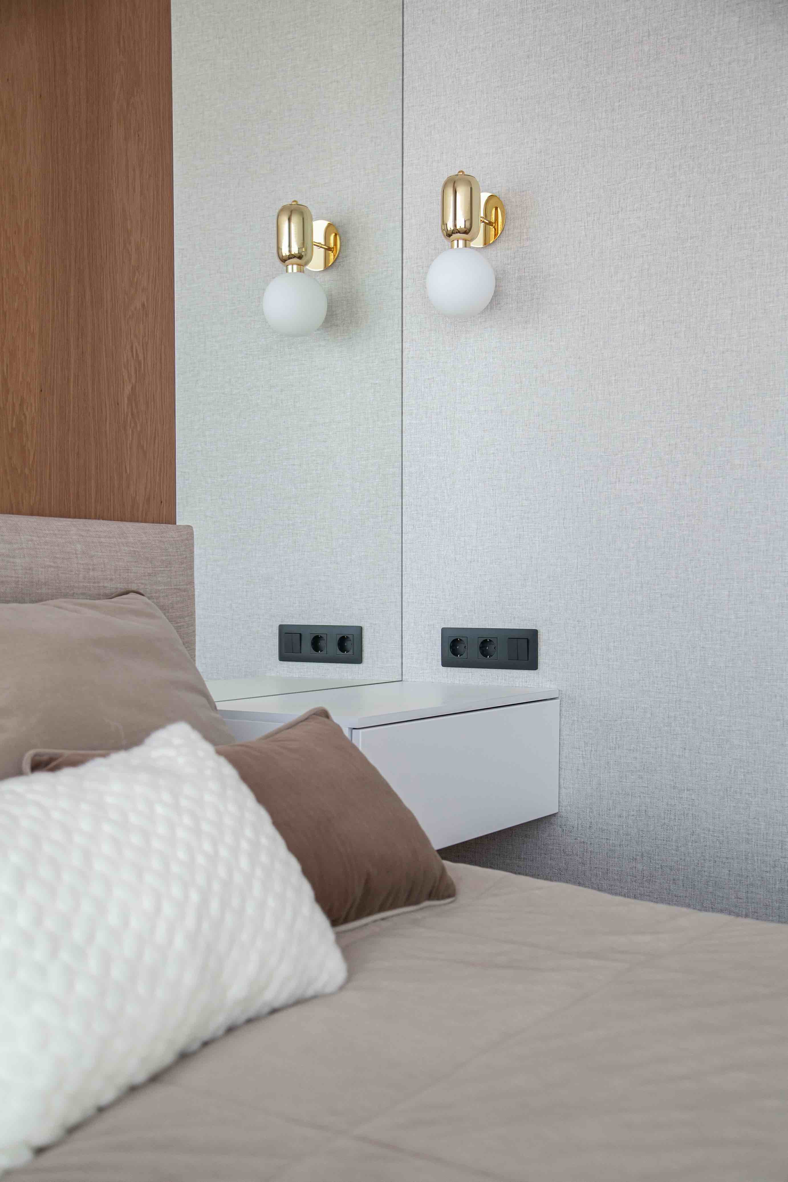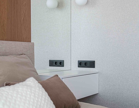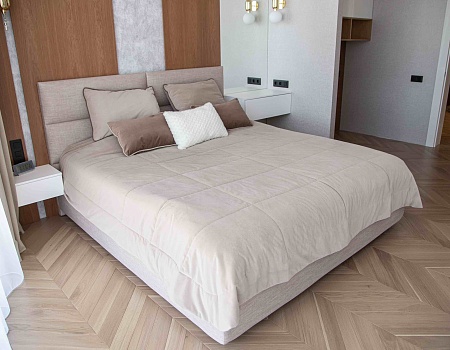 Площадь спальной комнаты — 24,7 м2, изначально от застройщика это была гостиная. Здесь выделили место для гардеробной, площадь ее составила 3,9 м2, в нее установили стеклянную раздвижную дверь Sofia. Также в спальне выделили рабочую зону, которую отделили перегородкой от спального места. В отделке стен используем обои, декоративную штукатурку и шпонированные панели. В качестве отопительных приборов также используем внутрипольный конвектор радиальной формы, который полностью повторяет контур остекления, а также вертикальный трубчатый радиатор. Напольное покрытие в спальне — инженерная доска в раскладке «французская елка».