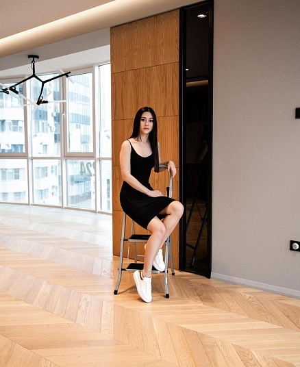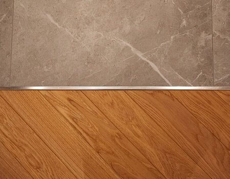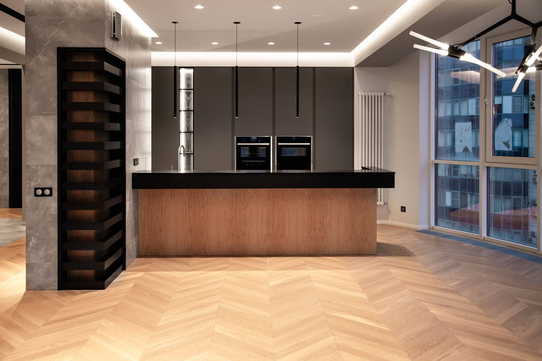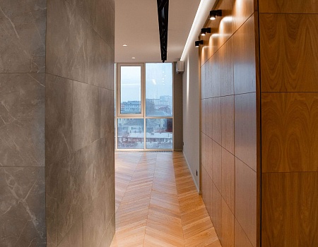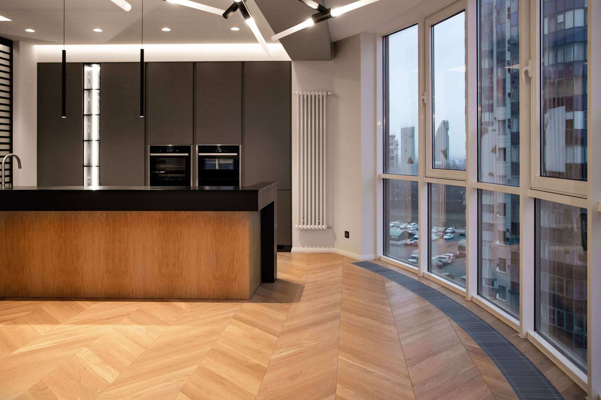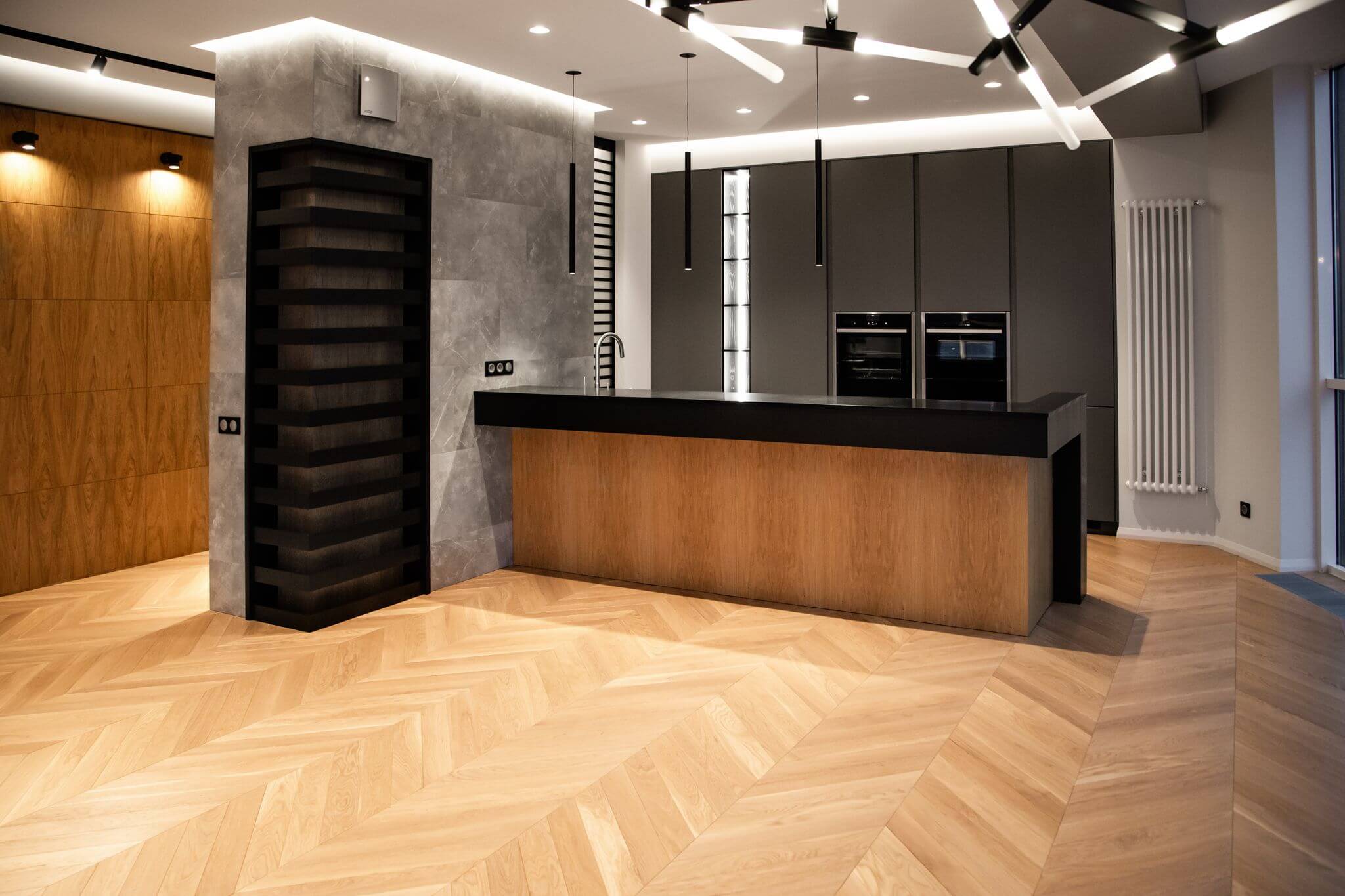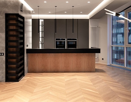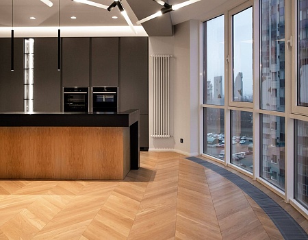 Напольное покрытие — инженерная доска в рисунке «французская ёлка». Для более эстетичного вида между стыком доски и керамогранита установлен п-образный профиль из полированного алюминия, а примыкание доски и внутрипольного конвектора выполнено без зазоров и стыковочных планок.