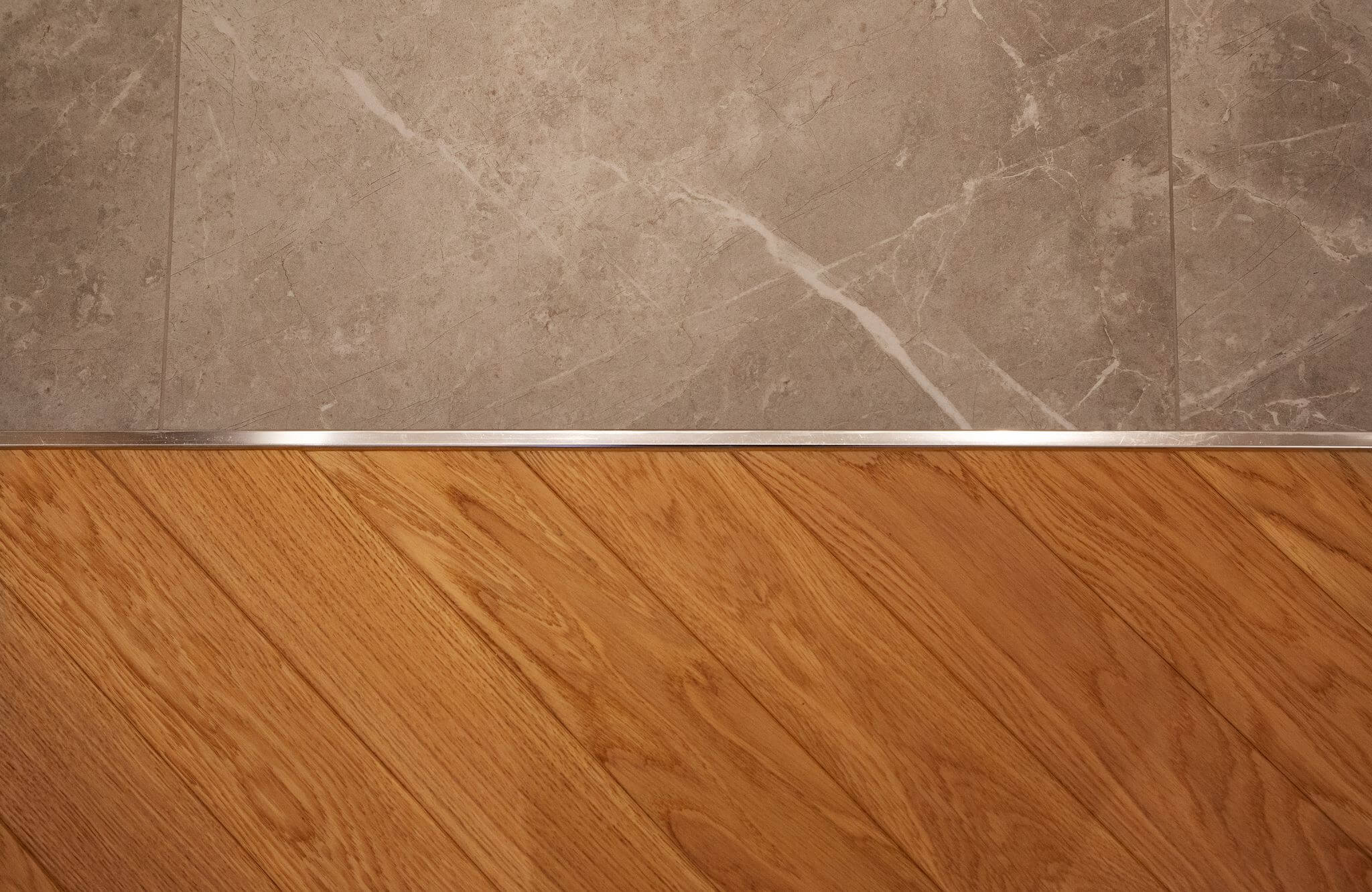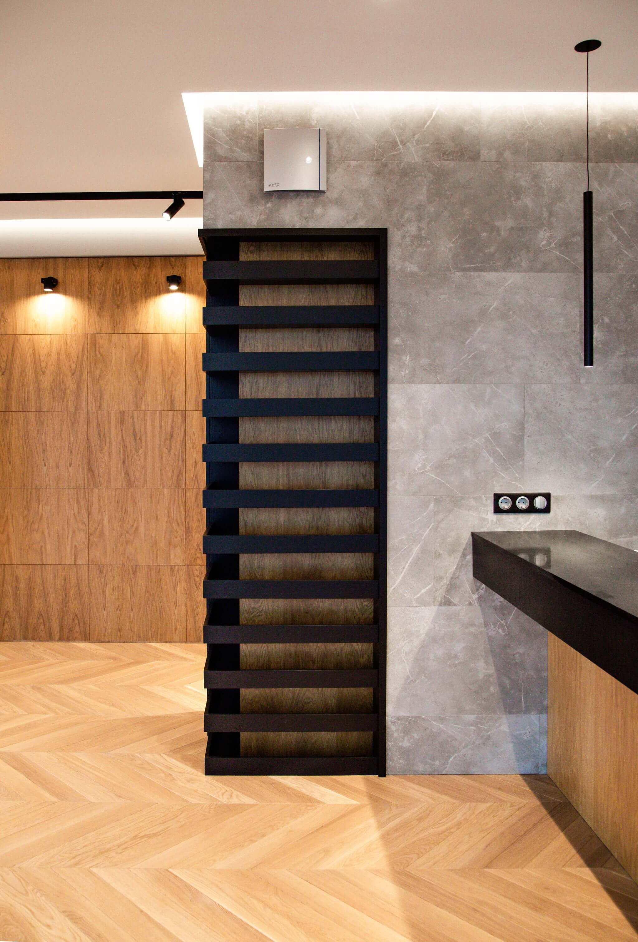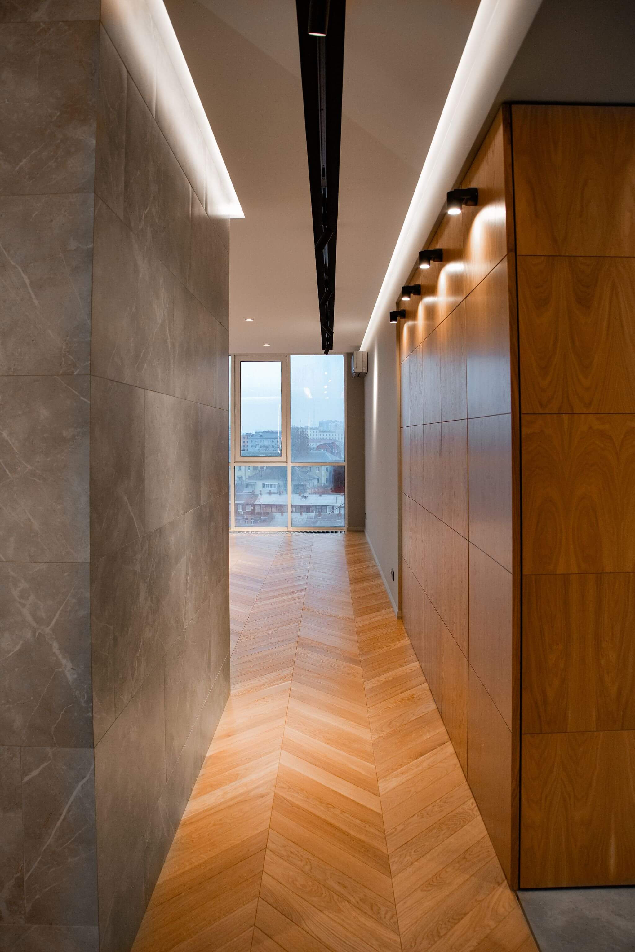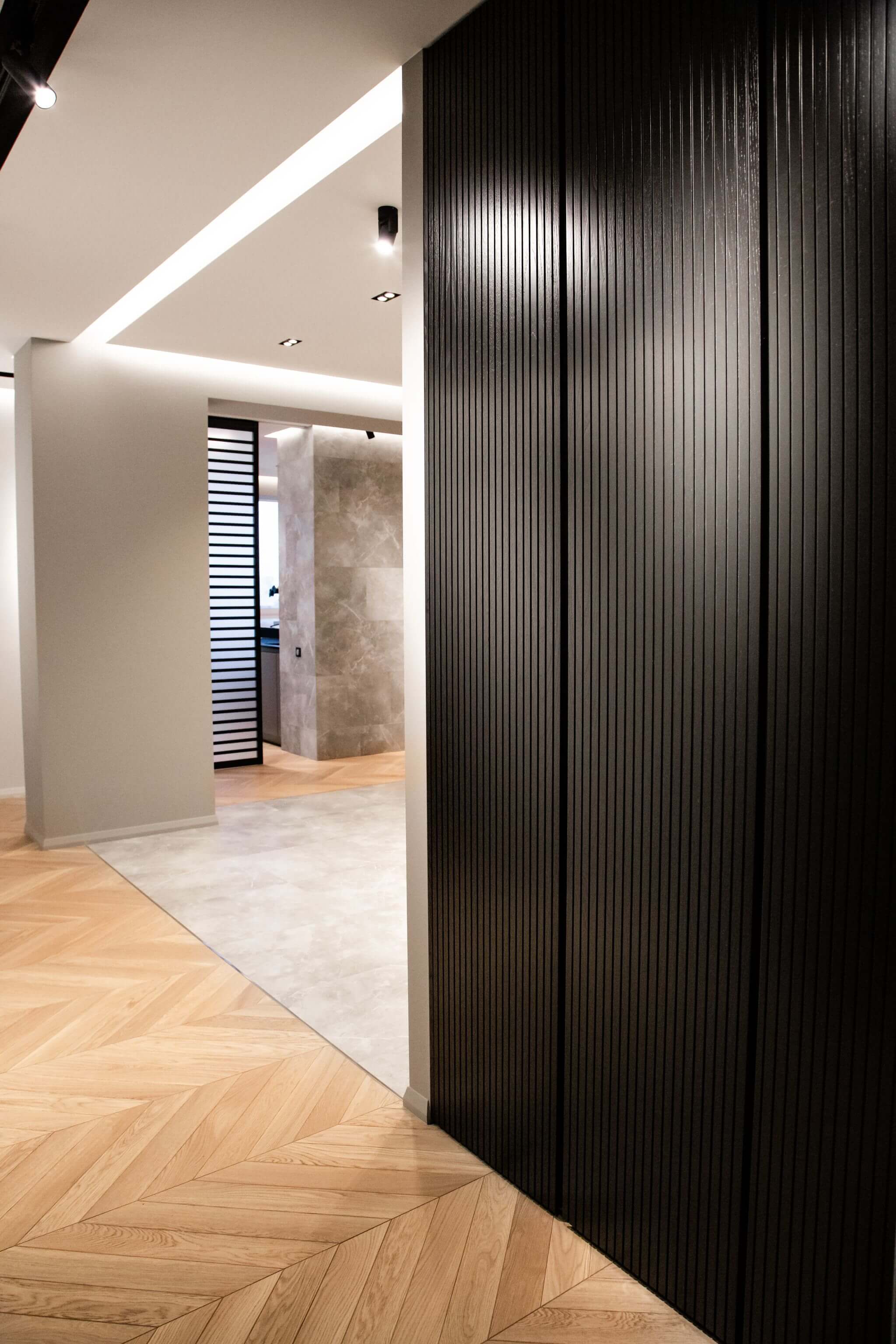 Напольное покрытие — инженерная доска в рисунке «французская ёлка». Для более эстетичного вида между стыком доски и керамогранита установлен п-образный профиль из полированного алюминия, а примыкание доски и внутрипольного конвектора выполнено без зазоров и стыковочных планок.