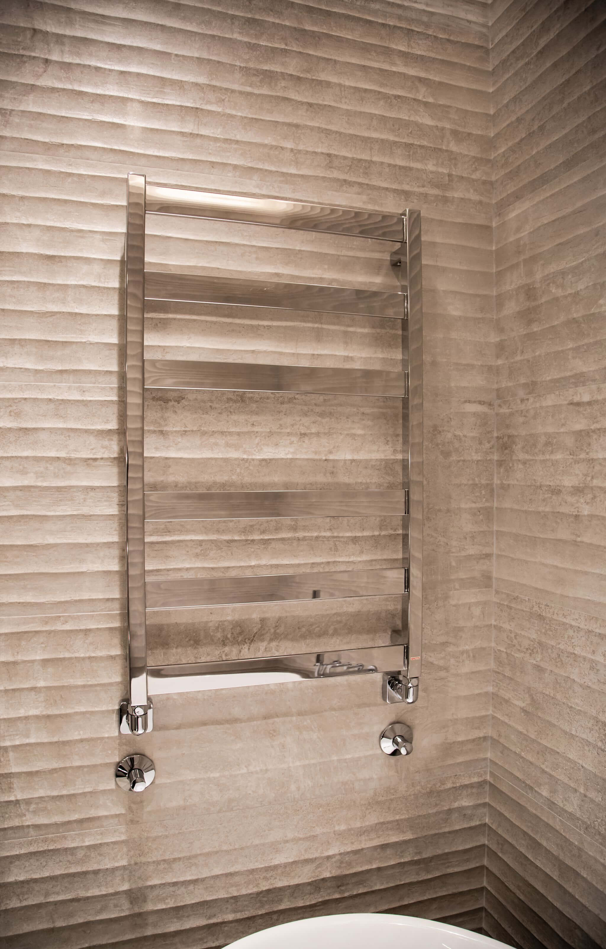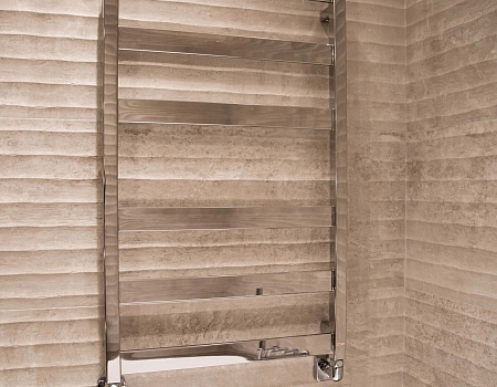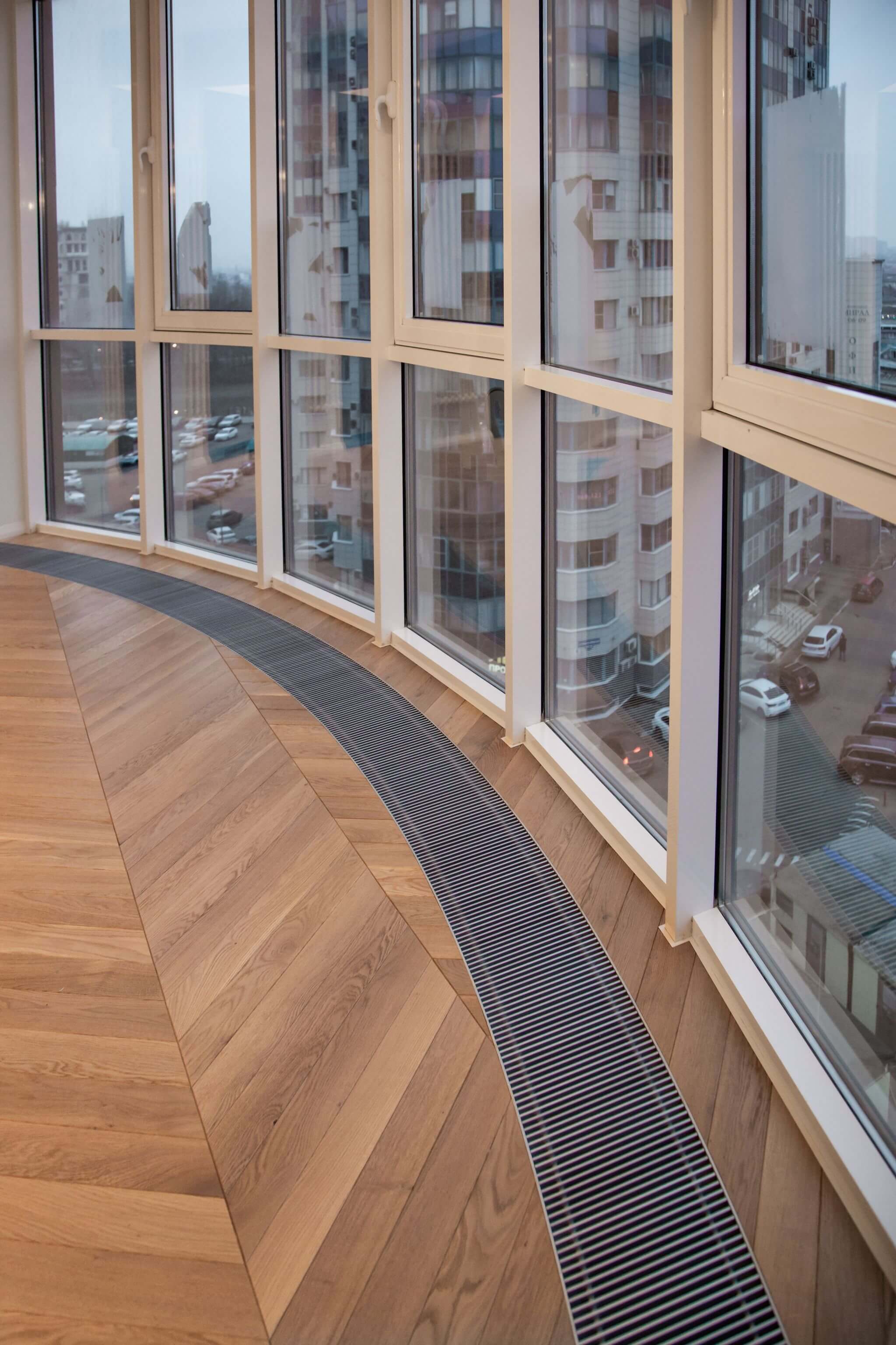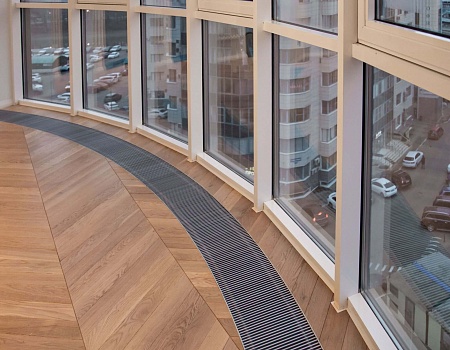 Также нами были установлены внутрипольные конвекторы: один из них радиальный и полностью повторяет изогнутый контур остекления. Дополнительную мощность для отопления мы добавили вертикальными трубчатыми радиаторами.