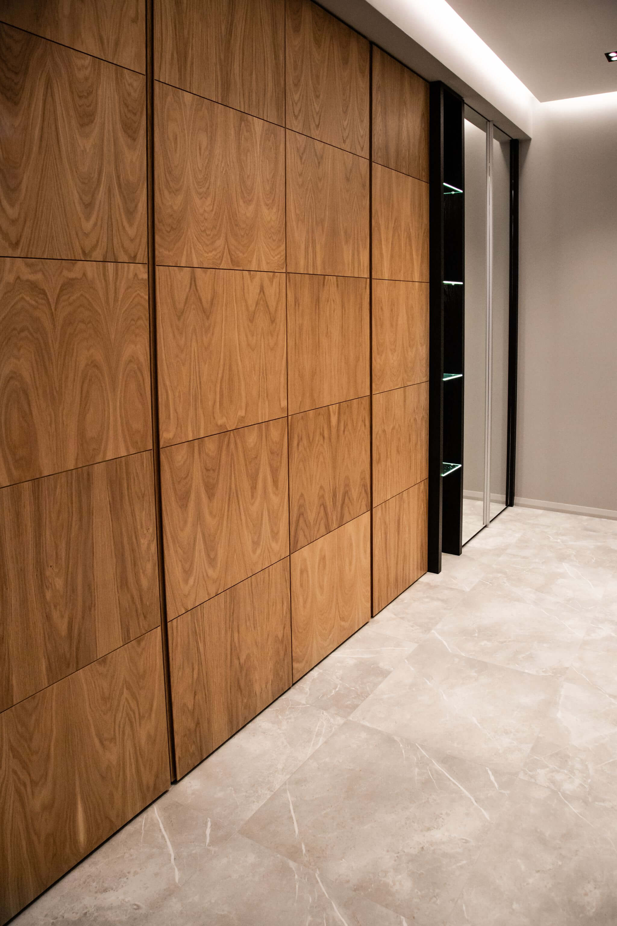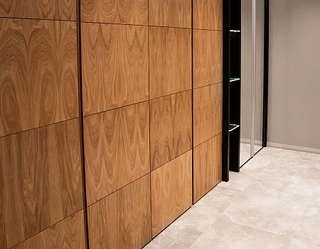 Спальную комнату мы объединили с балконом, а также опустили парапет балкона для большего проникновения естественного света. Для хранения вещей мы создали две большие гардеробные с раздвижными дверьми из массива дерева. В отделке стен использовали крупноформатный керамогранит.