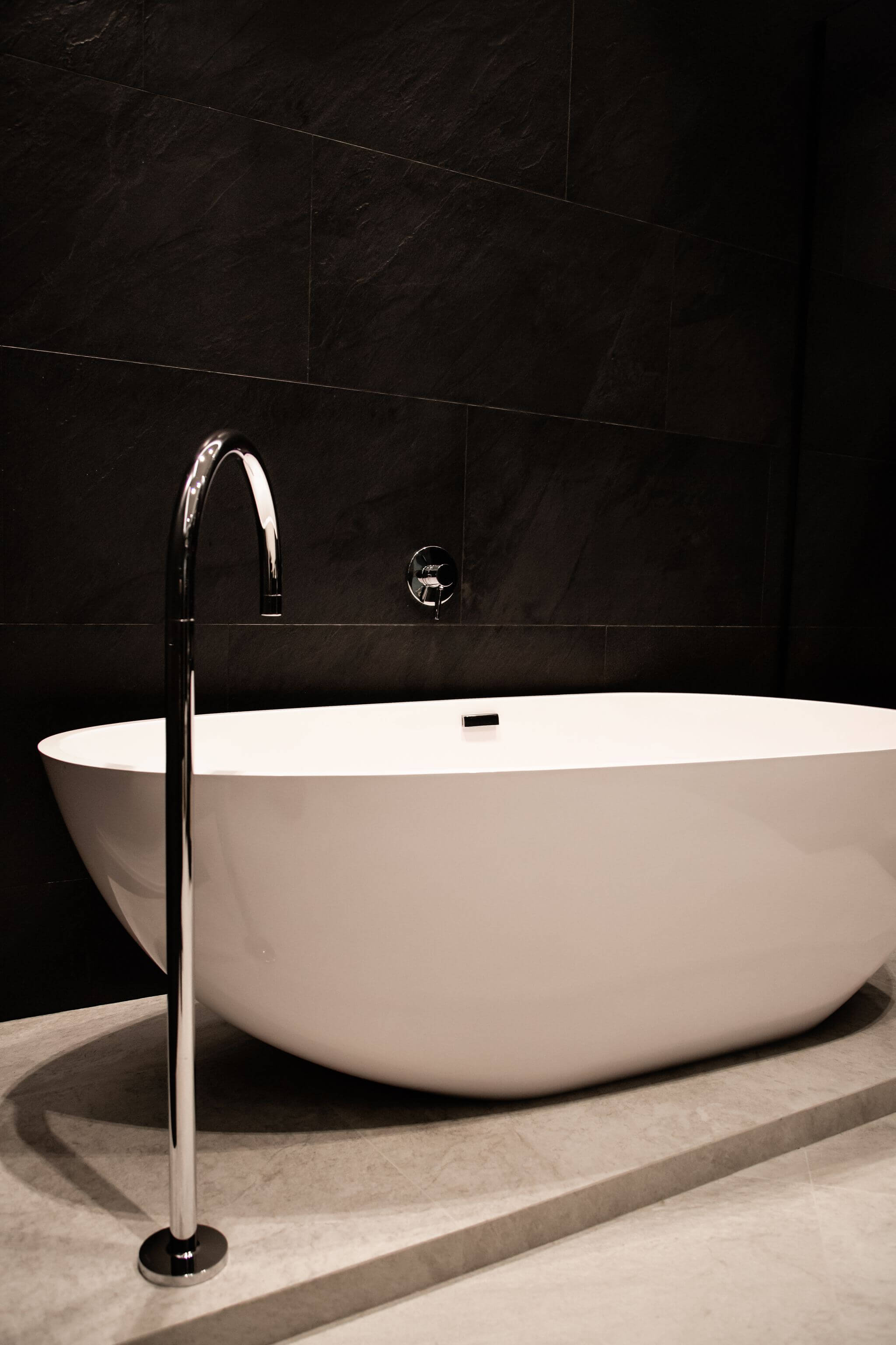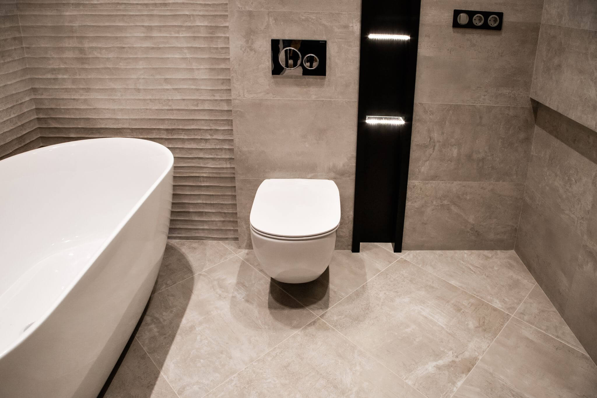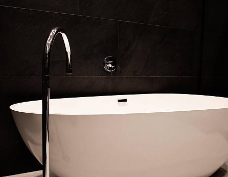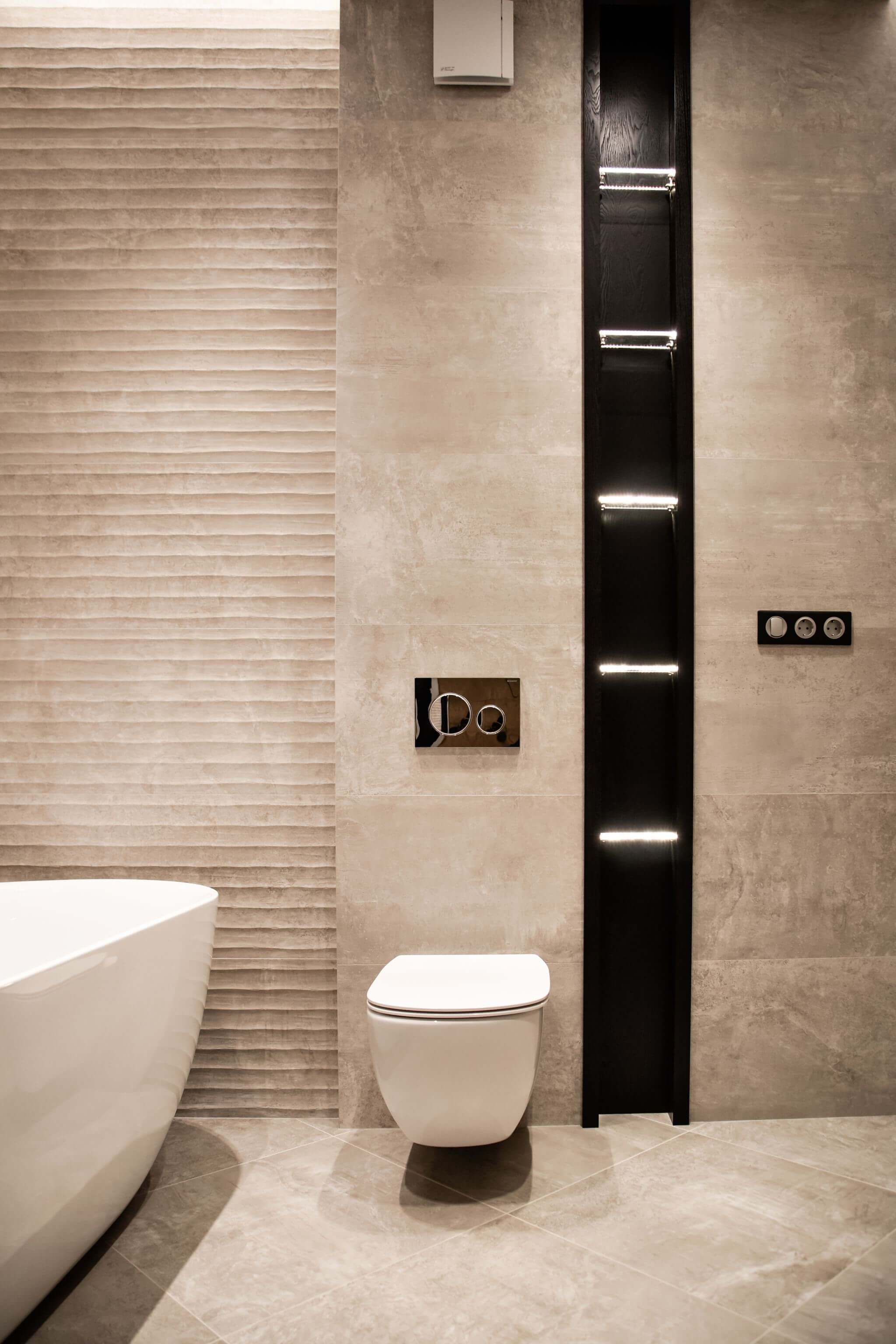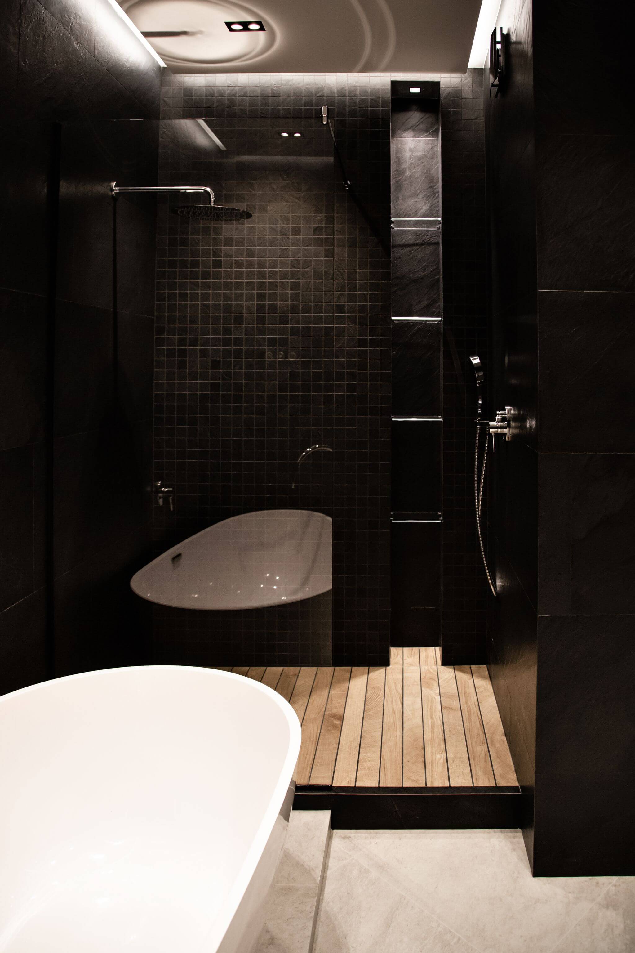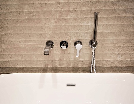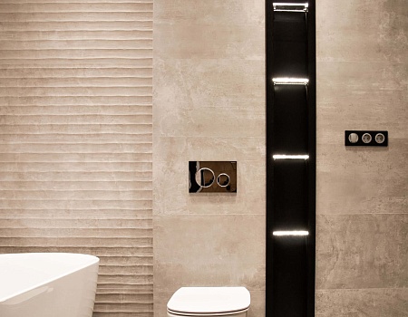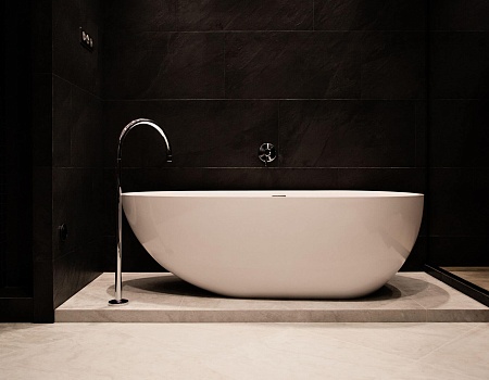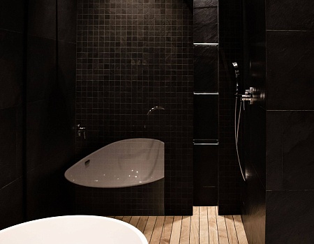В главной ванной комнате установили отдельно стоящую ванную из литьевого камня, а для подводки коммуникаций к ней изготовили подиум. Все смесители итальянской фабрики Zucchetti встроенные в стены. Также изготовили душевой поддон в строительном исполнении. Одна из стен рядом с ванной наружняя, в нее вмонтировали «тёплый пол» для дополнительного источника тепла. Столешница выполнена из термодревесины с двумя встроенными раковинами.