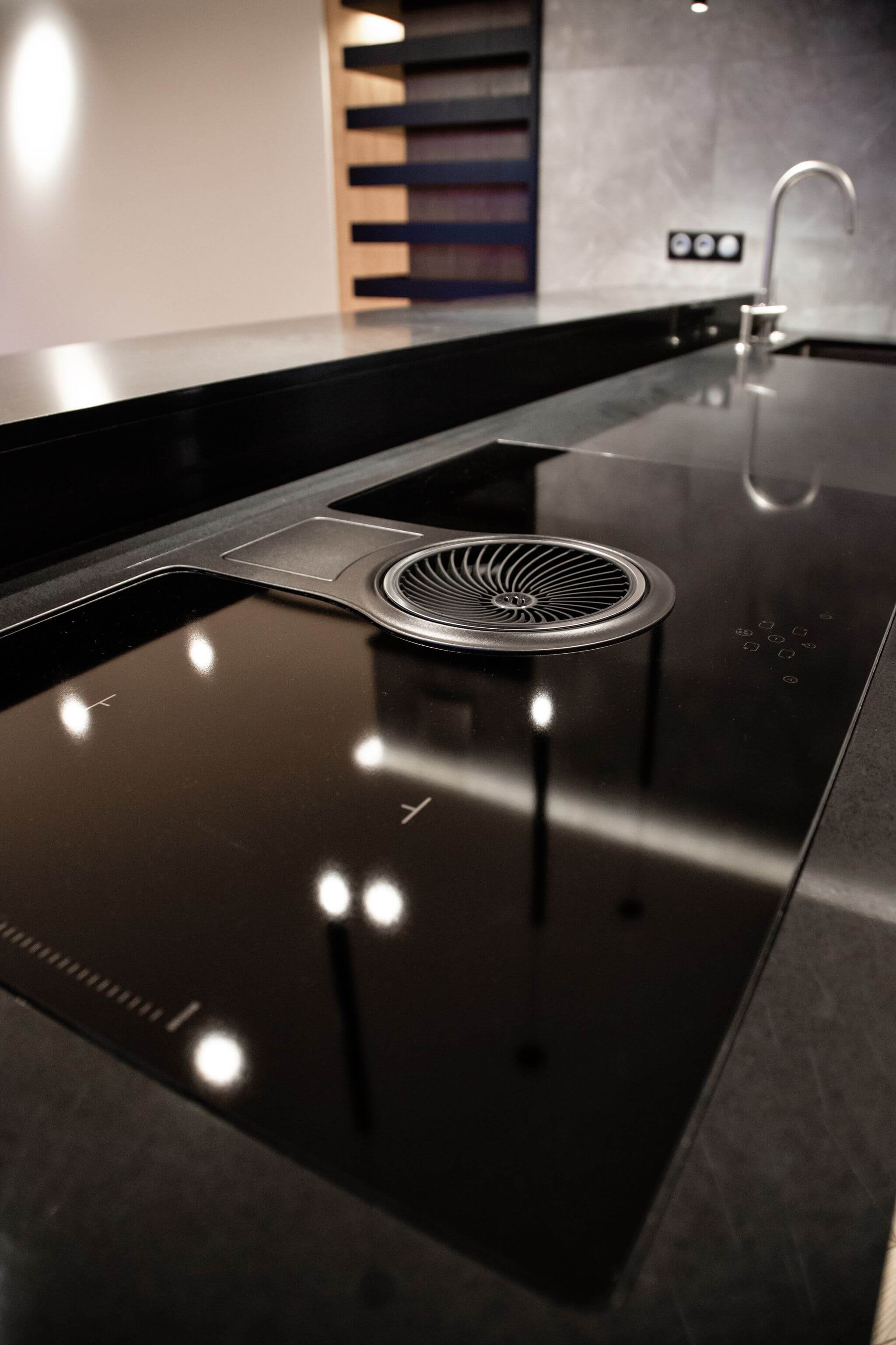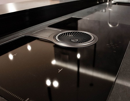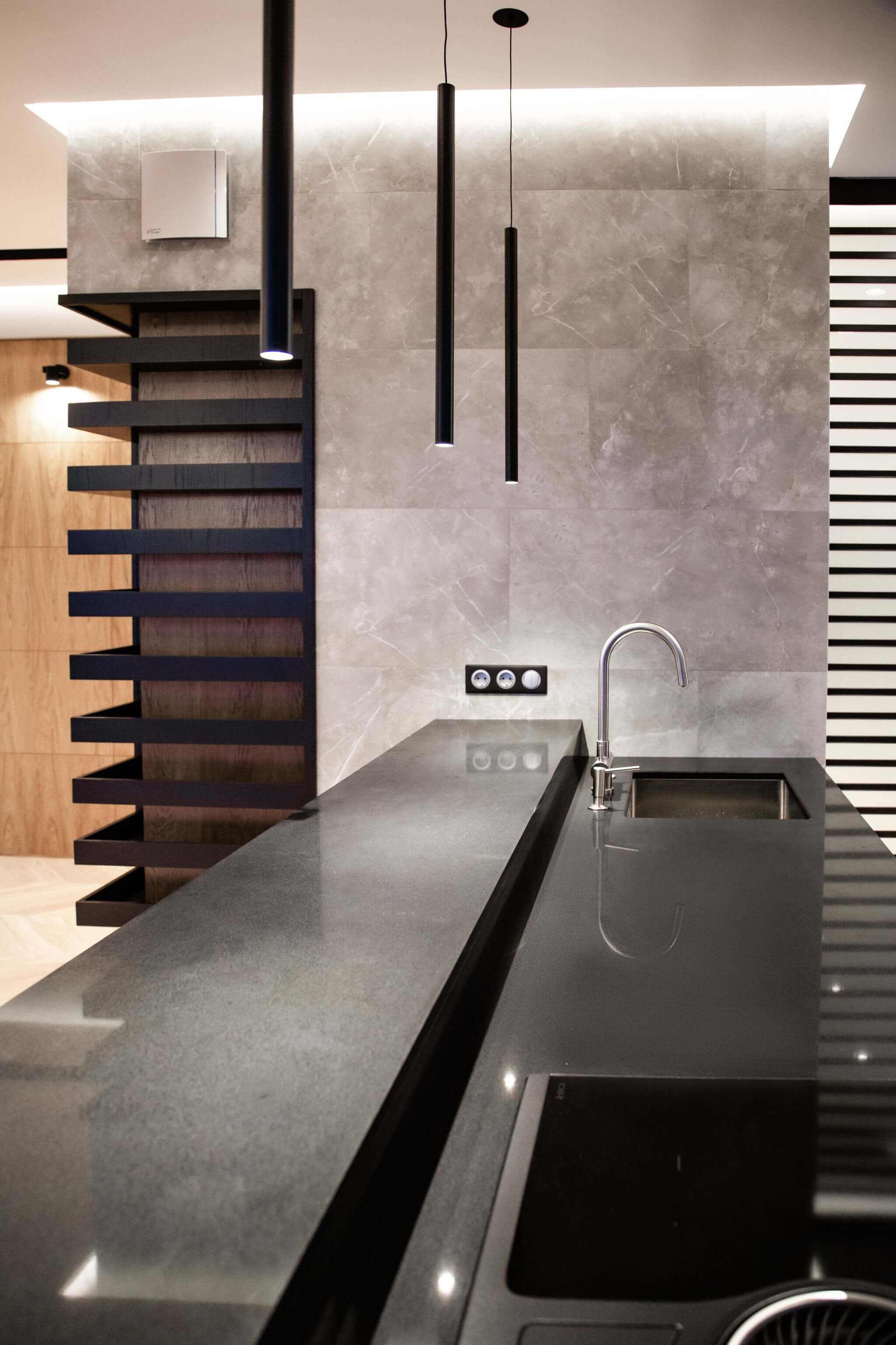 На кухне установлена нестандартная варочная панель с интегрированной вытяжкой. Для придания функциональности коробу с коммуникациями была изготовлена оригинальная полка для хранения вина.