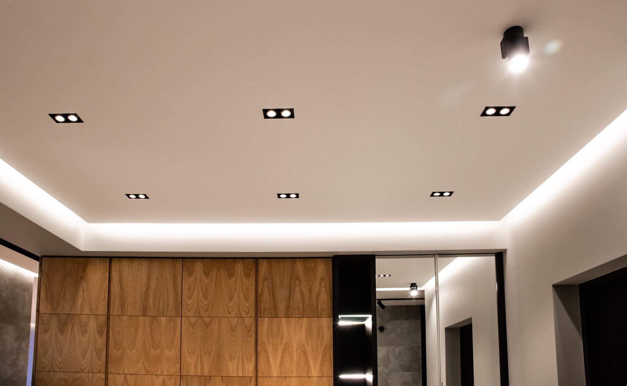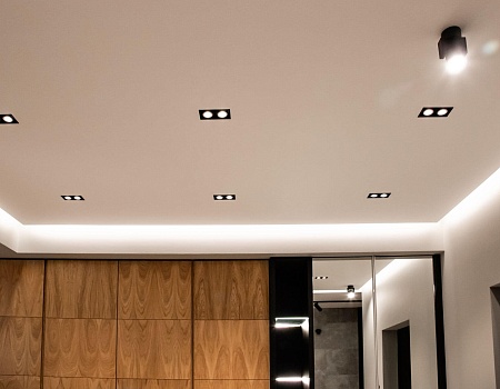 Потолок во всей квартире выполнен из гипсокартона с нишами под шторы и светодиодную подсветку.