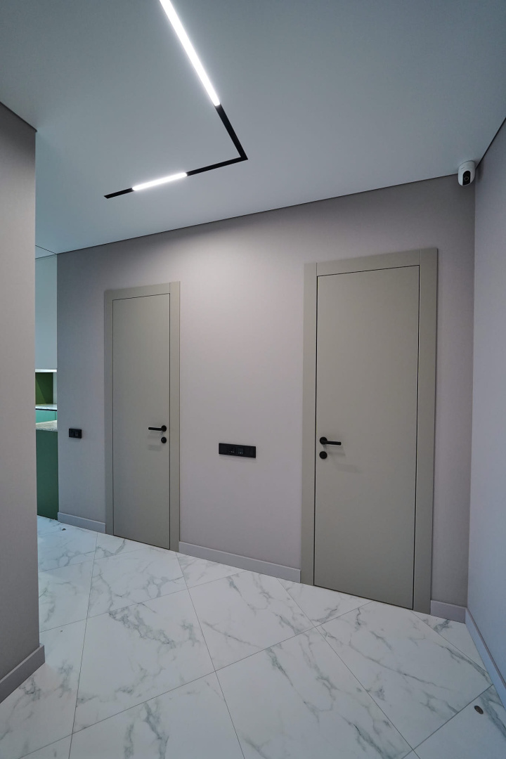 Скрытые двери, обилие белого цвета, трековый свет: проект в минимализме для ценителей современных интерьеров.