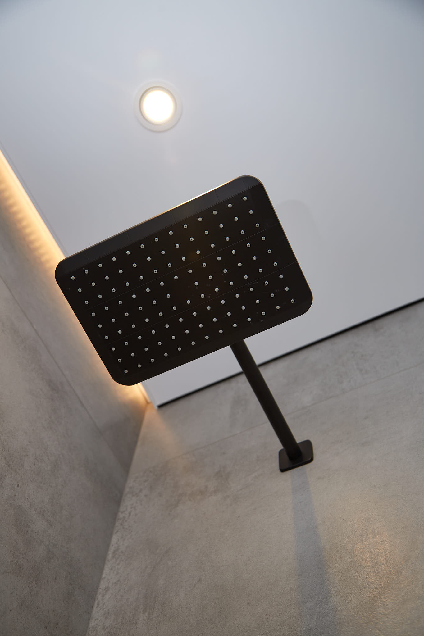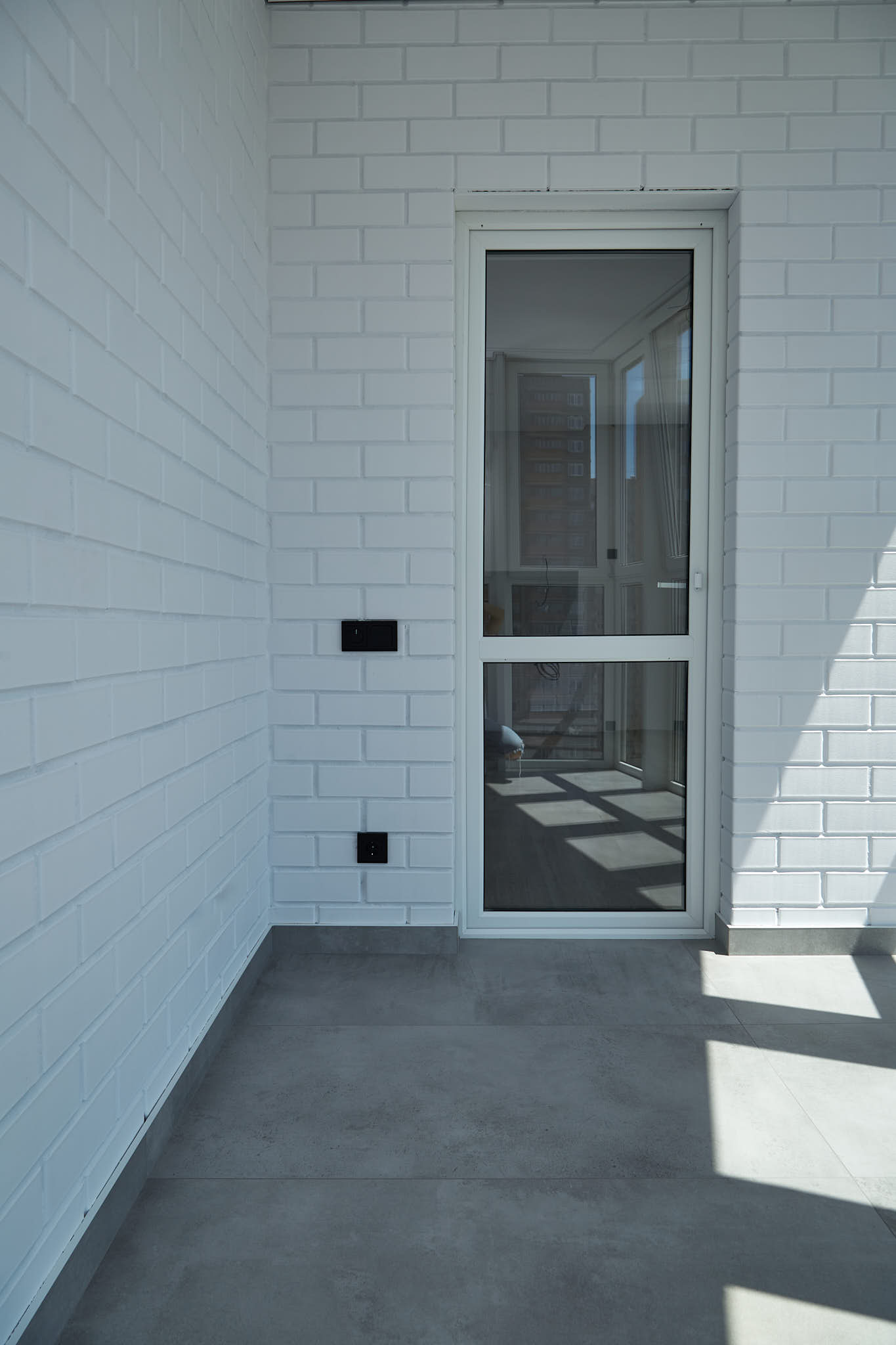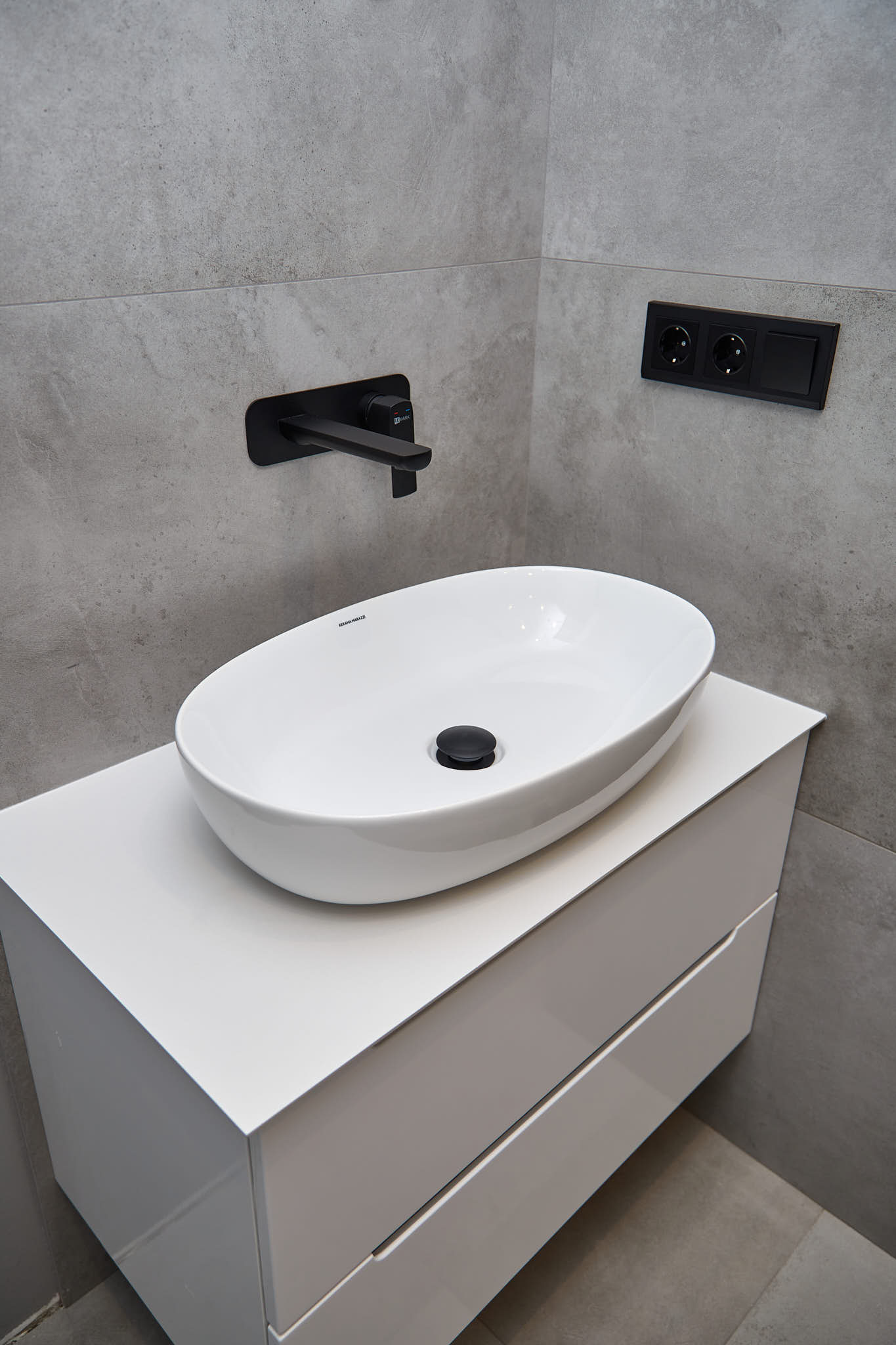 В спальной комнате выстроили перегородку из газобетонного блока под встроенный шкаф. В ванной установили инсталляцию с подвесным унитазом, над которым расположился узел учёта с вводными кранами, фильтрами и проточным водонагревателем. Дополнили пространство тумбой с накладной раковиной, электрическим полотенцесушителем со скрытым подключением, акриловой ванной и смесителями скрытого монтажа. Вывели коммуникации для стиральной и сушильной машин.