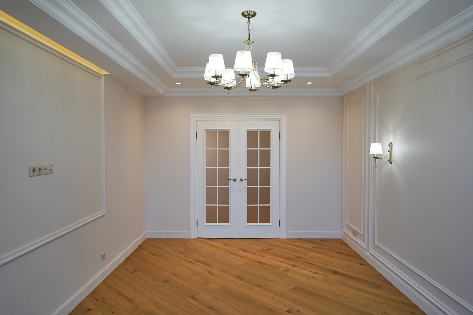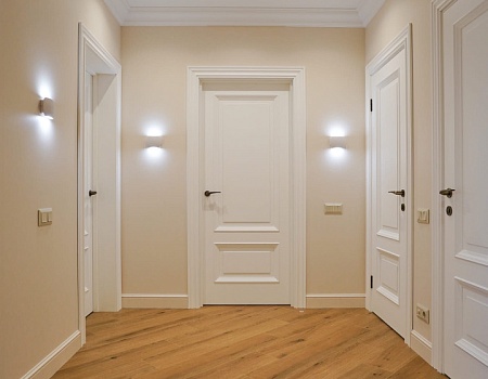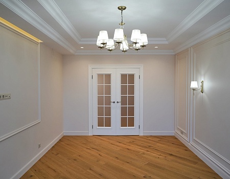Роскошная квартира в стиле "неоклассика" для молодой девушки. Настенные молдинги, потолочные карнизы, стены под окраску и инженерная доска.