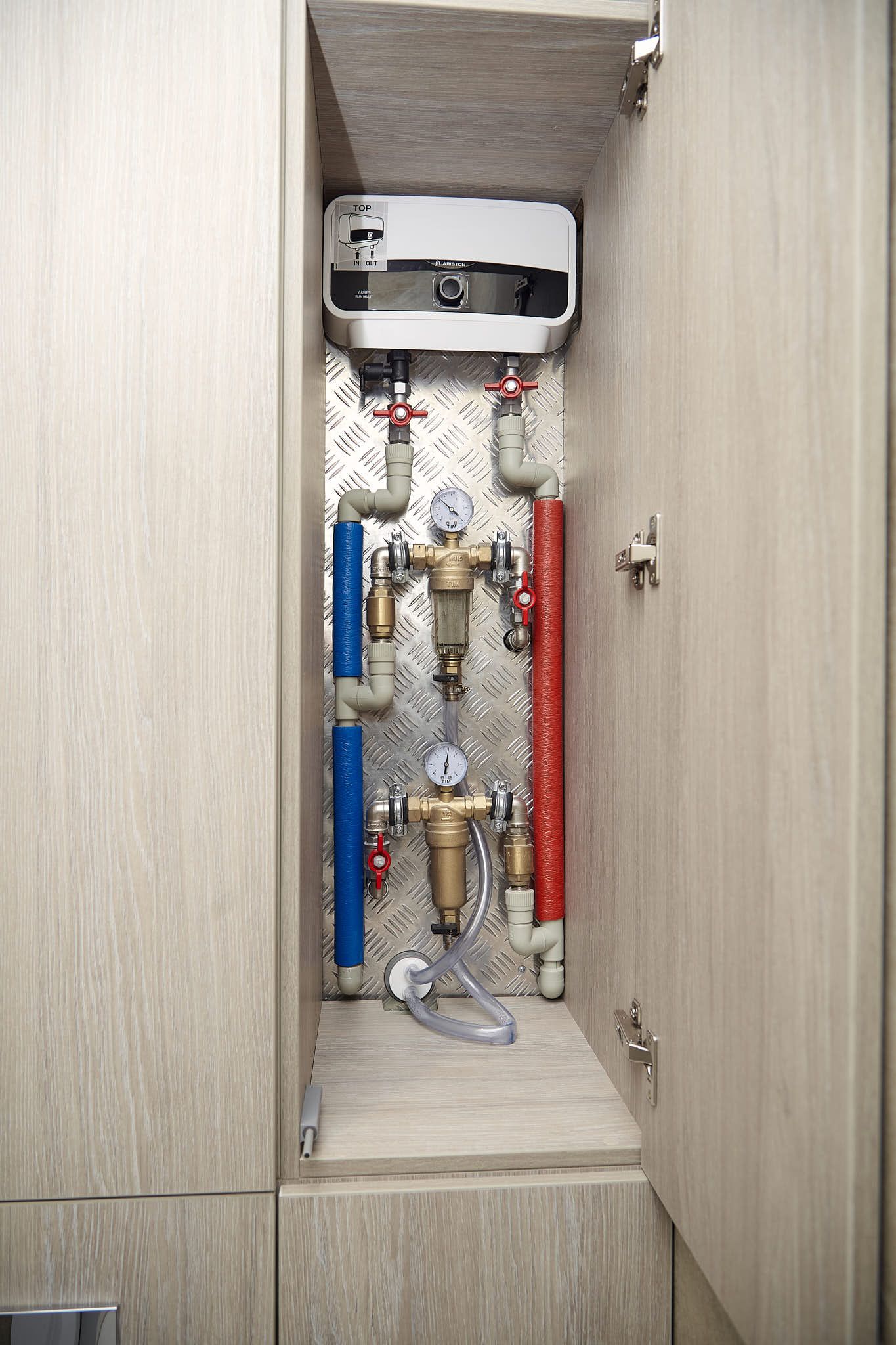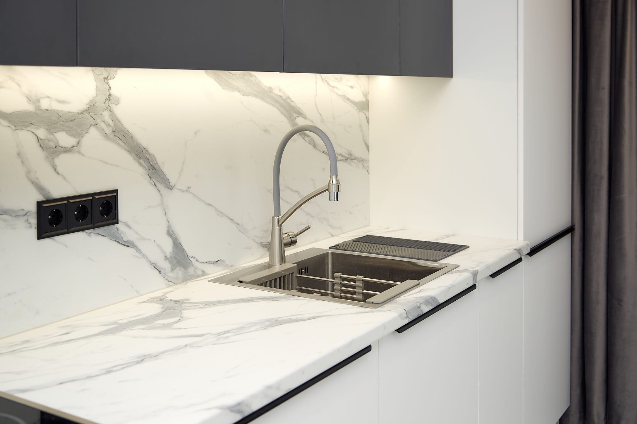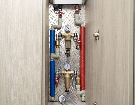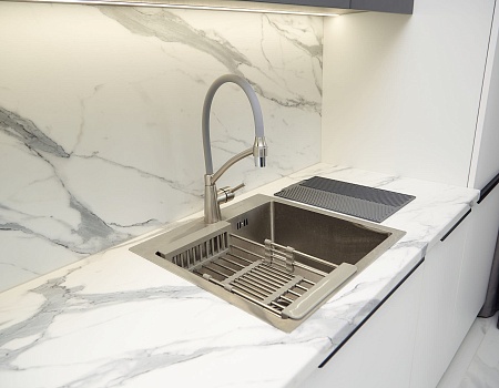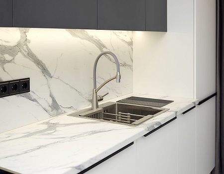 В кухне установили кухонный гарнитур от наших партнёров и подключили встроенную бытовую технику. Под мойкой расположили фильтры грубой очистки воды.