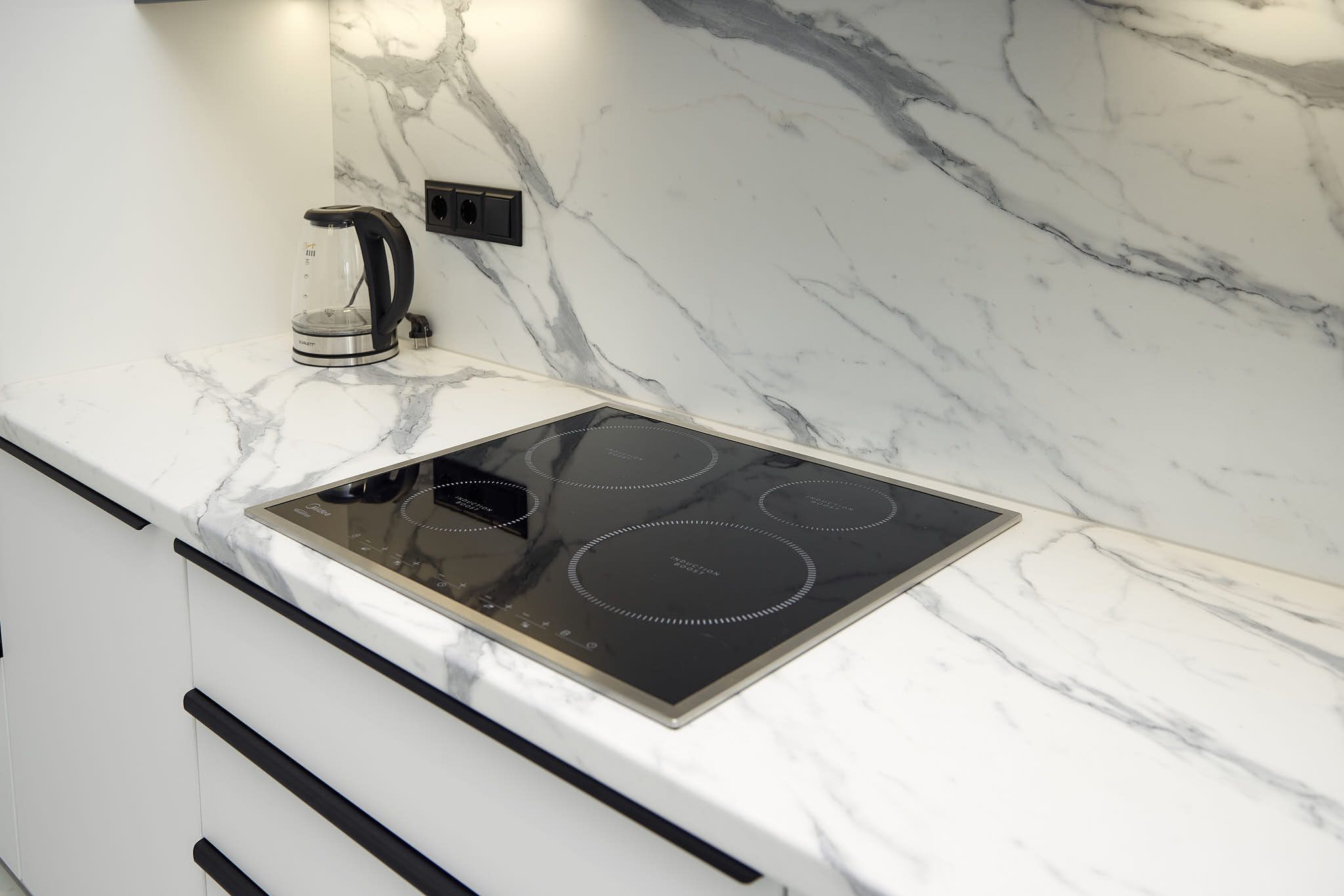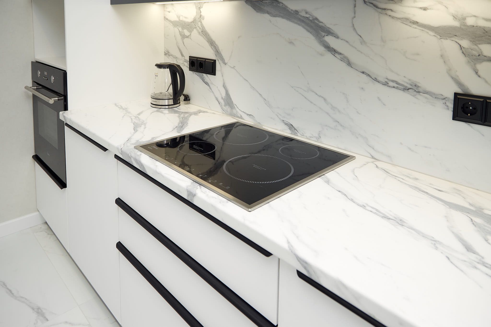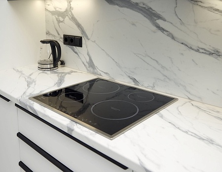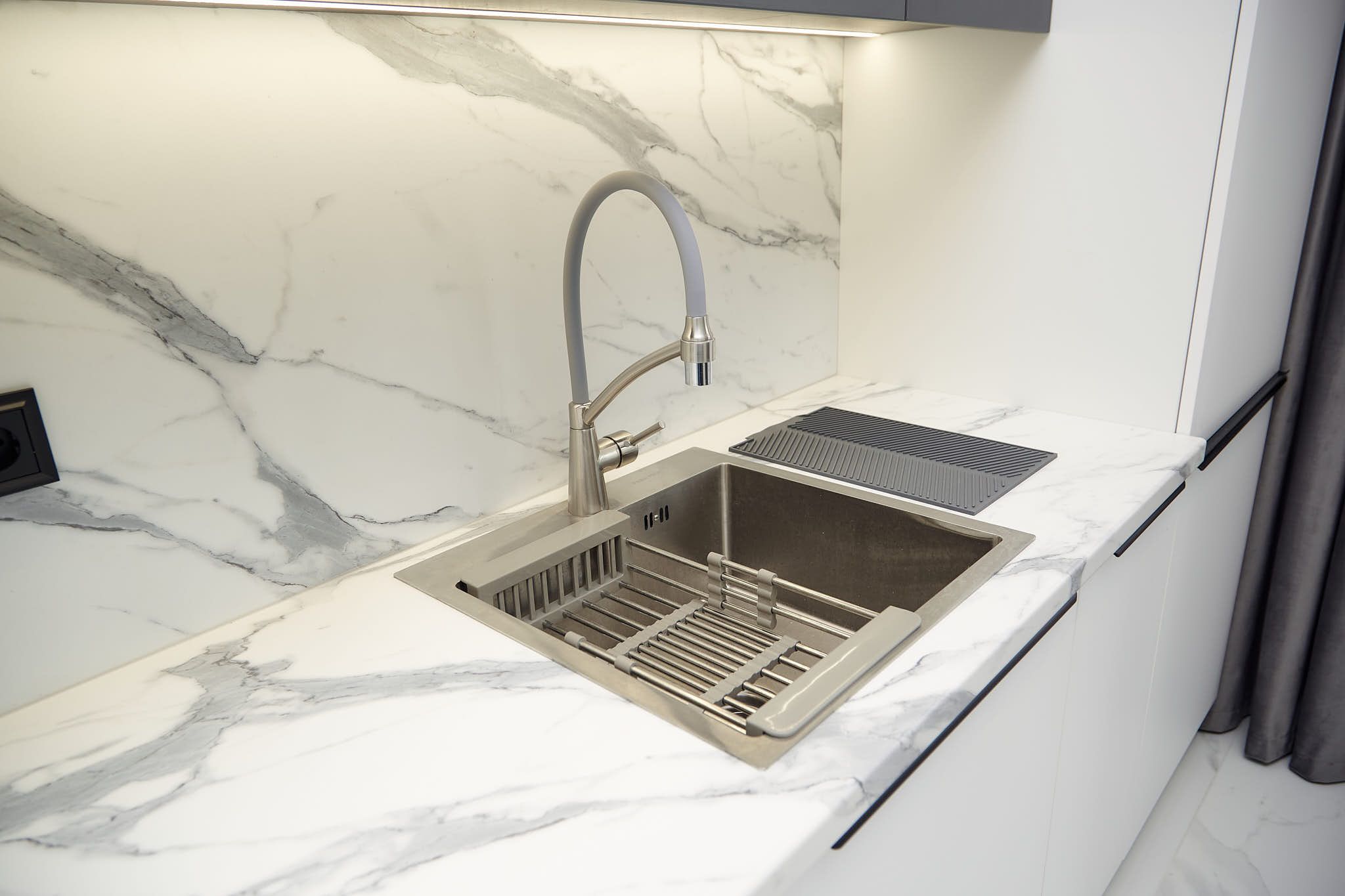 В кухне установили кухонный гарнитур от наших партнёров и подключили встроенную бытовую технику. Под мойкой расположили фильтры грубой очистки воды.