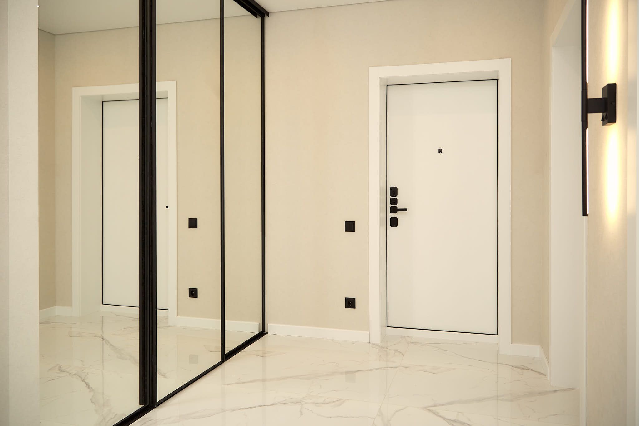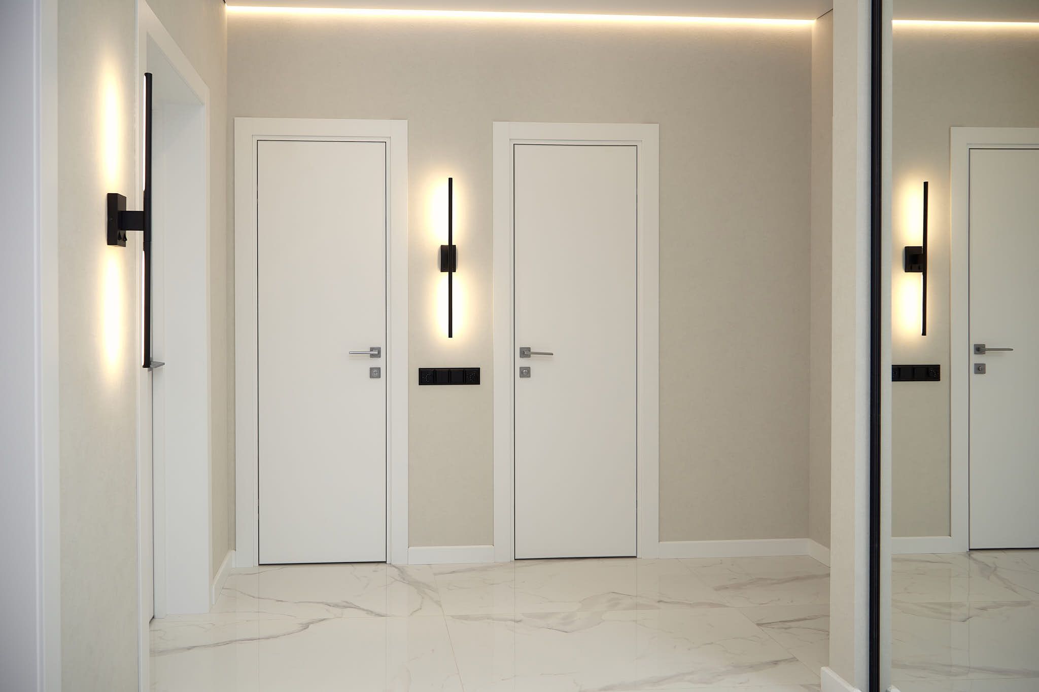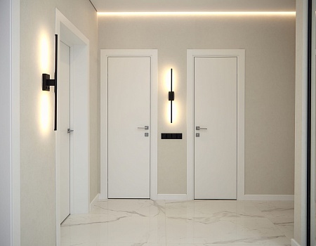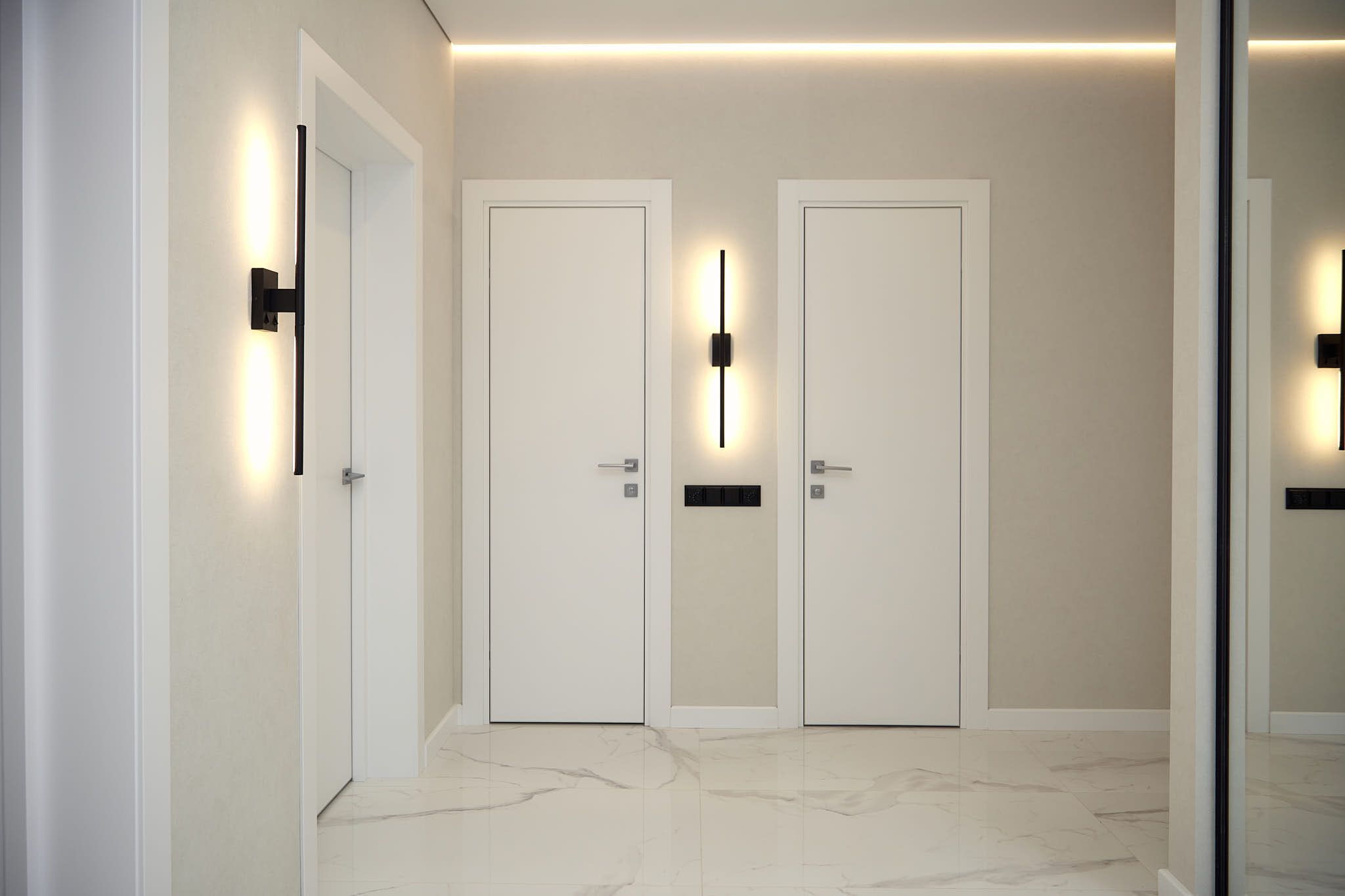 Заменили входную дверь от застройщика на стальную модель от бренда «Гардиан» с накладкой в цвет межкомнатных дверей. Межкомнатные двери от компании ProfilDoors. Обрамили дверной проем доборами и наличниками. Для освещения выбрали несколько групп света: люстры, точечные светильники, бра и светодиодную подсветку. Для радиаторов отопления выполнили перепланировку расположения ввода и заменили краны.