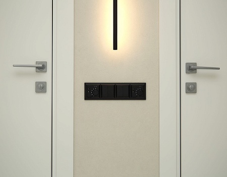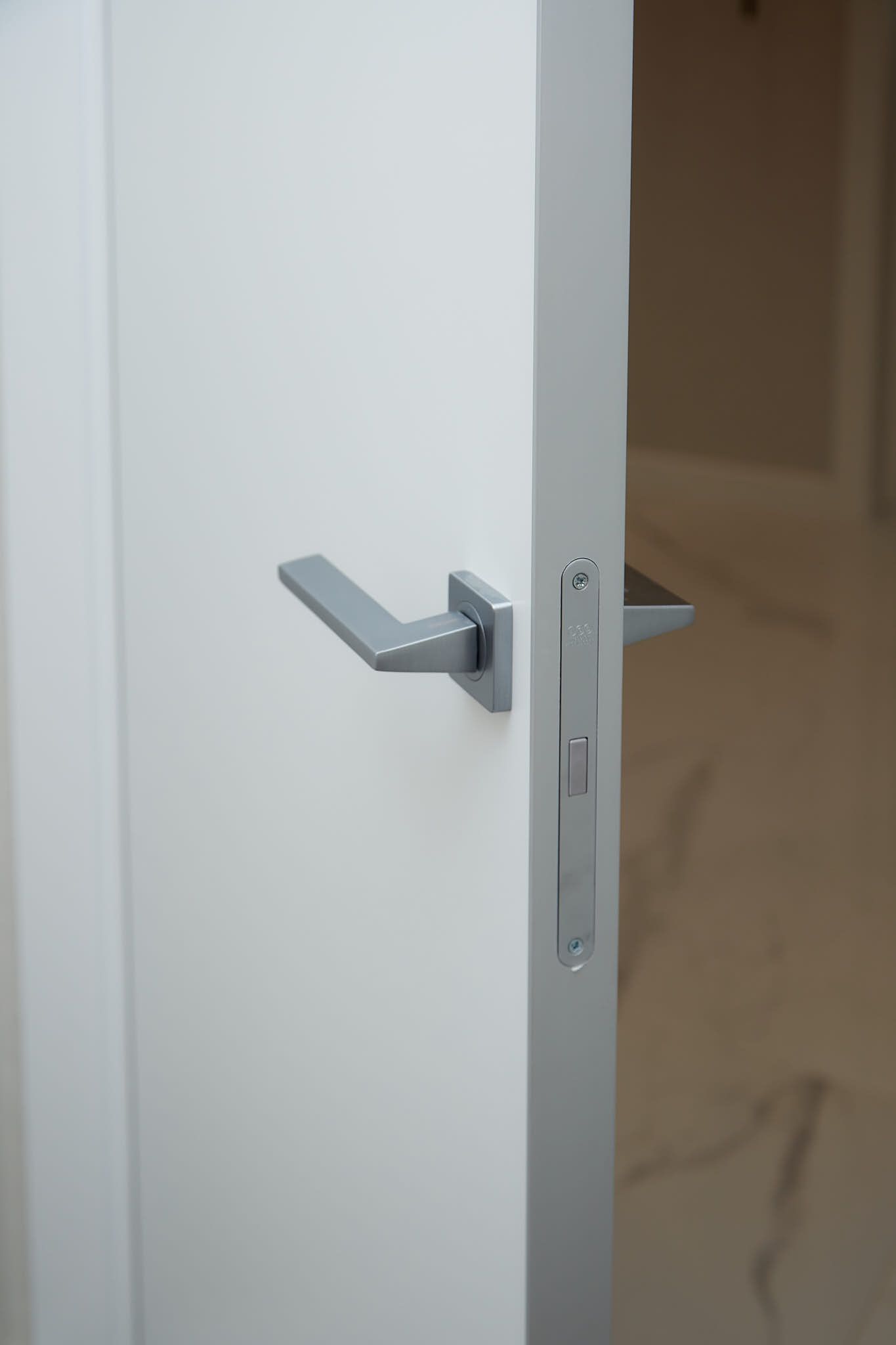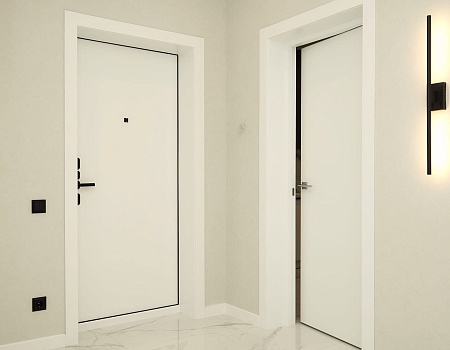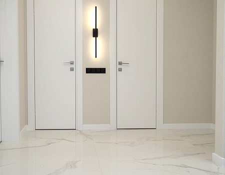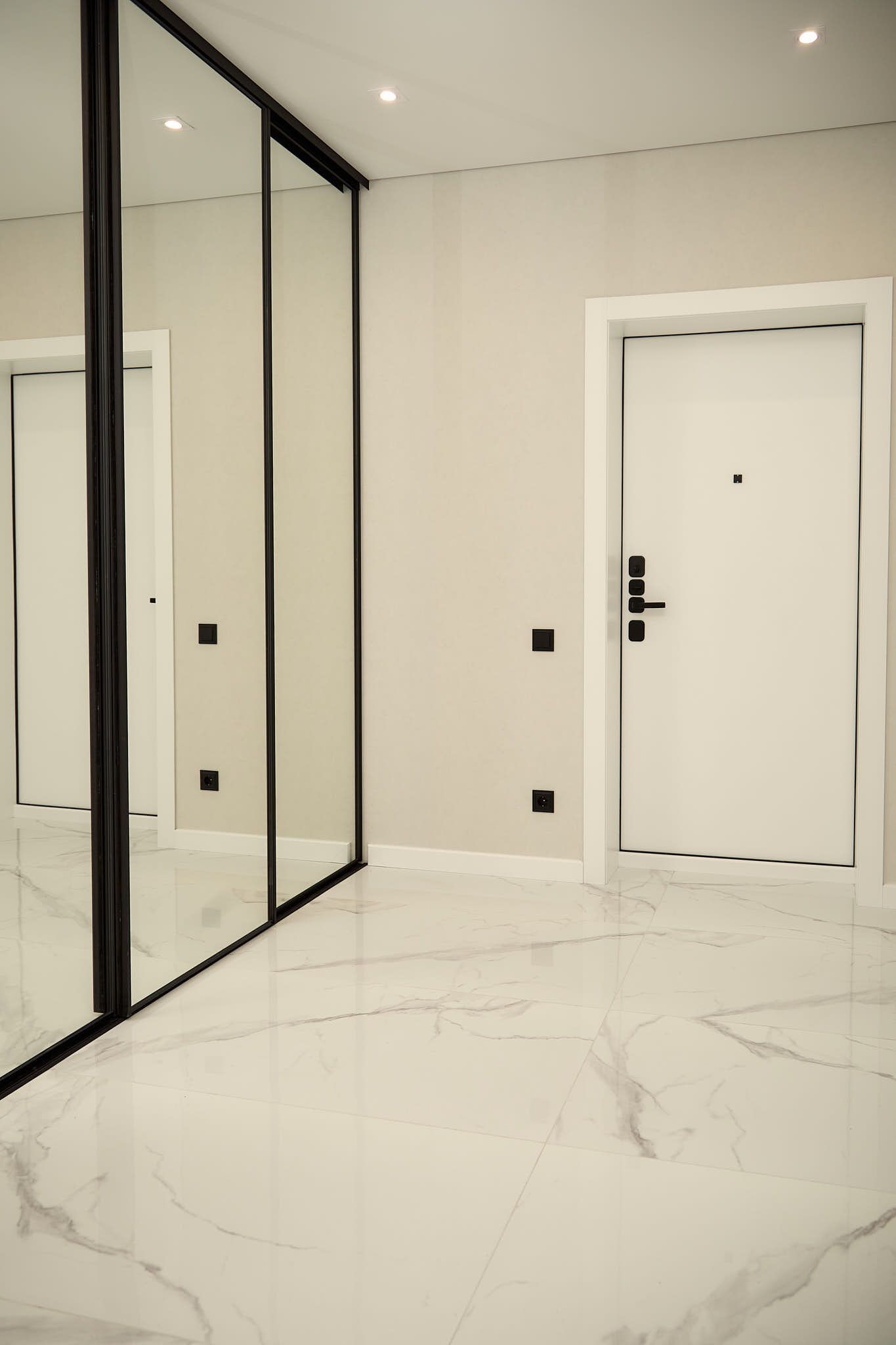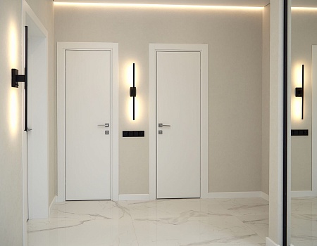Заменили входную дверь от застройщика на стальную модель от бренда «Гардиан» с накладкой в цвет межкомнатных дверей. Межкомнатные двери от компании ProfilDoors. Обрамили дверной проем доборами и наличниками. Для освещения выбрали несколько групп света: люстры, точечные светильники, бра и светодиодную подсветку. Для радиаторов отопления выполнили перепланировку расположения ввода и заменили краны.