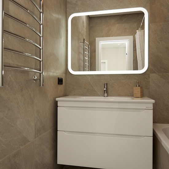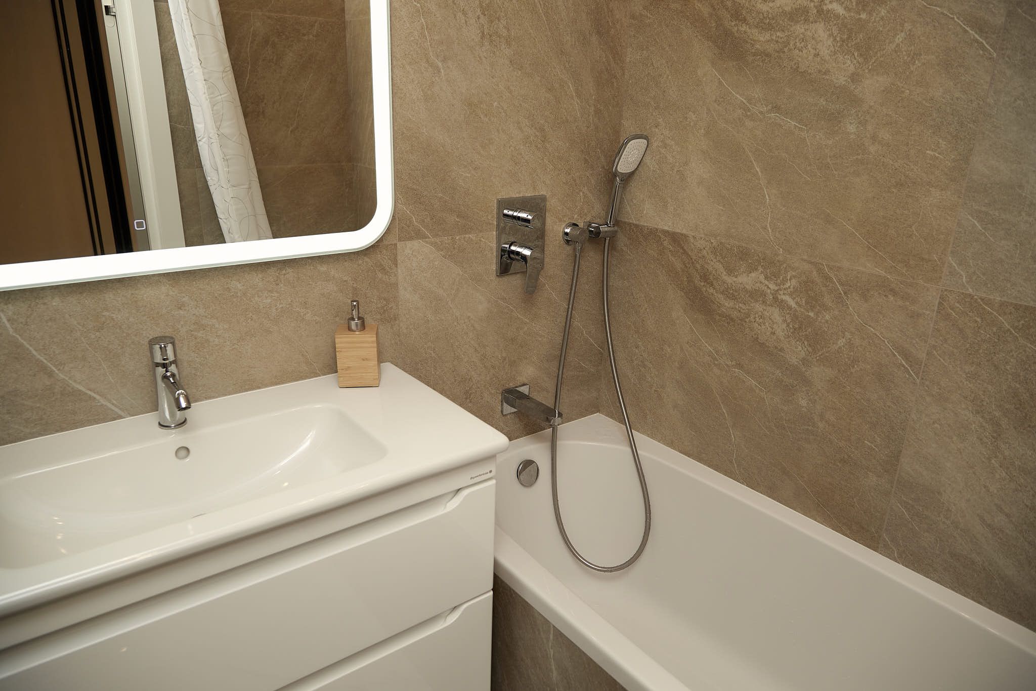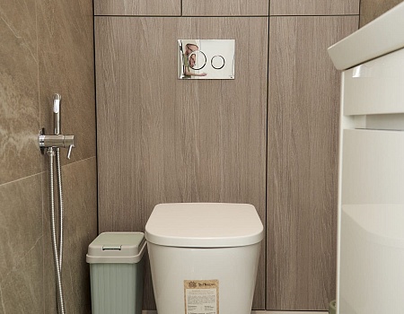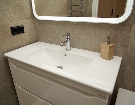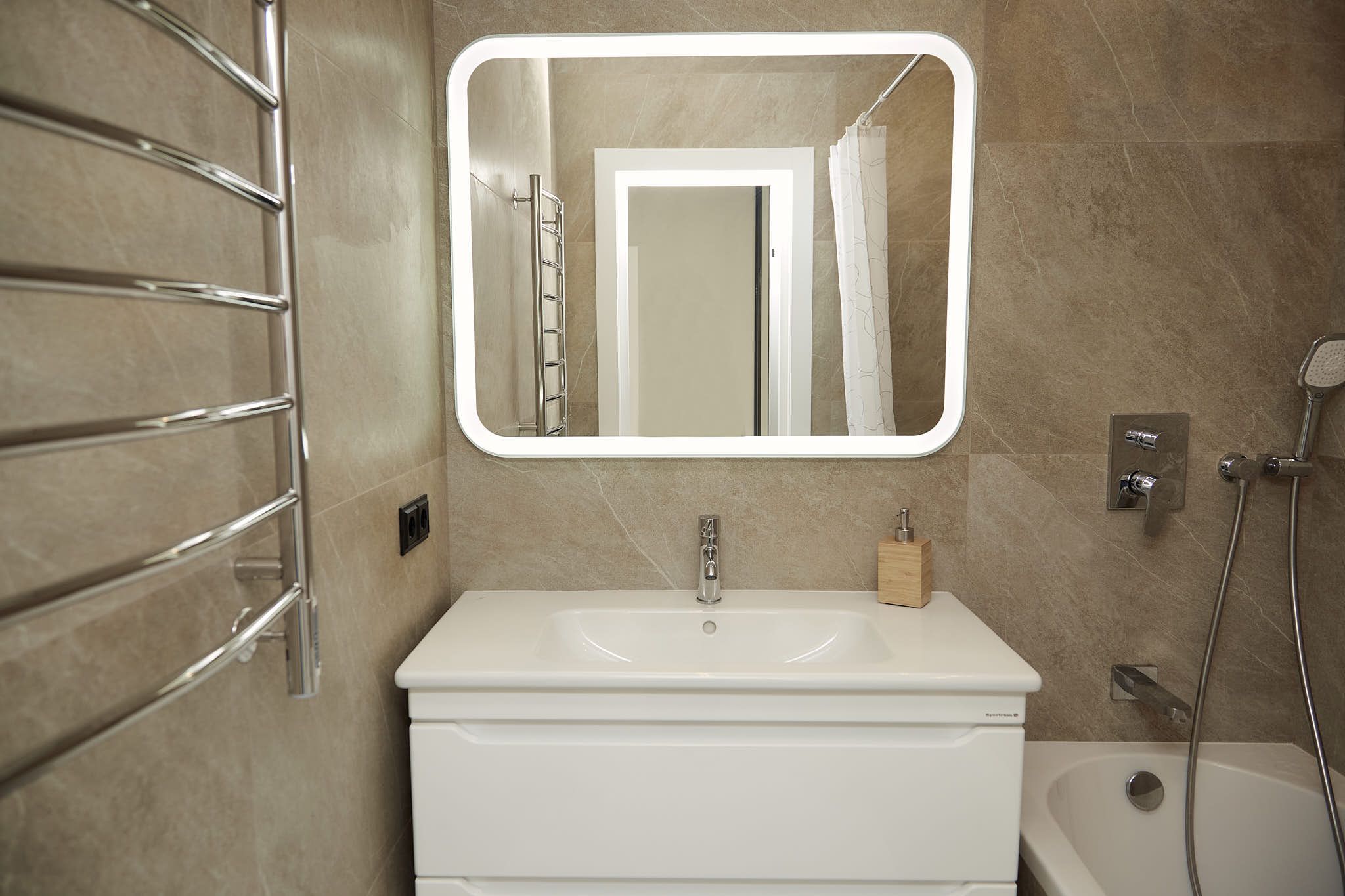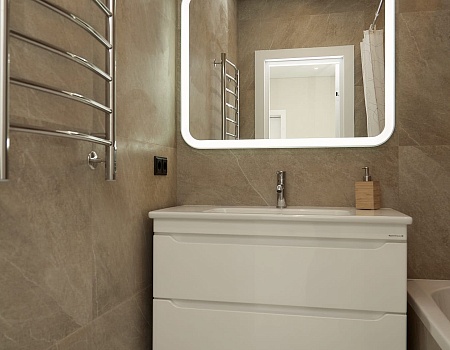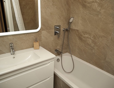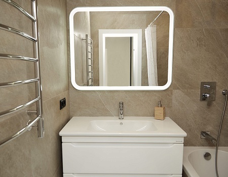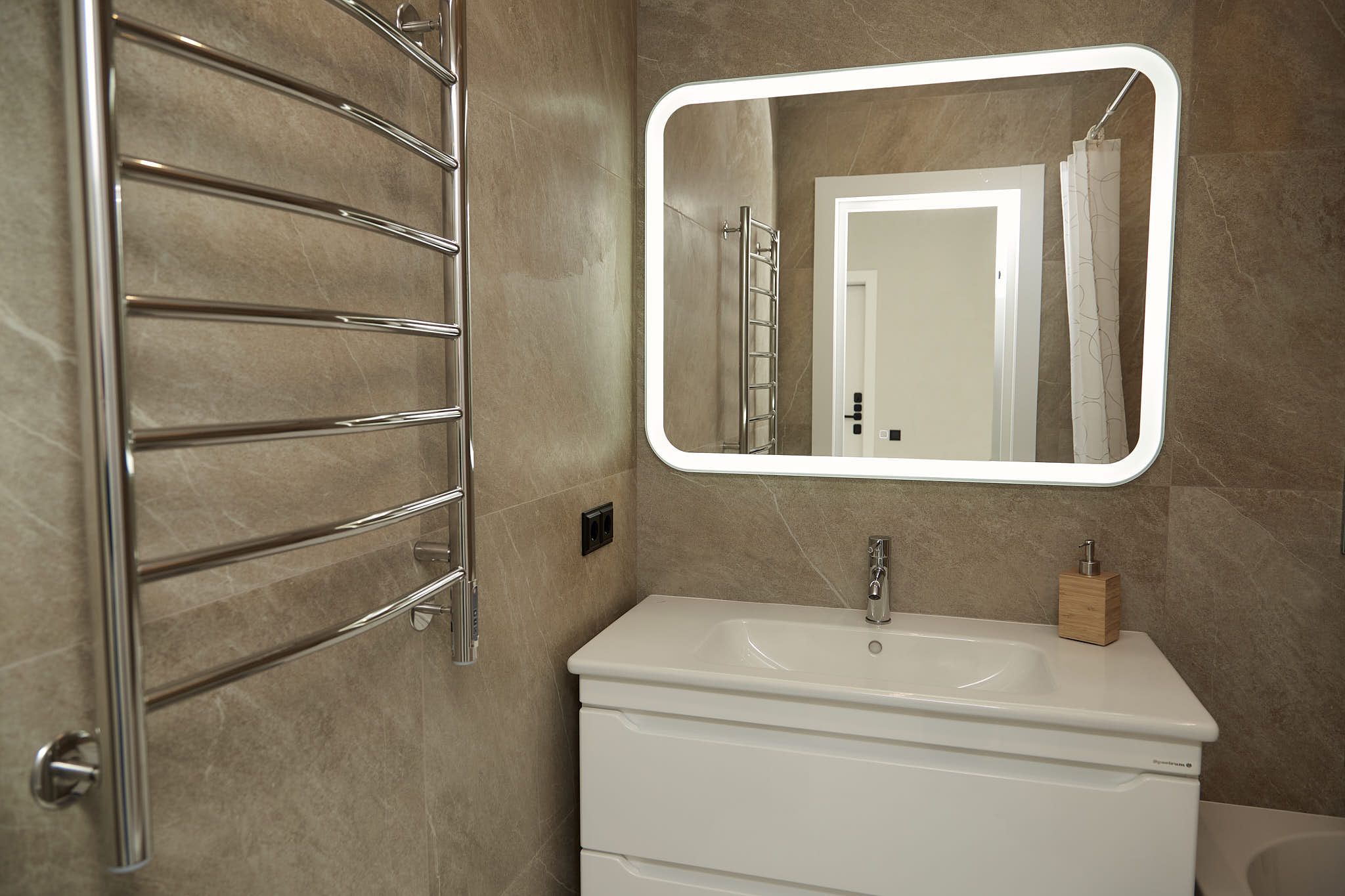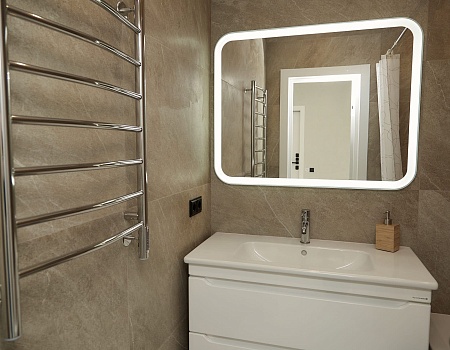 В ванной комнате установили электрический полотенцесушитель российского производства, ванну и смеситель скрытого монтажа, а также раковину с тумбой. В санузле, ванной комнате и на балконе установили систему «тёплый пол». В спальной комнате выстроили перегородку для встроенного шкафа. Утеплили оба балкона по периметру, установили подоконники и переставили оконно-дверной блок, чтобы сформировать надёжный откос.