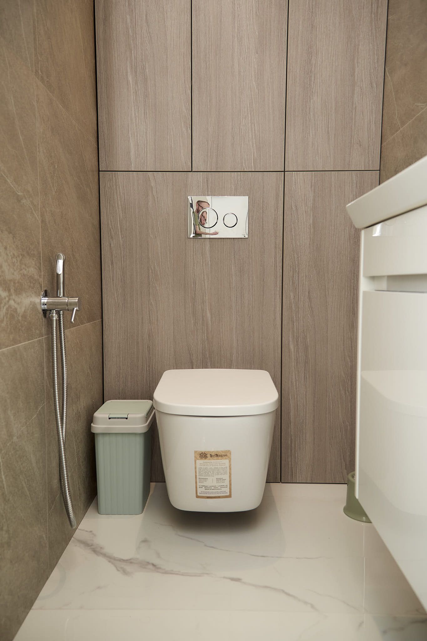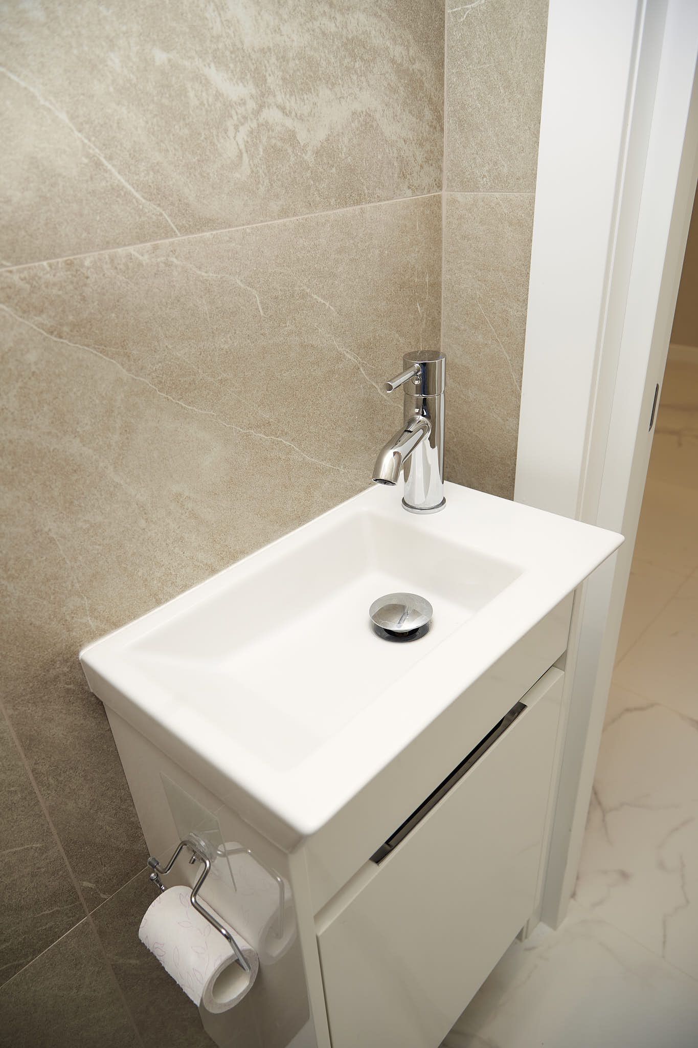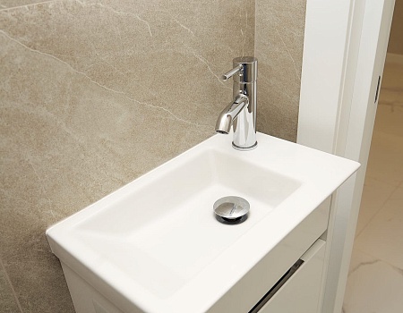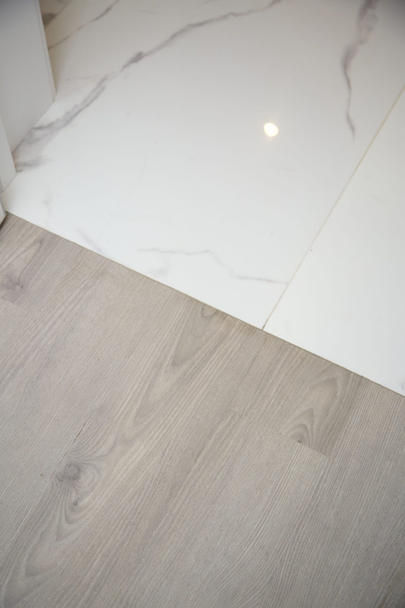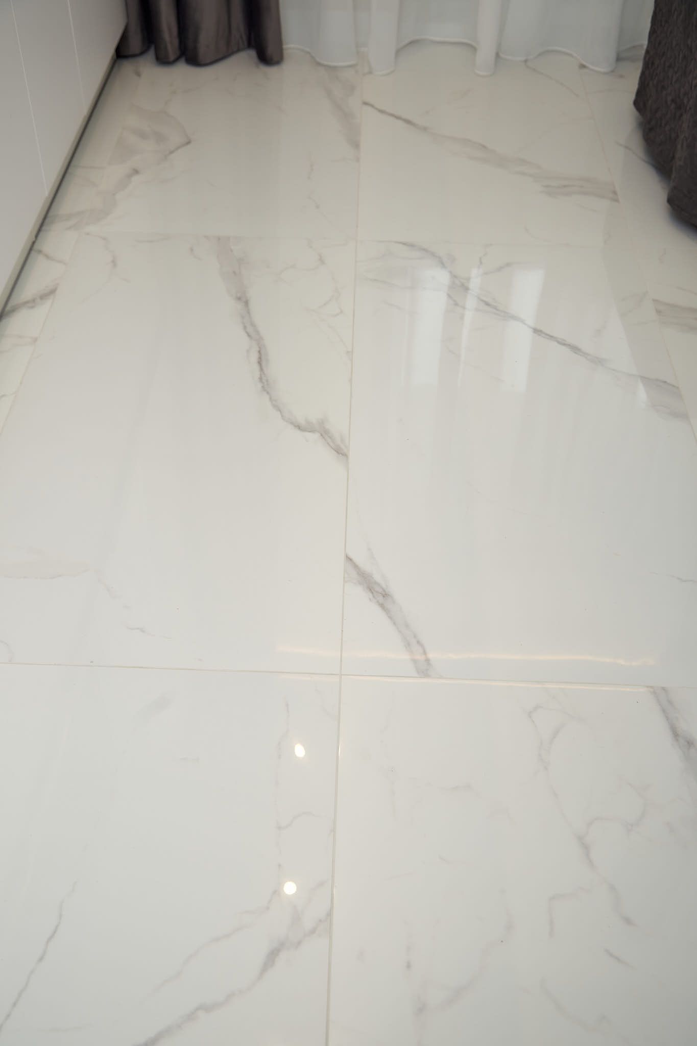 В ванной комнате установили электрический полотенцесушитель российского производства, ванну и смеситель скрытого монтажа, а также раковину с тумбой. В санузле, ванной комнате и на балконе установили систему «тёплый пол». В спальной комнате выстроили перегородку для встроенного шкафа. Утеплили оба балкона по периметру, установили подоконники и переставили оконно-дверной блок, чтобы сформировать надёжный откос.