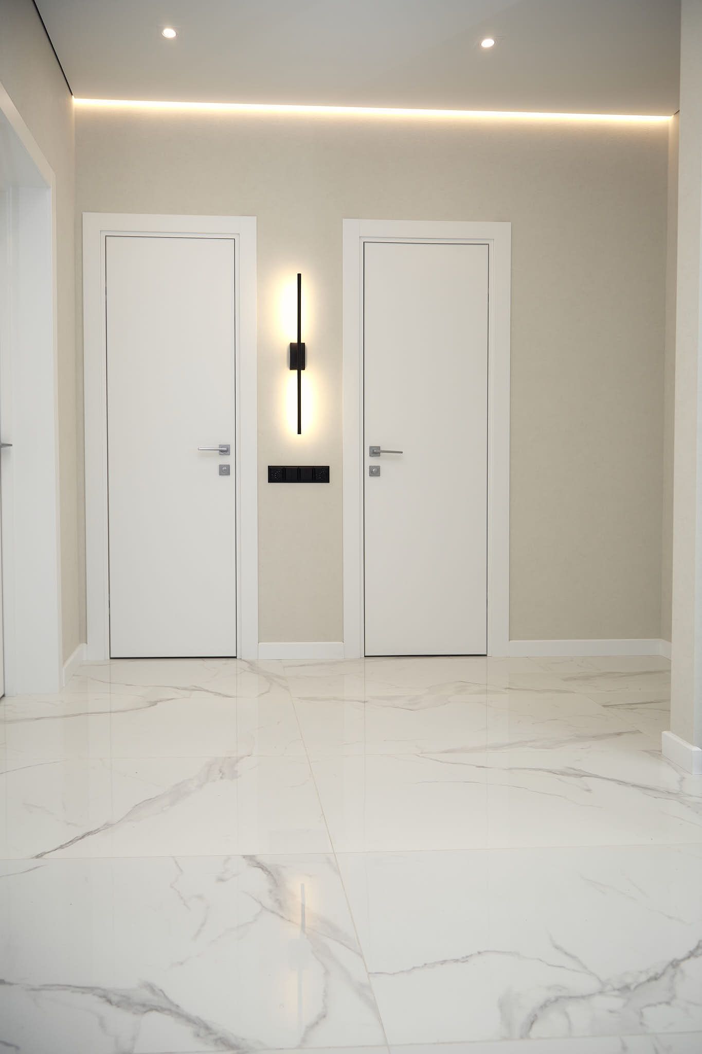 Скрытые двери, обилие белого цвета, трековый свет: проект в минимализме для ценителей современных интерьеров.