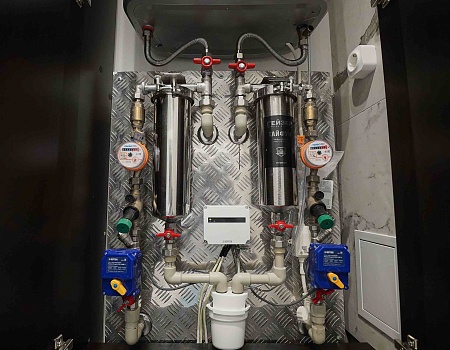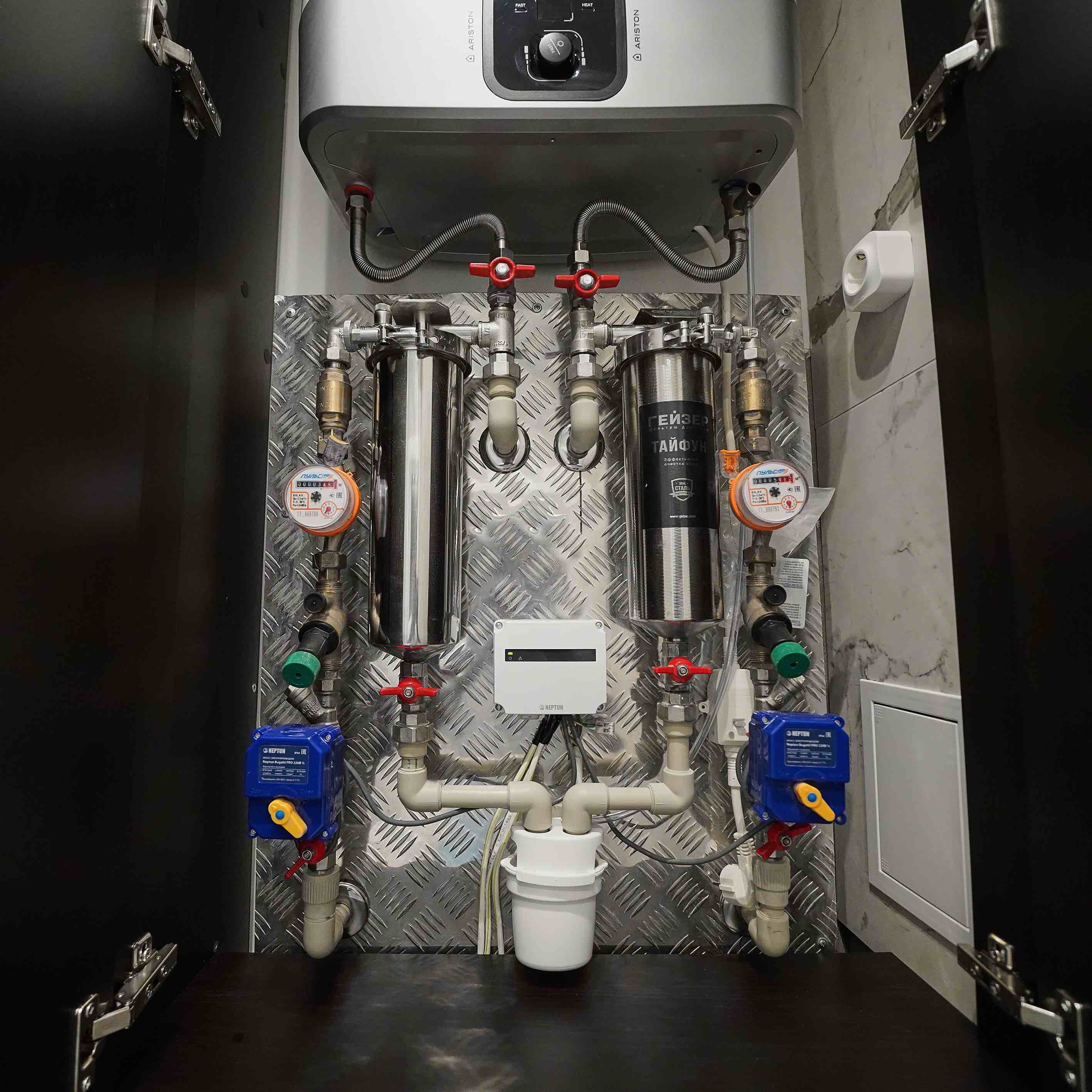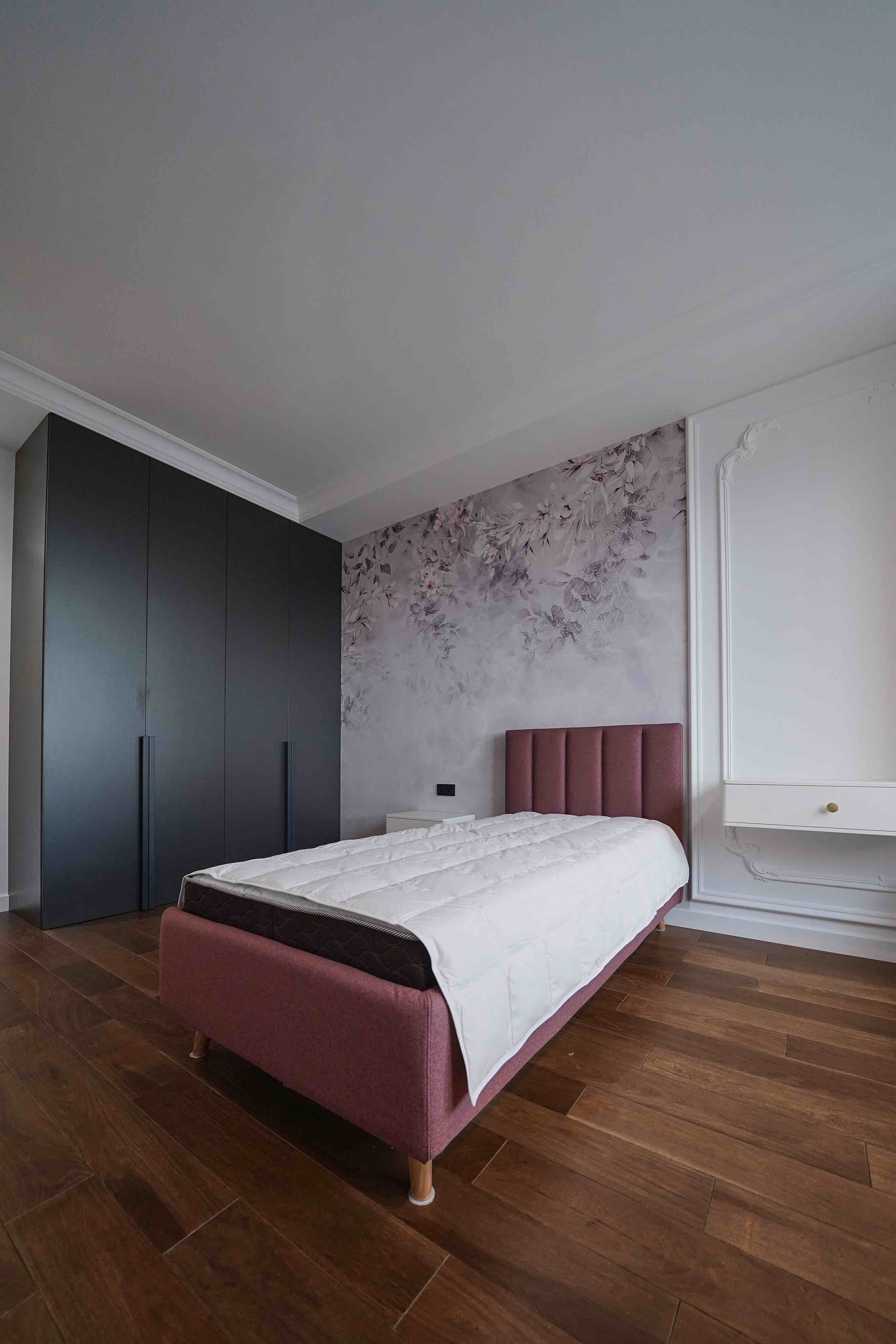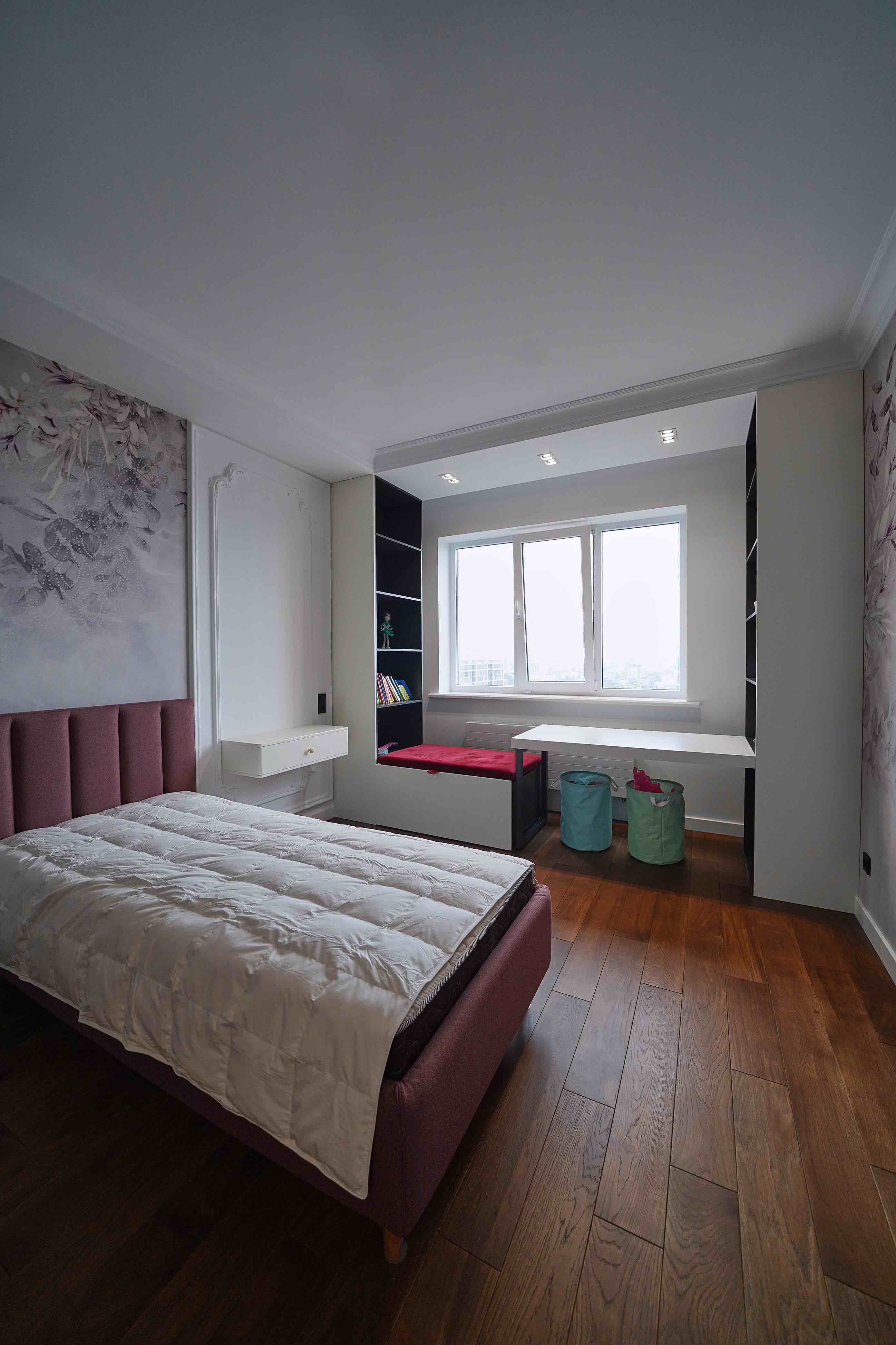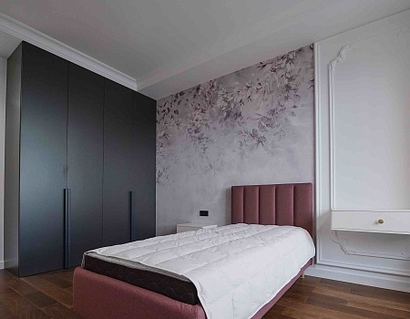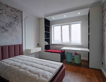 В детской комнате использовали фото-обои для отделки стен и полиуретановый декор. В санузле установили раковину, инсталляцию с подвесным унитазом, гигиенический душ скрытого монтажа и систему хранения с узлом учета и накопительным водонагревателем.