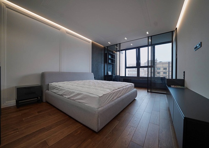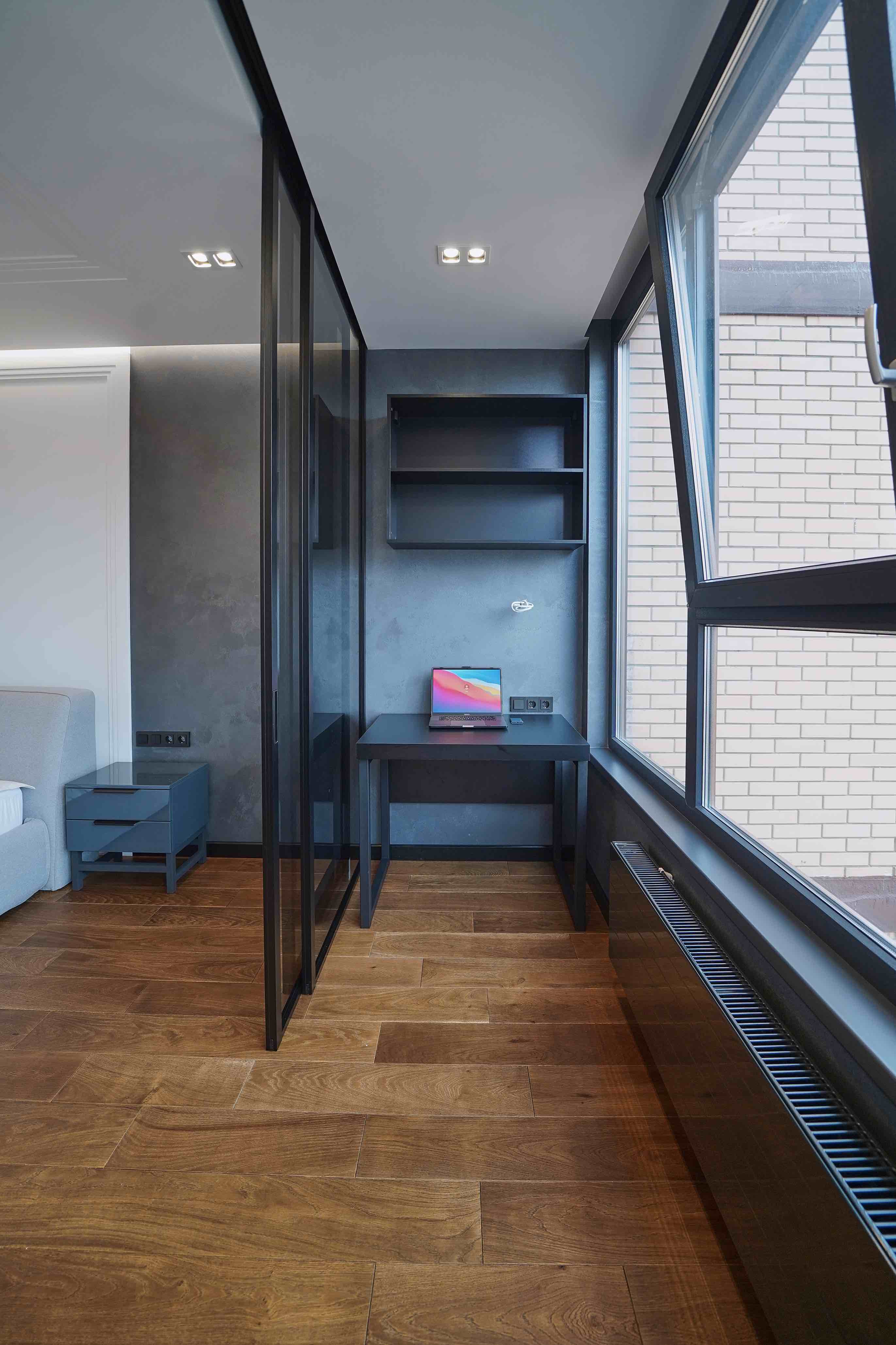 Спальню также объединили с частью лоджии, на которой опустили парапет, заменили