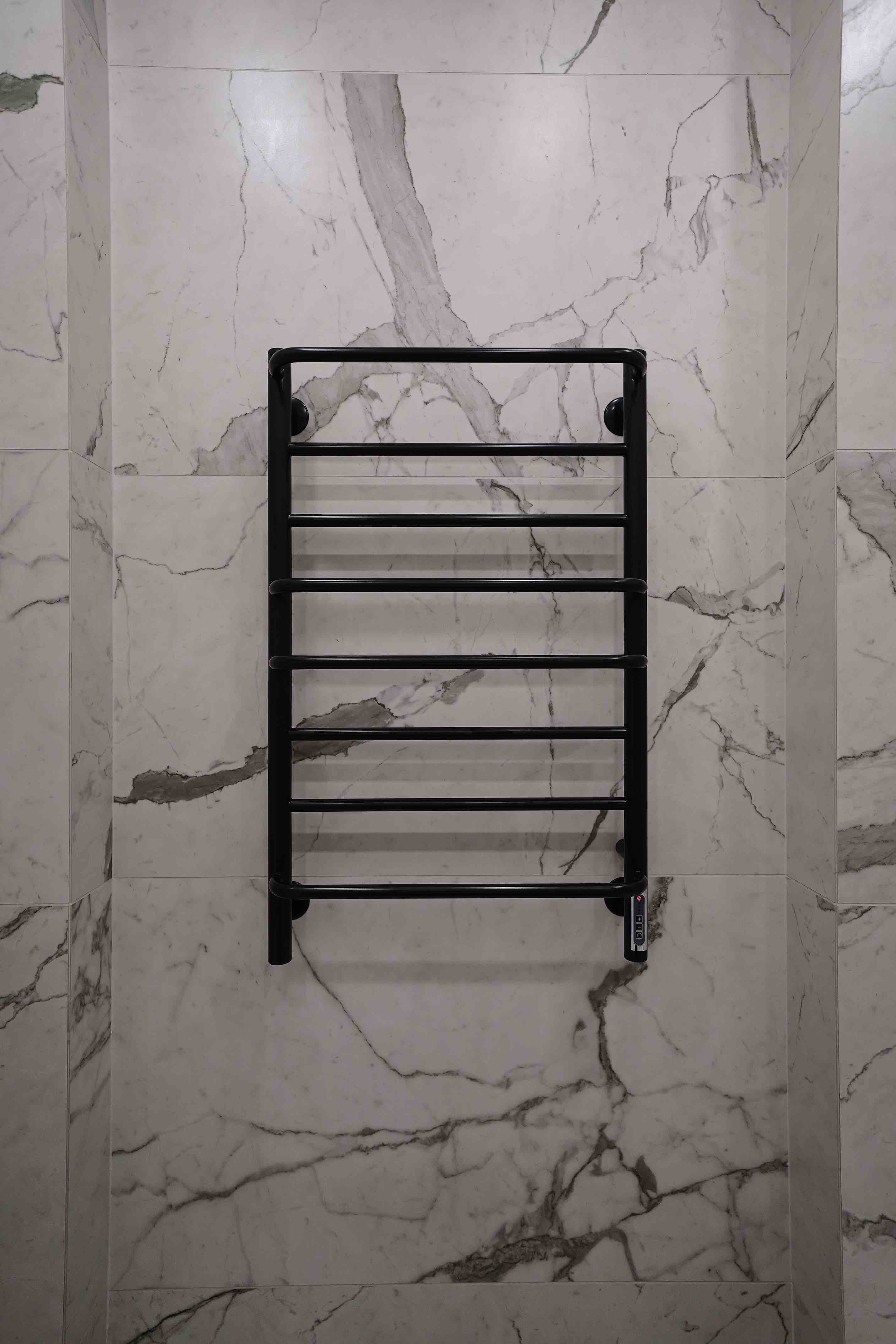 В ванной комнате установили электрический полотенцесушитель, раковину, большую