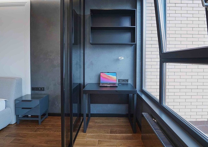 штукатурки в благородном, темно-сером оттенке. Установили мебельную группу, а также вместительную гардеробную — для этого мы возвели две перегородки из газобетонного блока.
