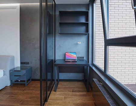 раздвижное ограждение, разделив комнату на две зоны: рабочую и основную. Для