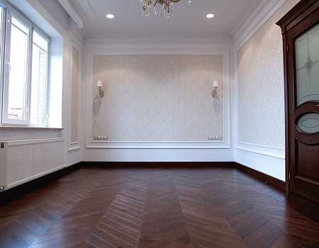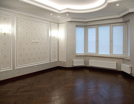Роскошная квартира в стиле "неоклассика" для молодой девушки. Настенные молдинги, потолочные карнизы, стены под окраску и инженерная доска.