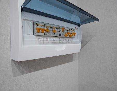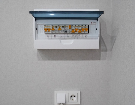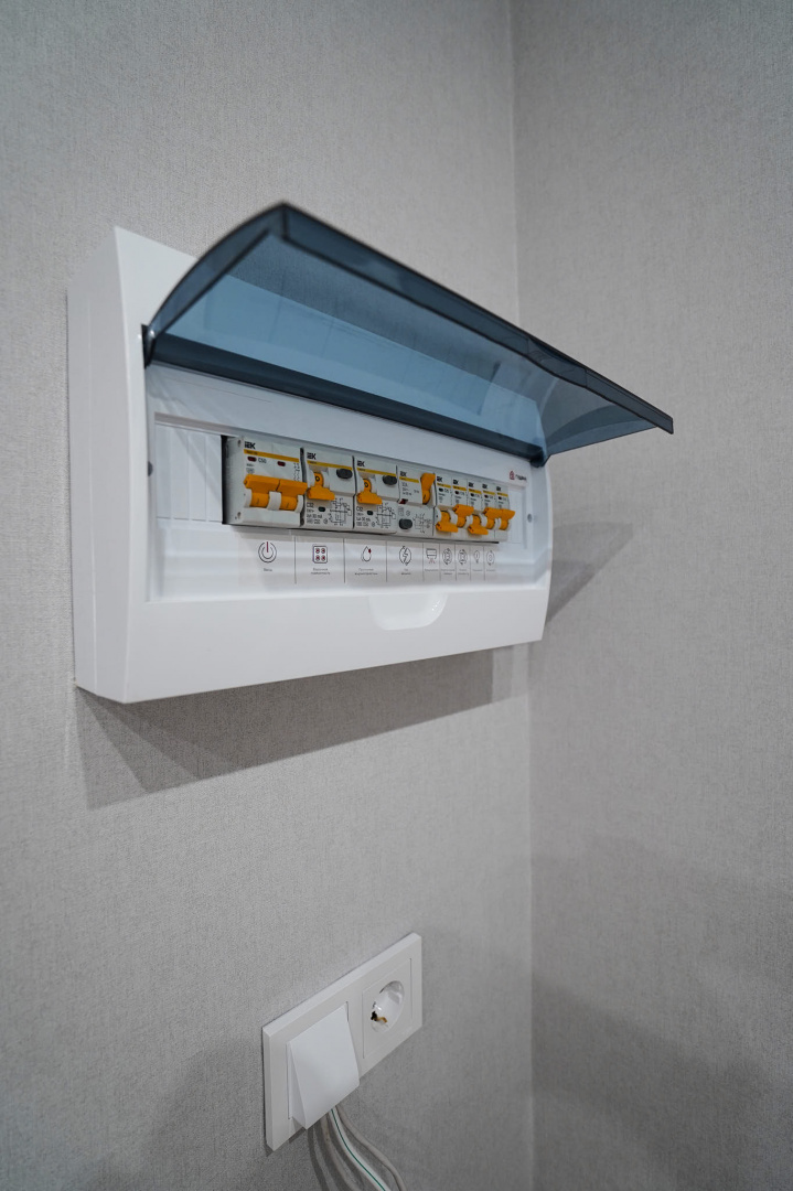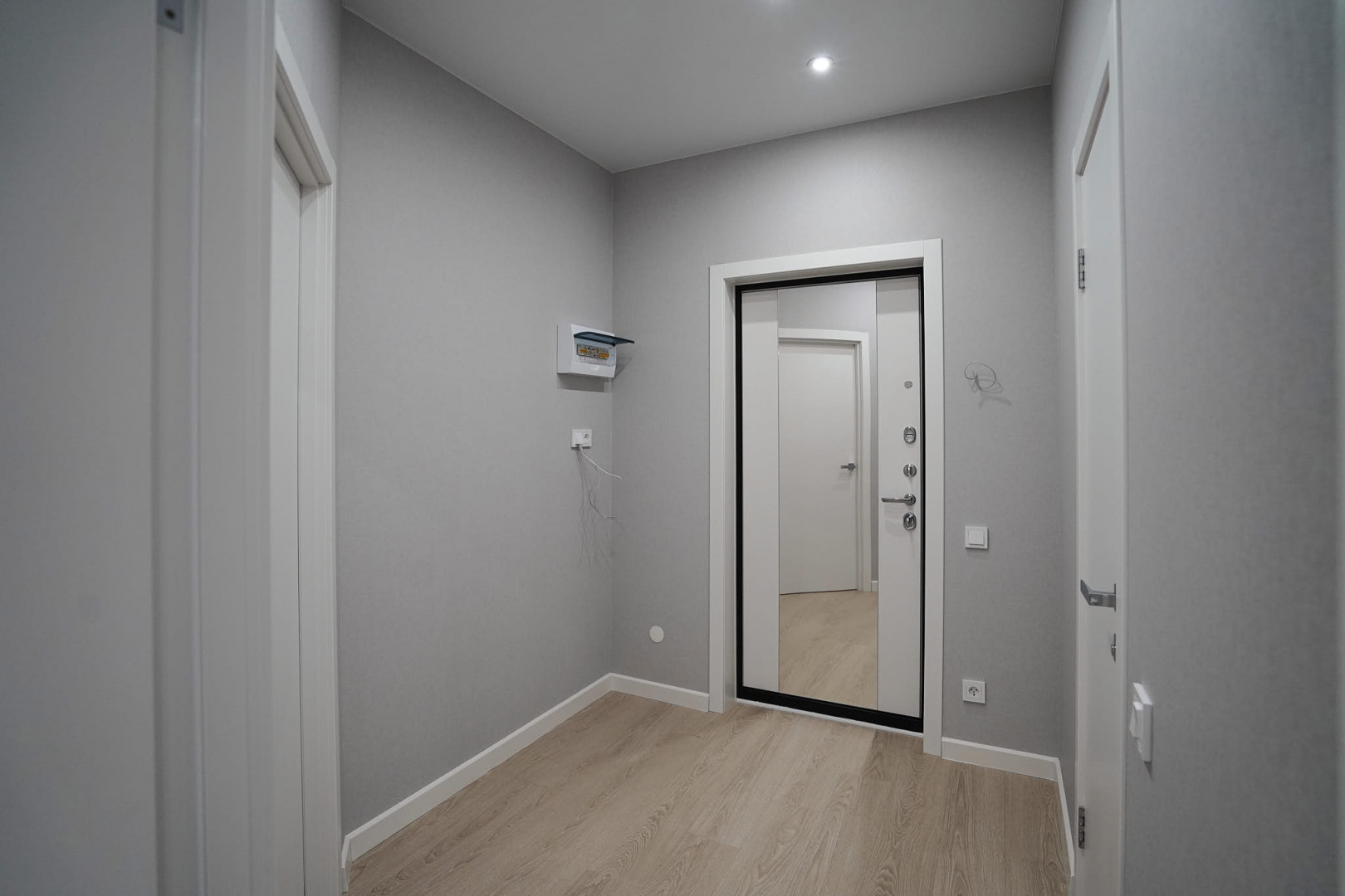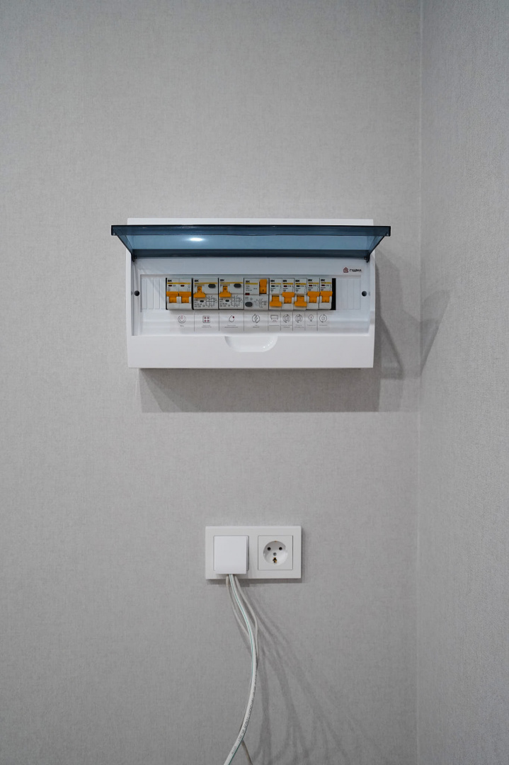 В коридоре установили электрический щит и электрику под Wi-Fi-роутер — все коммуникации уже выведены через кабель-канал, поэтому хозяевам не придется штробить стены при подключении оптоволокна. Установили новую входную дверь, обрамили входной проем доборами и наличниками.