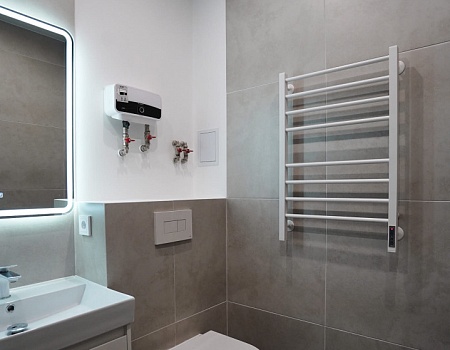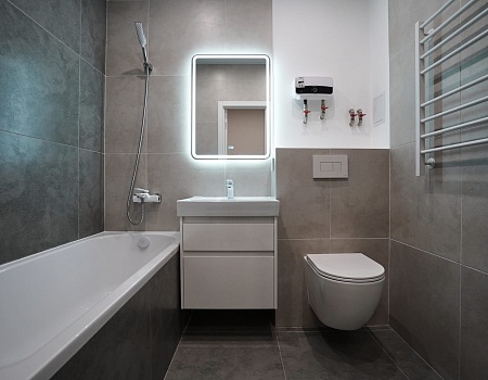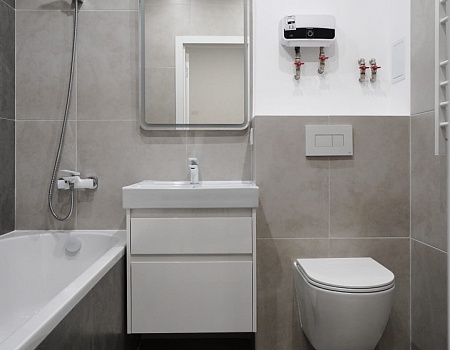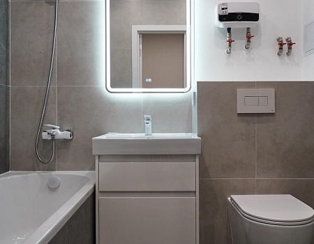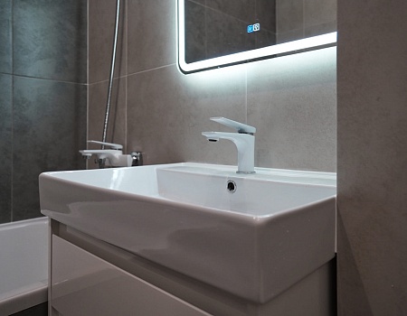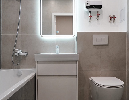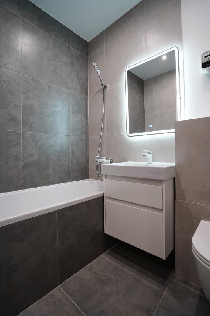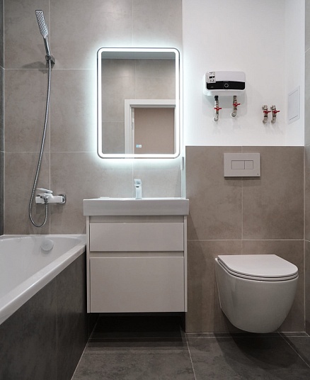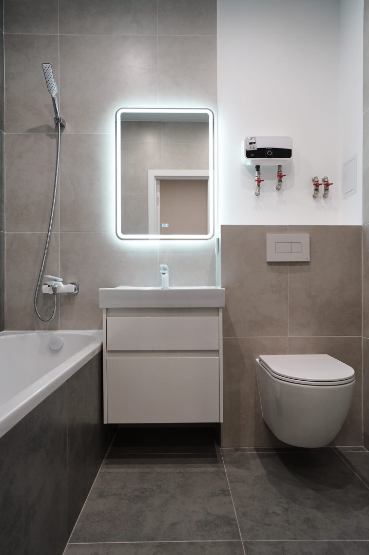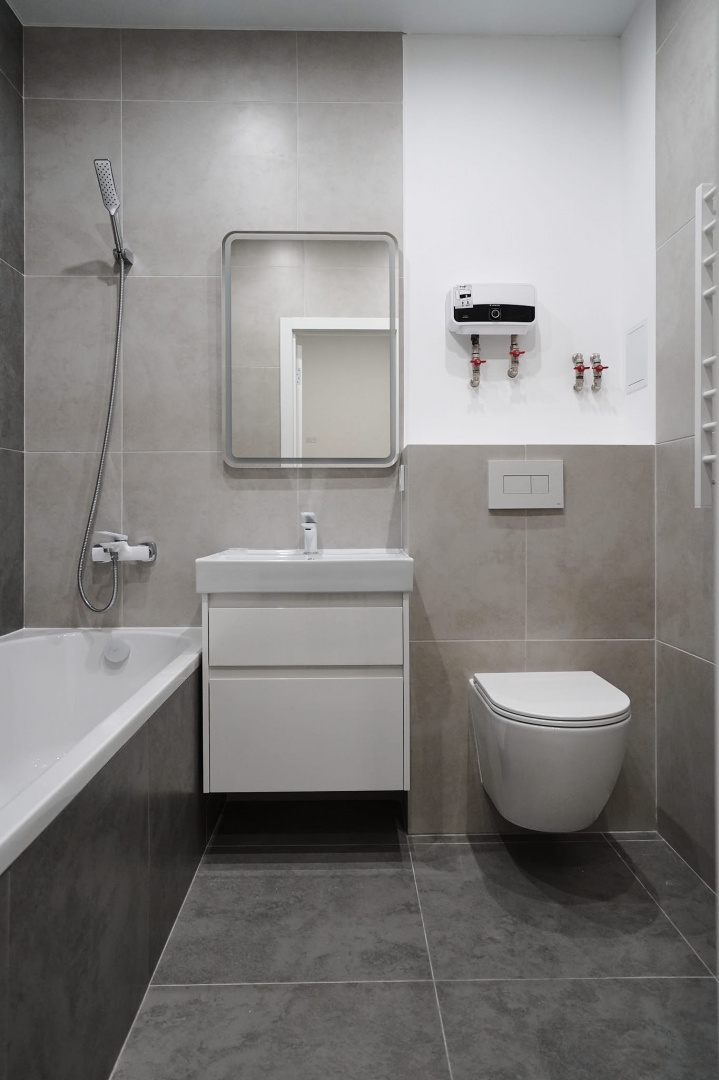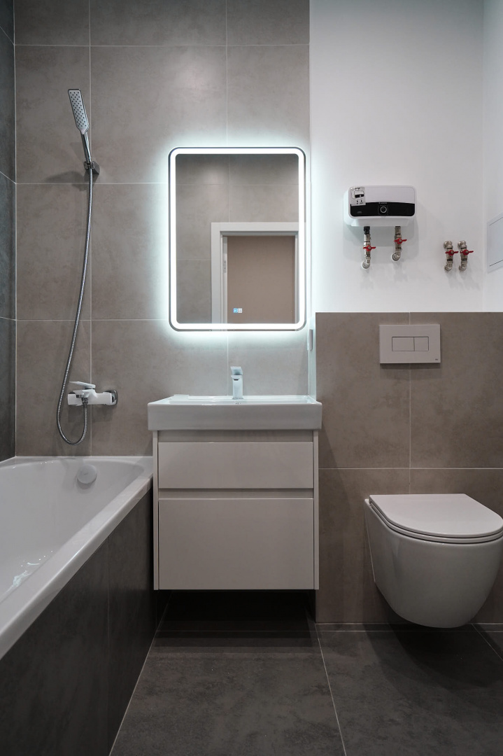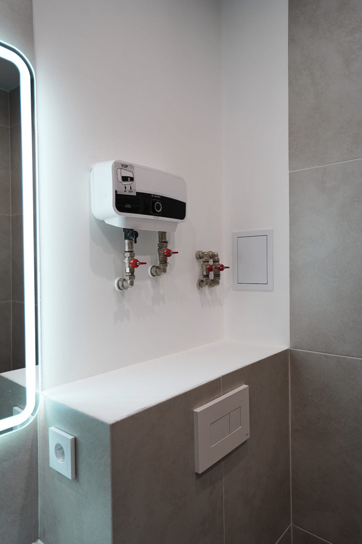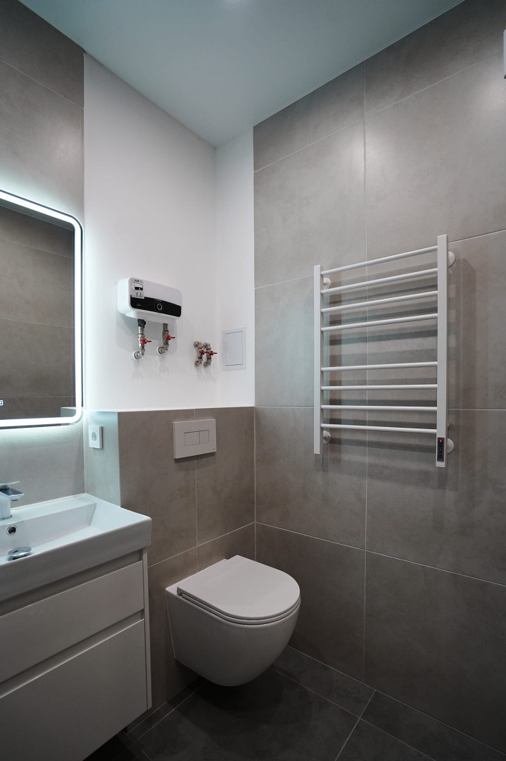 В ванной комнате стены и пол облицевали керамогранитом, установили акриловую ванну и смесители от бренда Lemark, раковину с тумбой, зеркало с подсветкой, инсталляцию с подвесным унитазом, электрический полотенцесушитель и принудительную вытяжку. Все углы запилили под 45 градусов, чтобы избавить пространство от пластиковых уголков. В зоне мебельной конструкции расположили вводные краны и проточный водонагреватель со скрытым подключением.