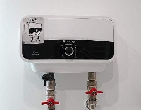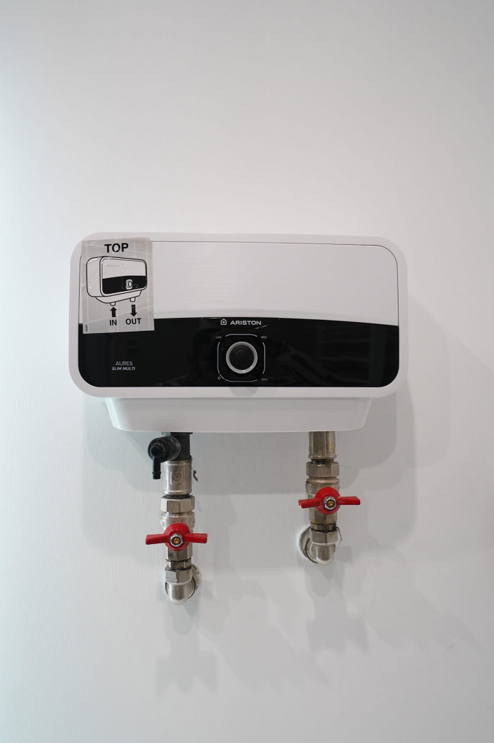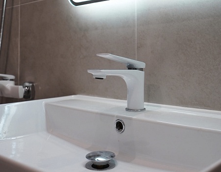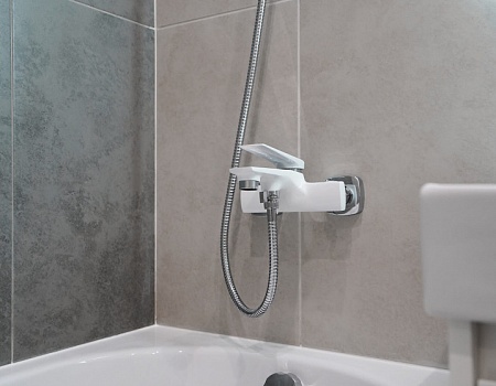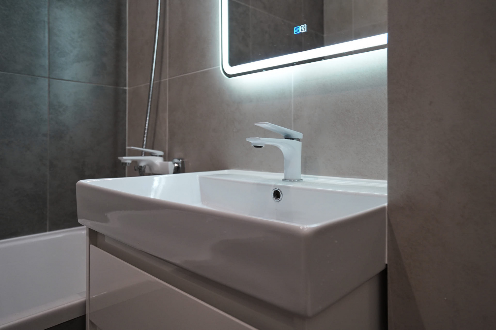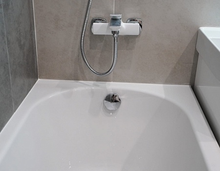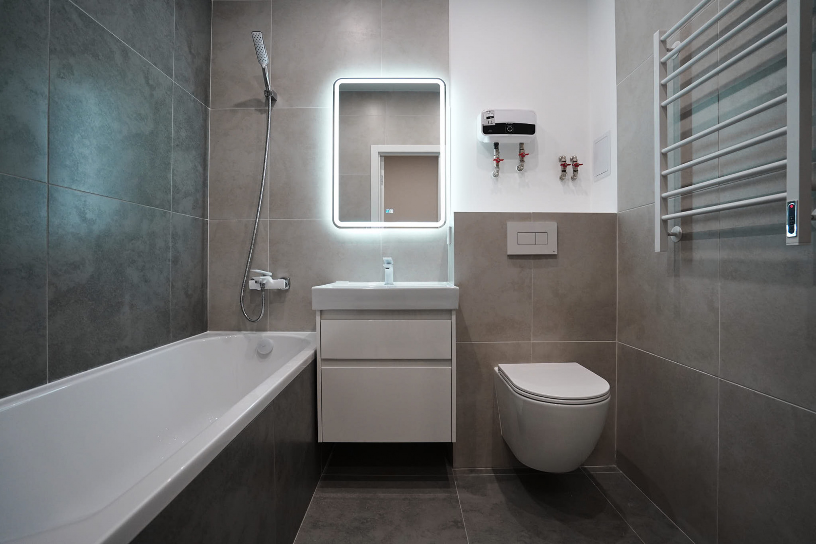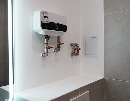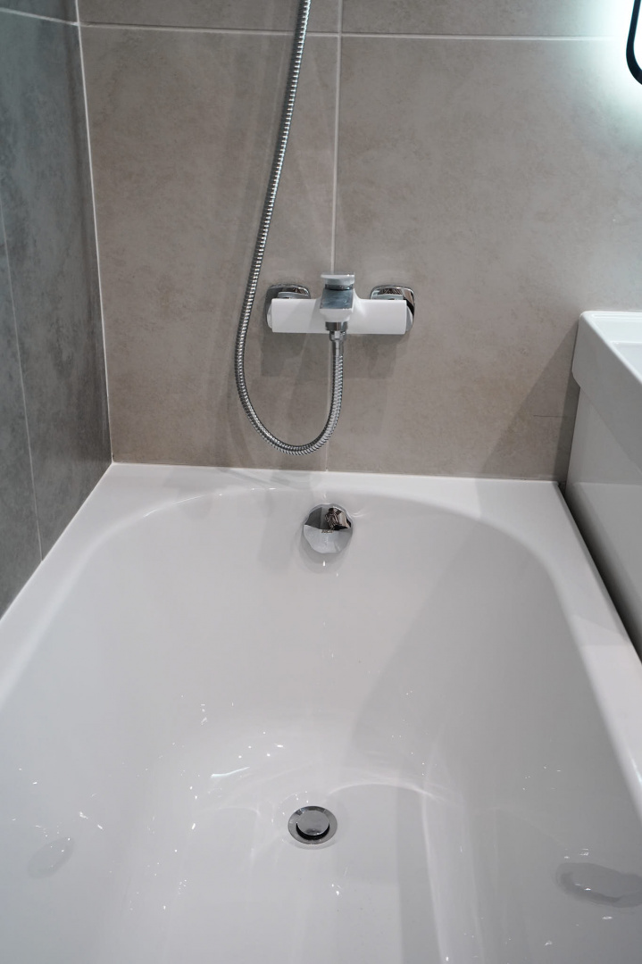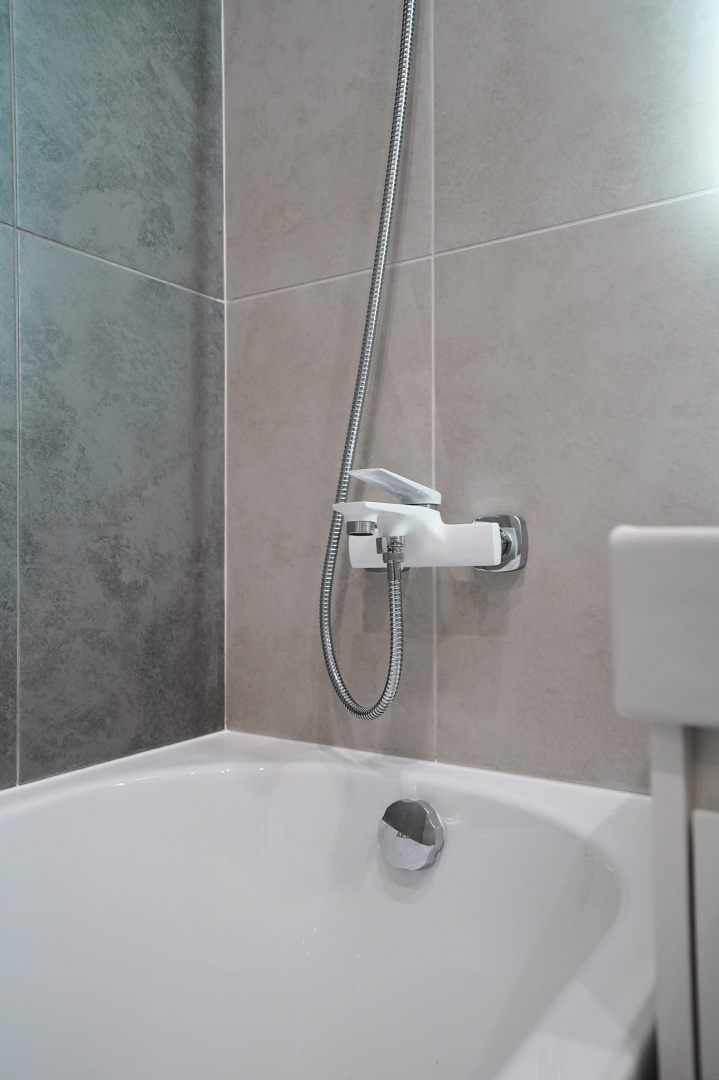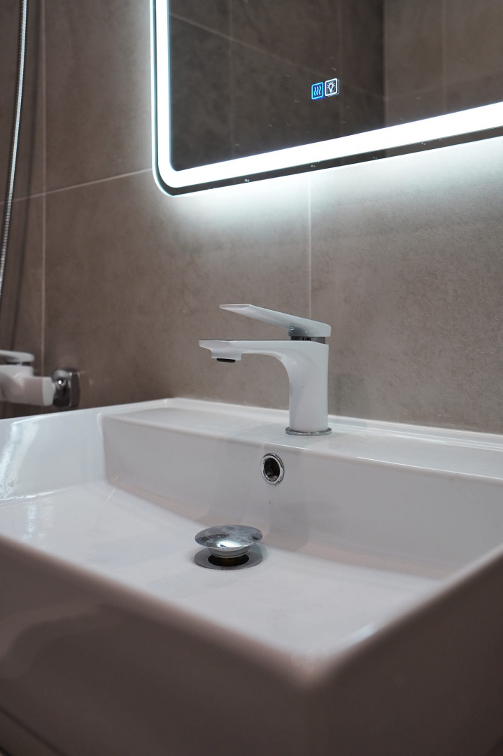 В ванной комнате стены и пол облицевали керамогранитом, установили акриловую ванну и смесители от бренда Lemark, раковину с тумбой, зеркало с подсветкой, инсталляцию с подвесным унитазом, электрический полотенцесушитель и принудительную вытяжку. Все углы запилили под 45 градусов, чтобы избавить пространство от пластиковых уголков. В зоне мебельной конструкции расположили вводные краны и проточный водонагреватель со скрытым подключением.