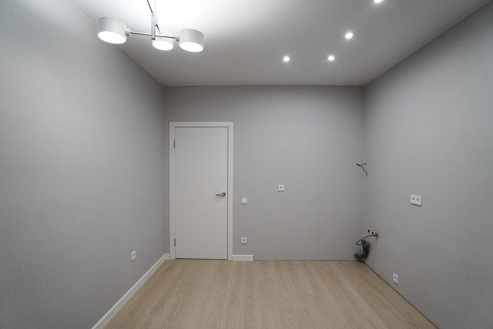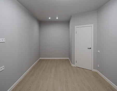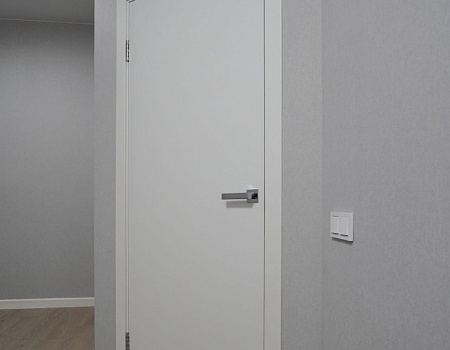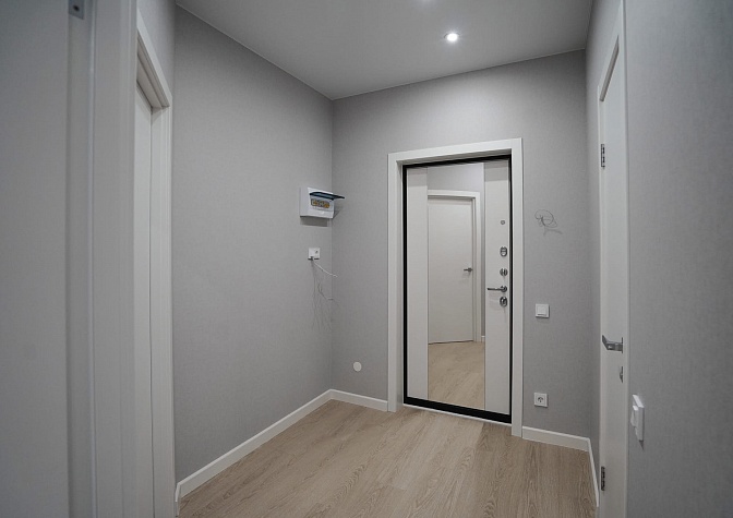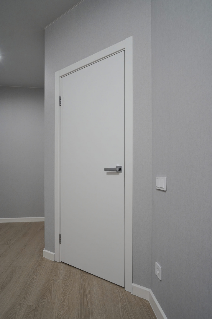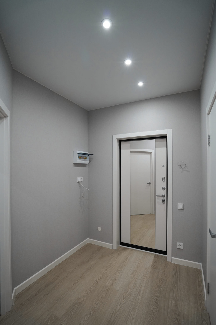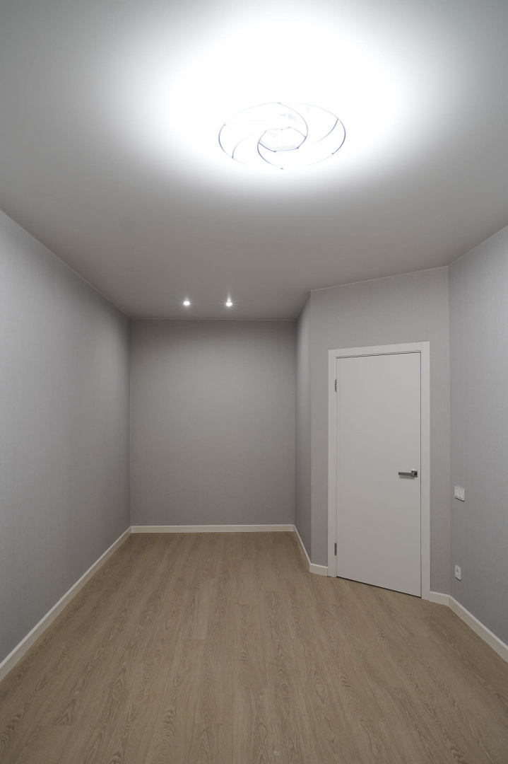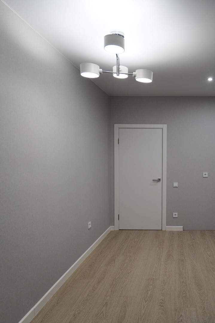 Установили межкомнатные двери с белым, гладким полотном. Провели «протяжку», чтобы сделать стены более ровными и избавиться от щелей в местах стыков с наличниками, плинтусами и потолком, ошпакелвали в 2 слоя, «ошкурили» и оклеили готовыми обоями. На пол уложили ламинат от бренда Quick-Step, а стыковку с керамогранитом выполнили в единой плоскости без порожков. Установили натяжной потолок. Провели сантехническую разводку. Установили несколько групп света: точечные светильники, основные люстры и светодиодную подсветку.
