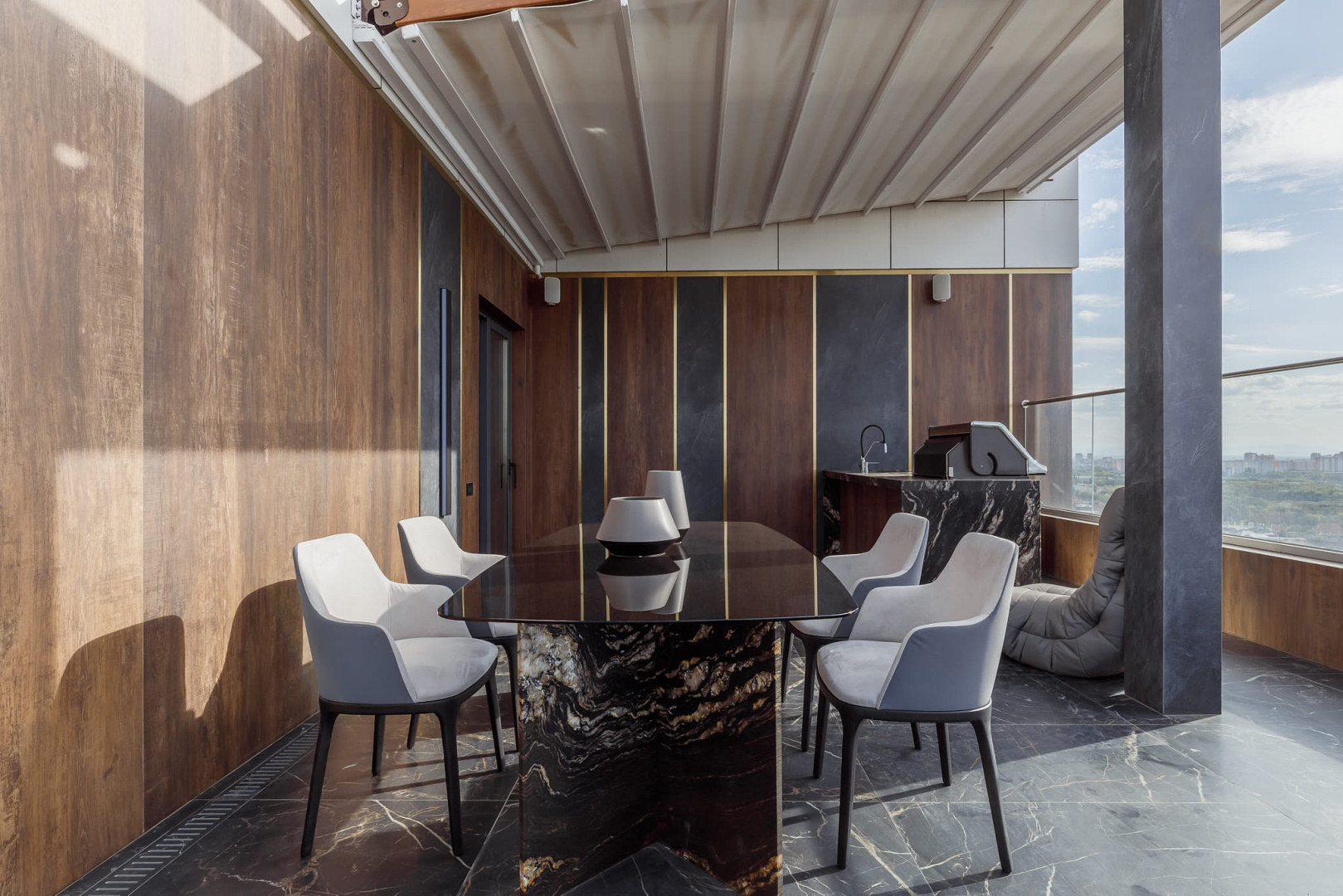 Важной особенностью данной квартиры является потрясающий панорамный вид на город. Вы сможете наслаждаться городским пейзажам из окон или на террасе, где организовано пространство для отдыха и развлечений. Здесь расположилась зона барбекю, а также джакузи.