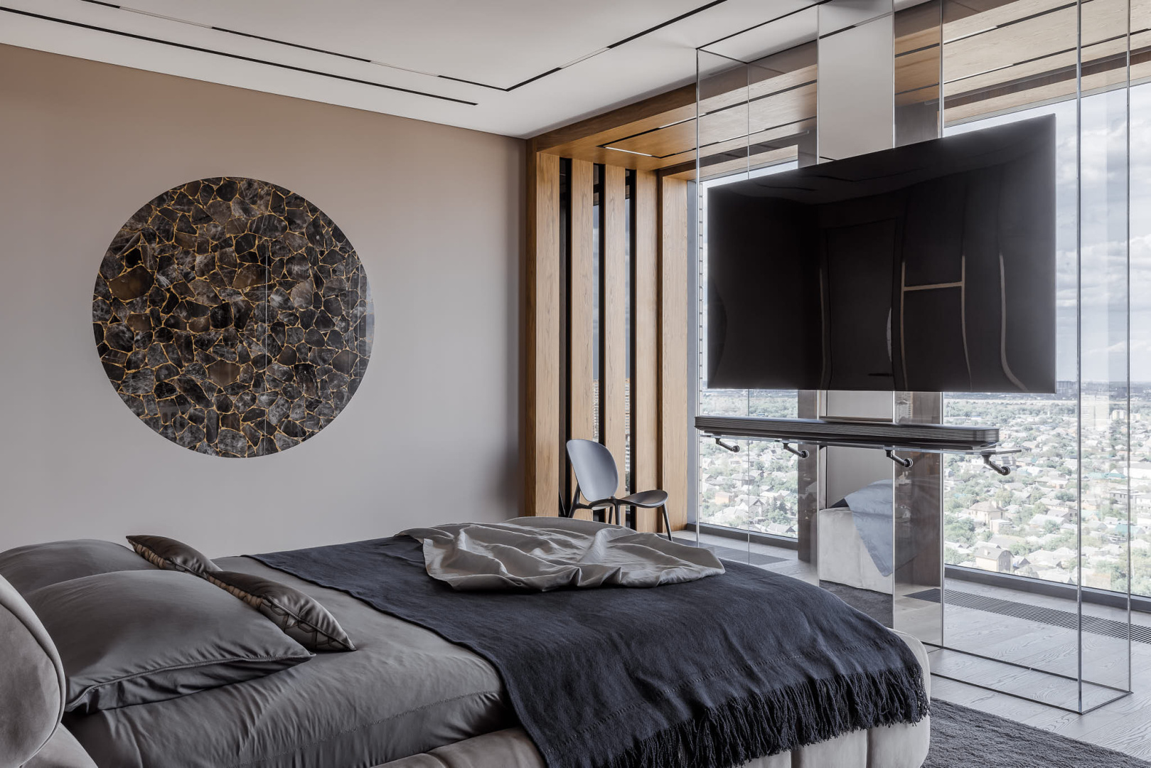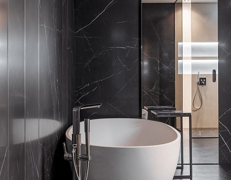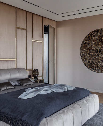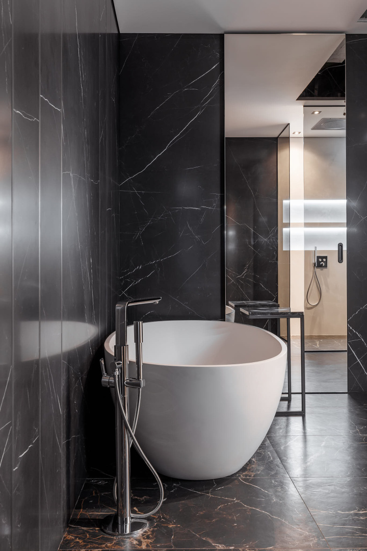 Запоминающийся проект с необычной «фишкой» — большой ванной, которая разместилась в спальной комнате.