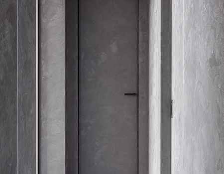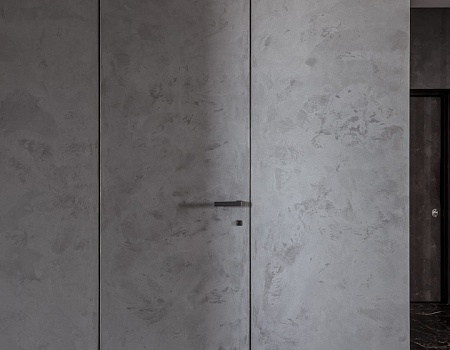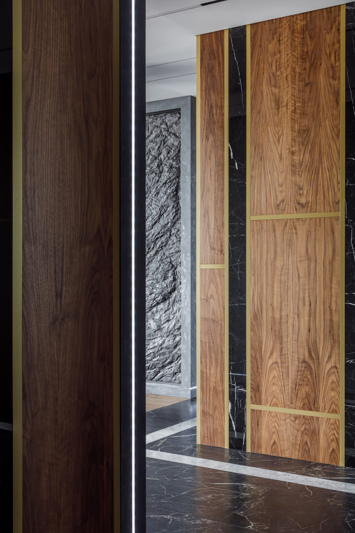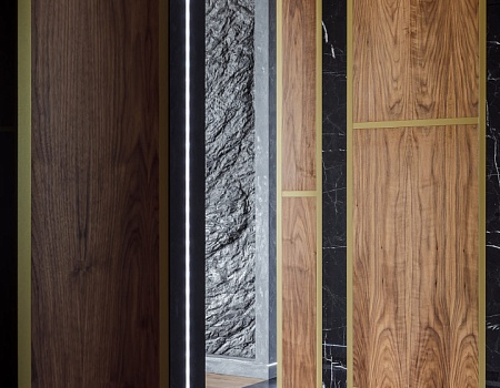 В отделке стен также использовалась высококачественная окраска, декоративная штукатурка, слэбы керамогранита и мягкие декоративные панели. На полу - инженерная доска и керамогранит. Потолок выполнен из гипсокартона на теневом профиле и окрашен.