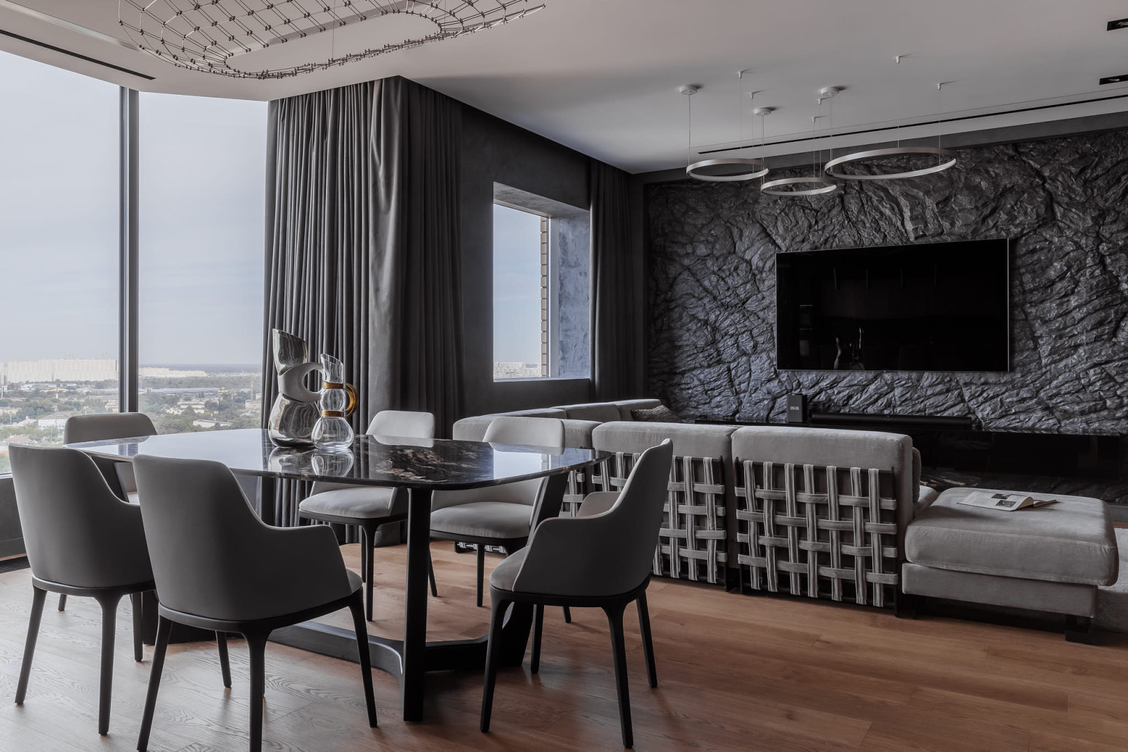 Кухня - гостиная является сердцем этой квартиры, а стена в зоне ТВ, выполненная под натуральную скалу, визитной карточкой интерьера.