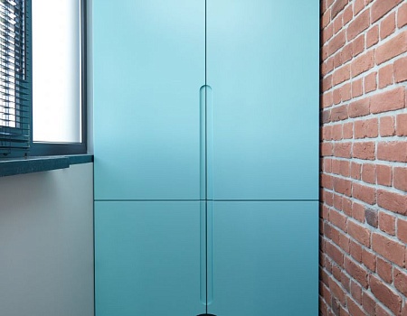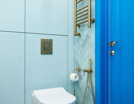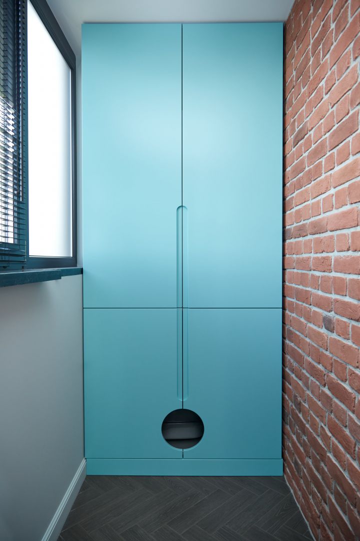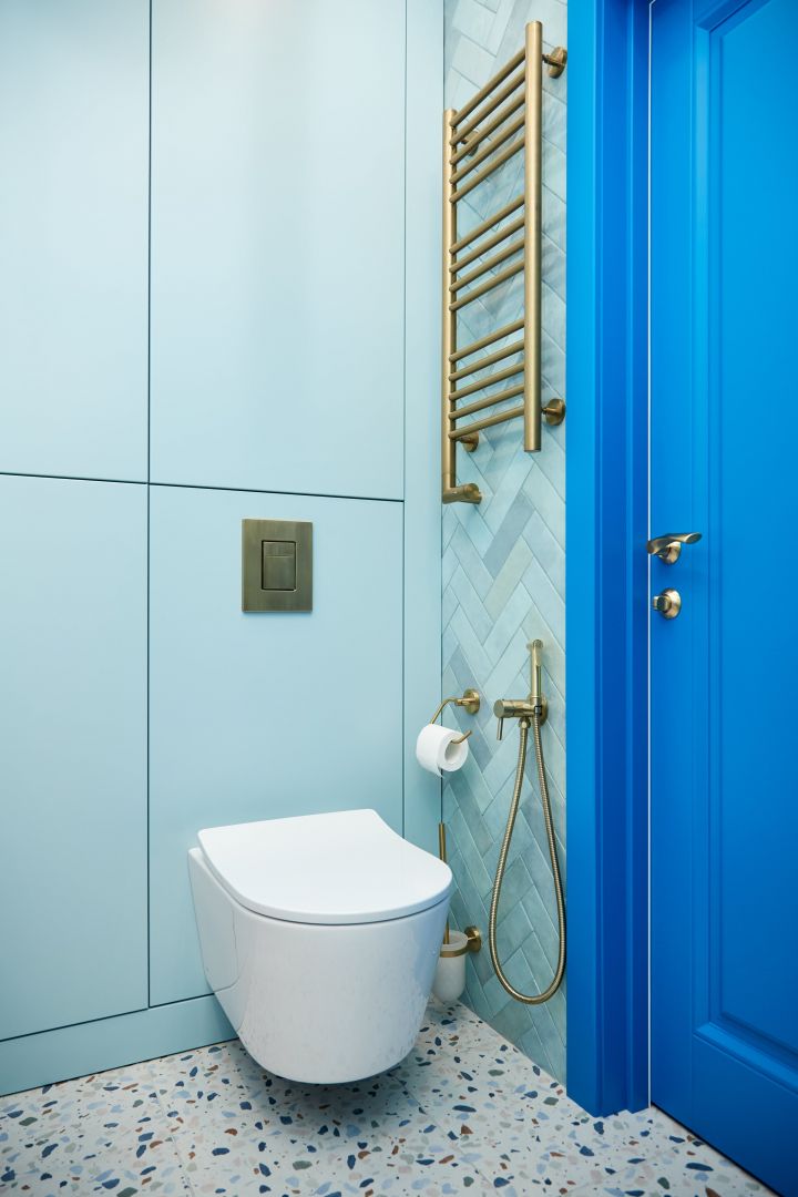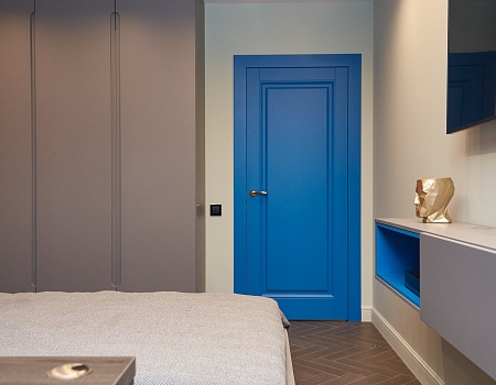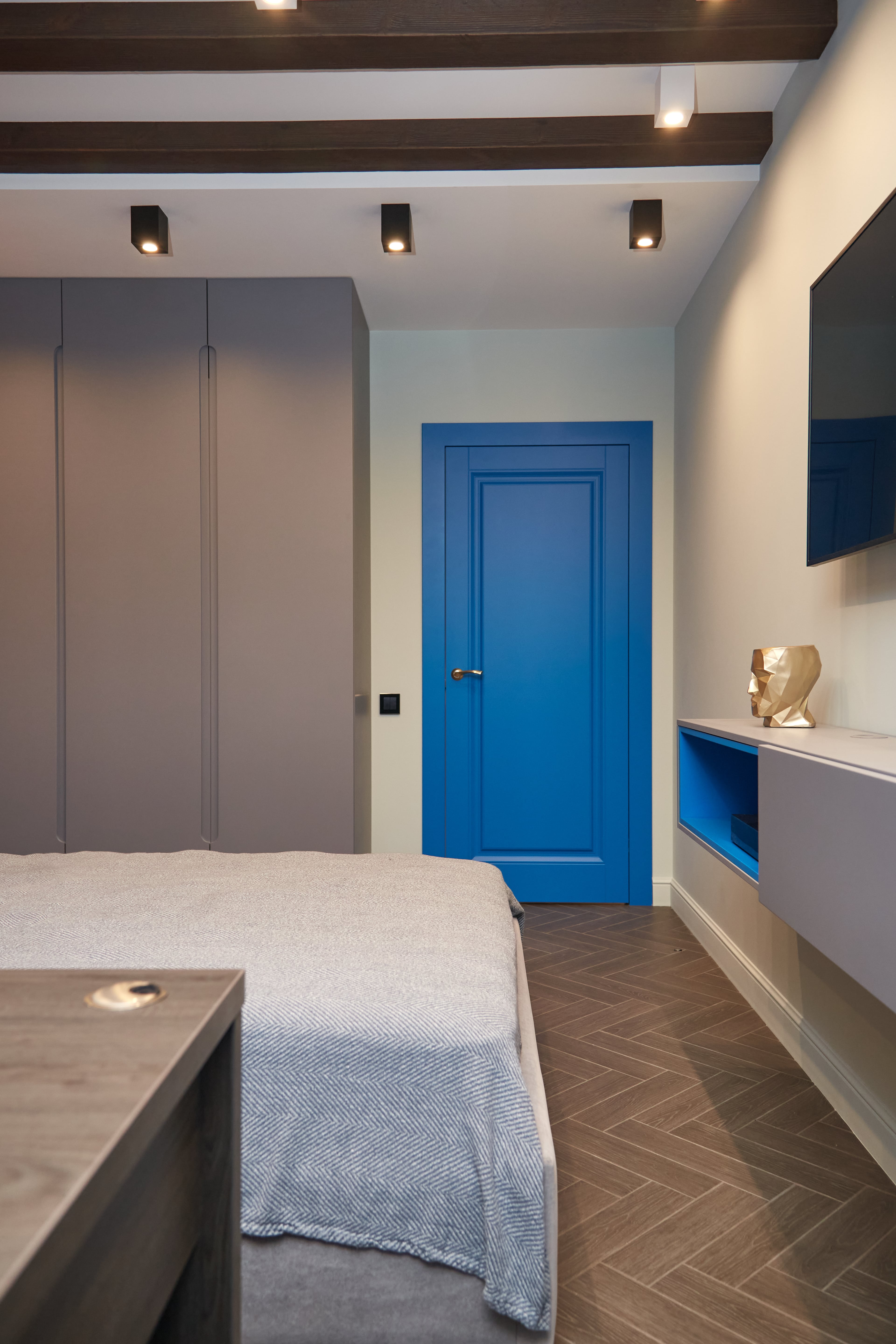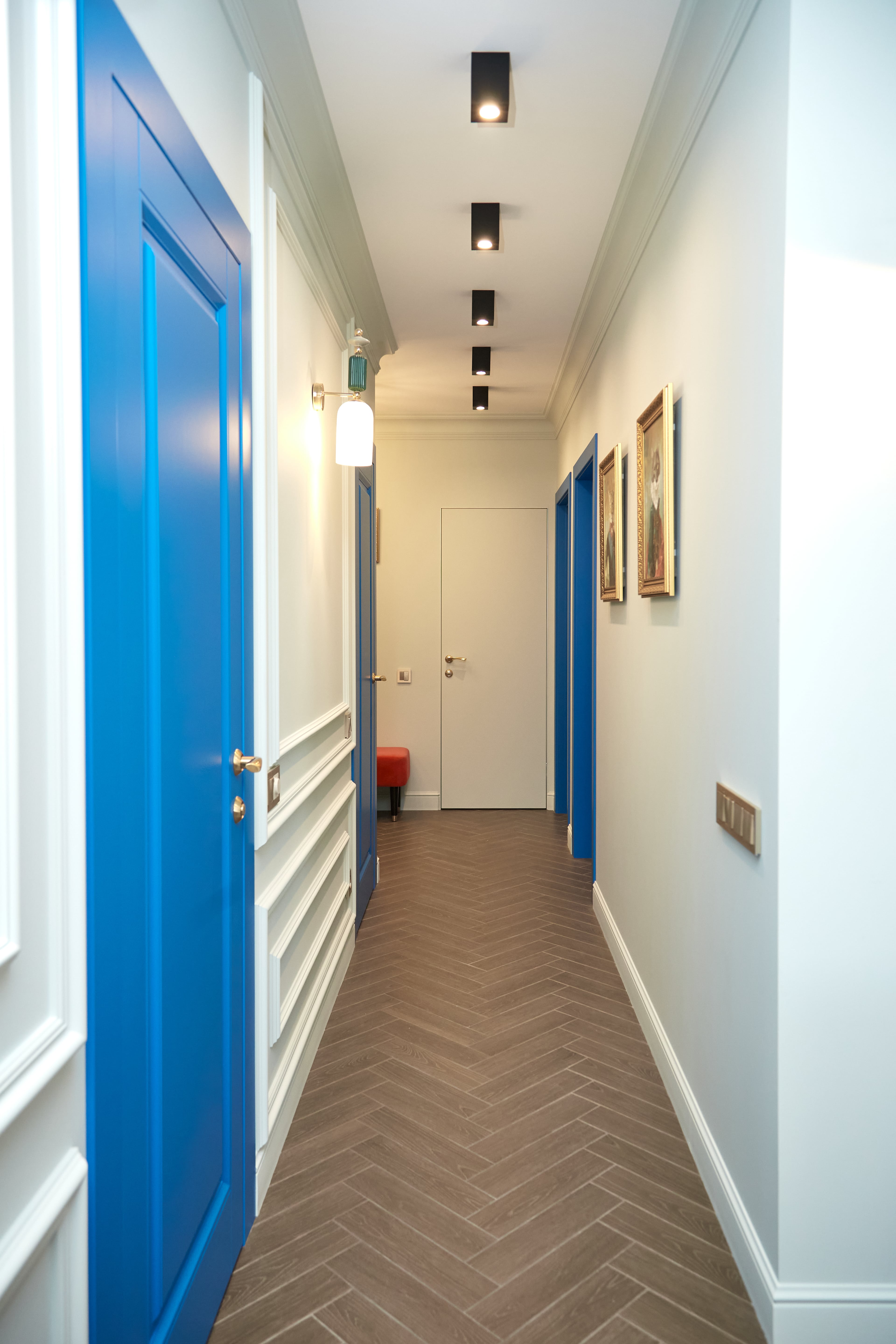 Провели перепланировку и объединили кухню и гостиную в одно пространство. Установили два вида межкомнатных дверей: традиционные в синем оттенке от компании «СитиДорс» и двери скрытого монтажа в белом цвете. Каждую дверь дополнили магнитным ограничителем.