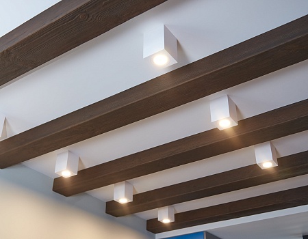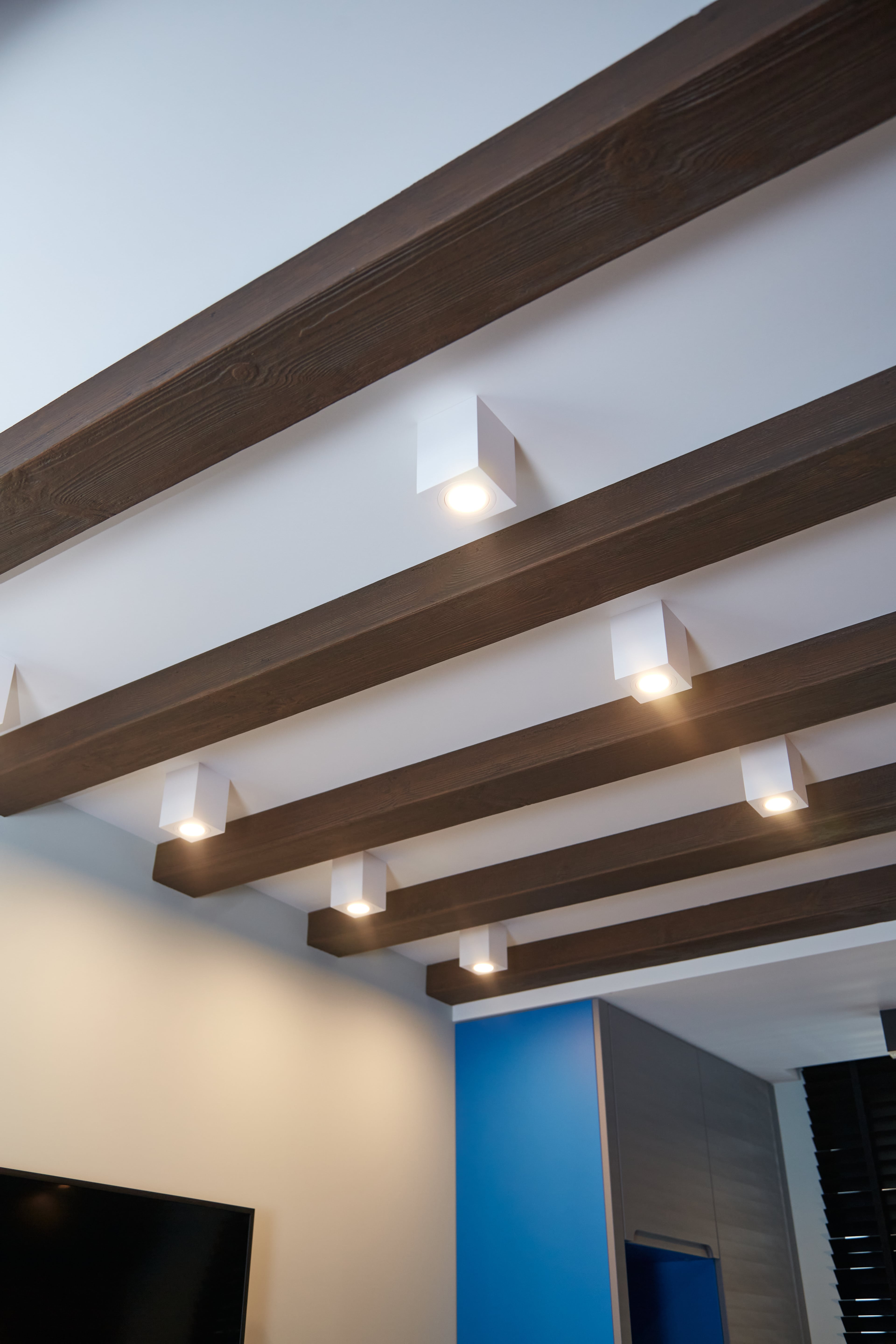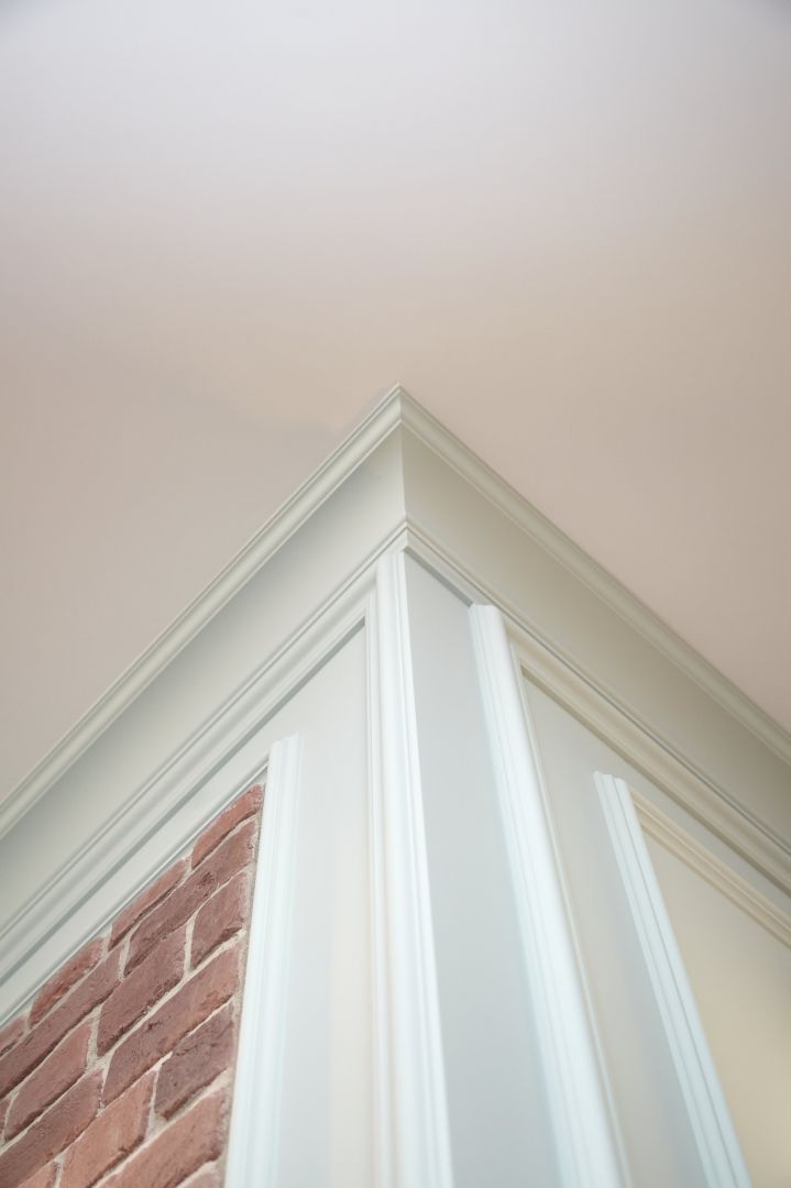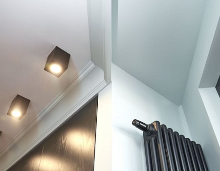 Потолки во всей квартире выполнили из гипсокартона. Дополнили пространство полиуретановыми молдингами, карнизами и плинтусами.