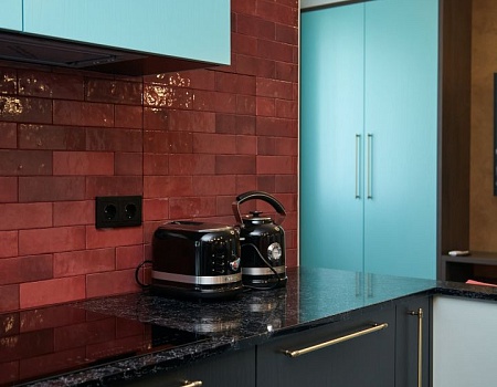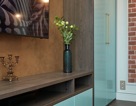 Для декора стен использовали уникальную декоративную плитку с имитацией царского кирпича от компании «Петровская мануфактура», коллекция Ижора. Она придаёт квартире особый шик, будто отсылая нас во времена дореволюционного Петербурга.