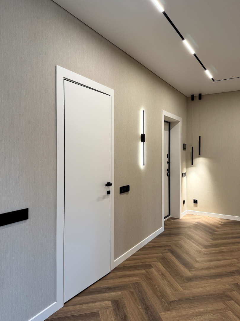 Скрытые двери, обилие белого цвета, трековый свет: проект в минимализме для ценителей современных интерьеров.