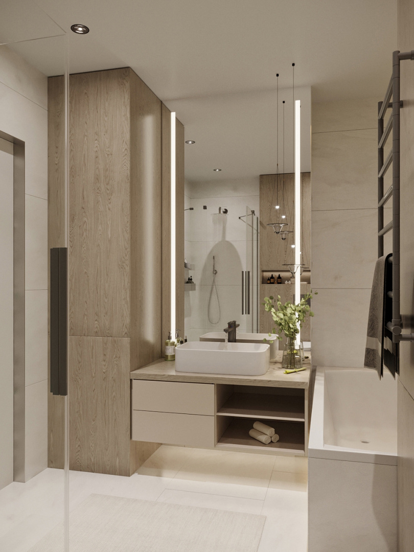 Невероятно уютная и стильная квартира в современном стиле. Встроенное трековое освещение, крупноформатный керамогранит, просторная душевая и многое другое.