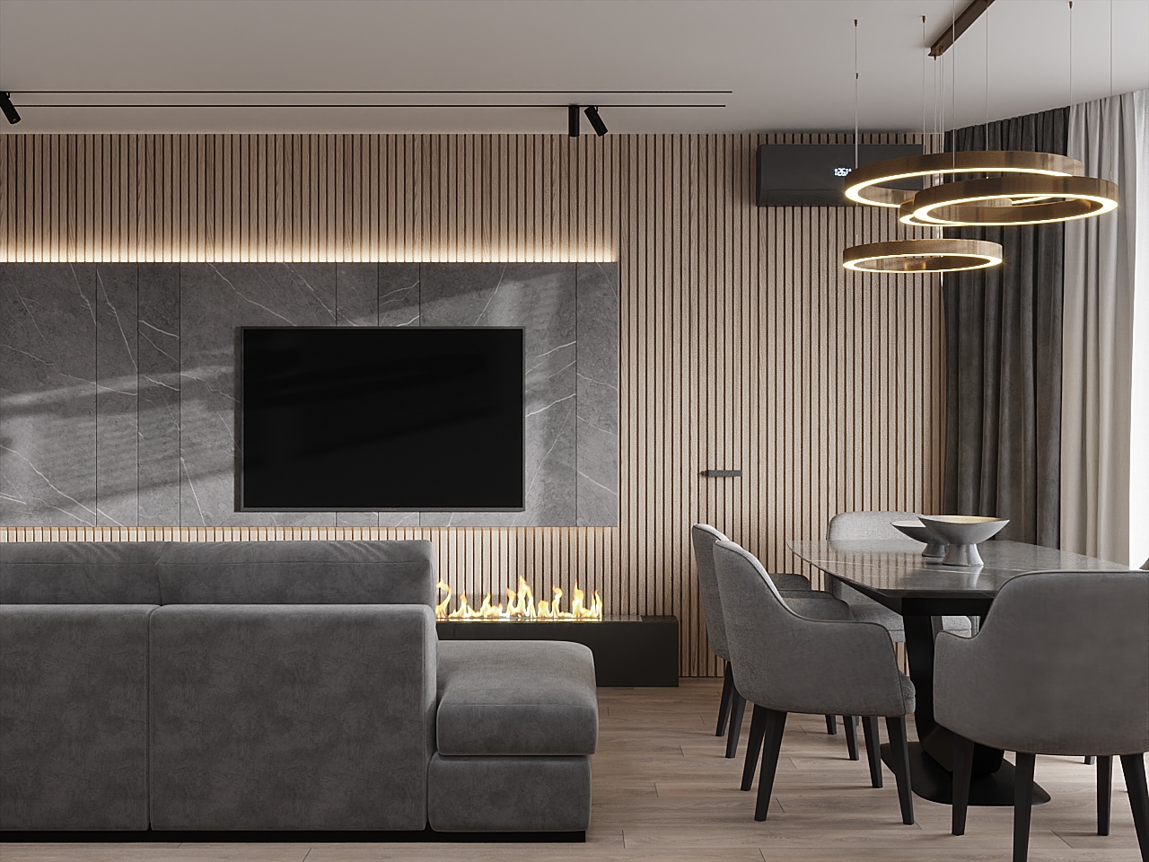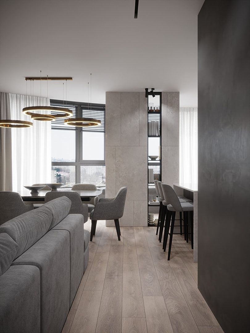 Наше решение: Создали стильный современный интерьер с просторной кухней-гостиной, рабочим кабинетом, гардеробом и изолированными спальными комнатами