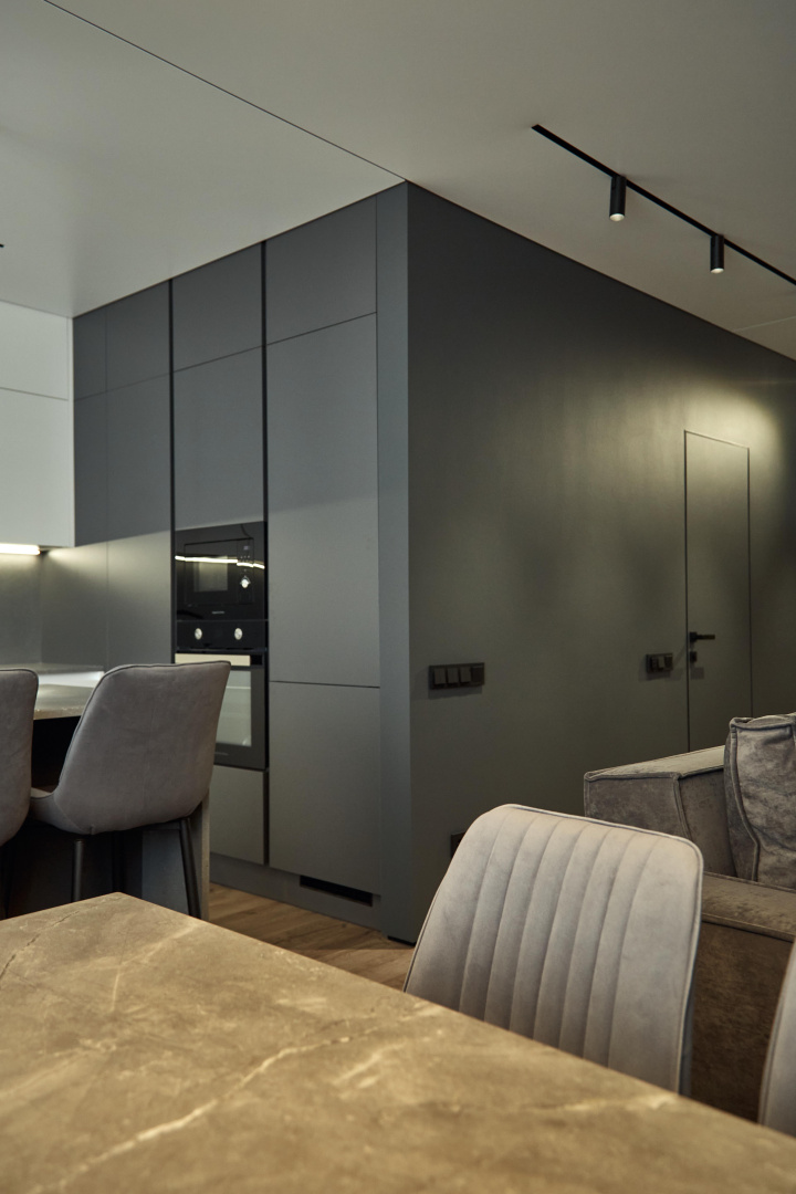 Скрытые двери, обилие белого цвета, трековый свет: проект в минимализме для ценителей современных интерьеров.