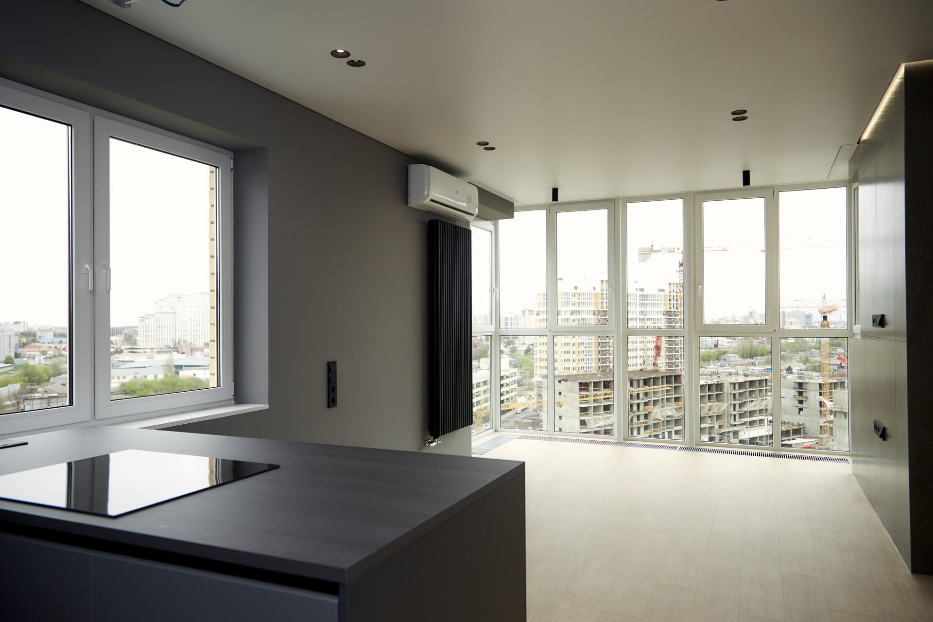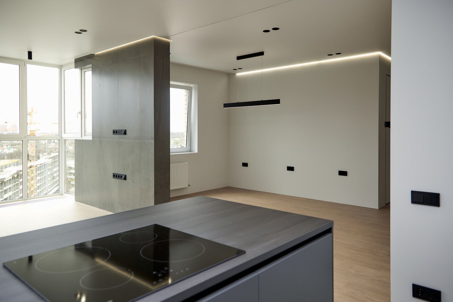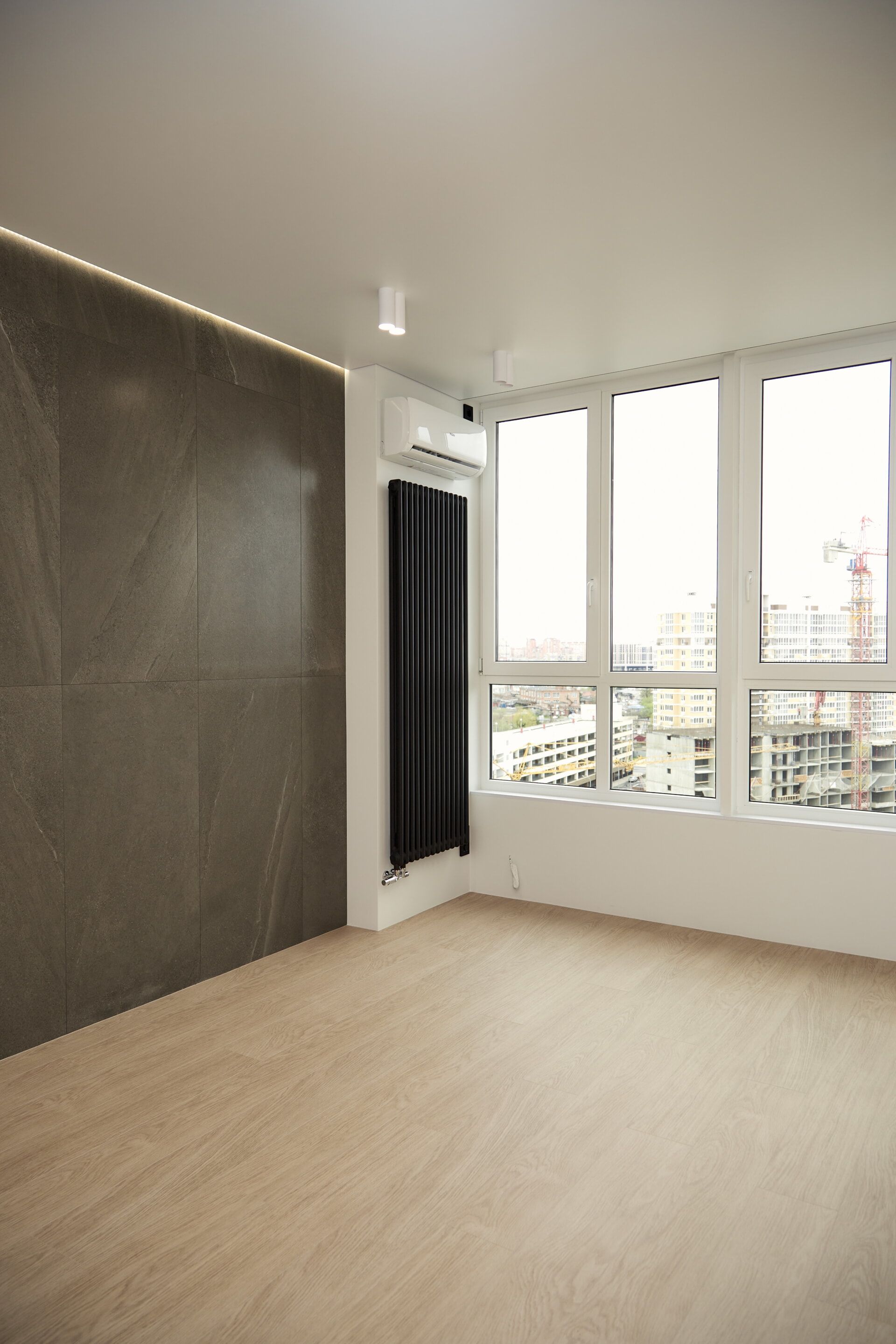 Установили межкомнатные двери скрытого монтажа от компании ProfilDoors, высотой 2,30 м с чёрной окантовкой и фурнитурой. Для освещения выбрали несколько групп света: люстры, точечные и накладные светильники, бра и светодиодную подсветку. Выполнили перепланировку системы отопления в гостиной: установили внутрипольные конвекторы для витражного остекления и вертикальные трубчатые радиаторы российского производства.