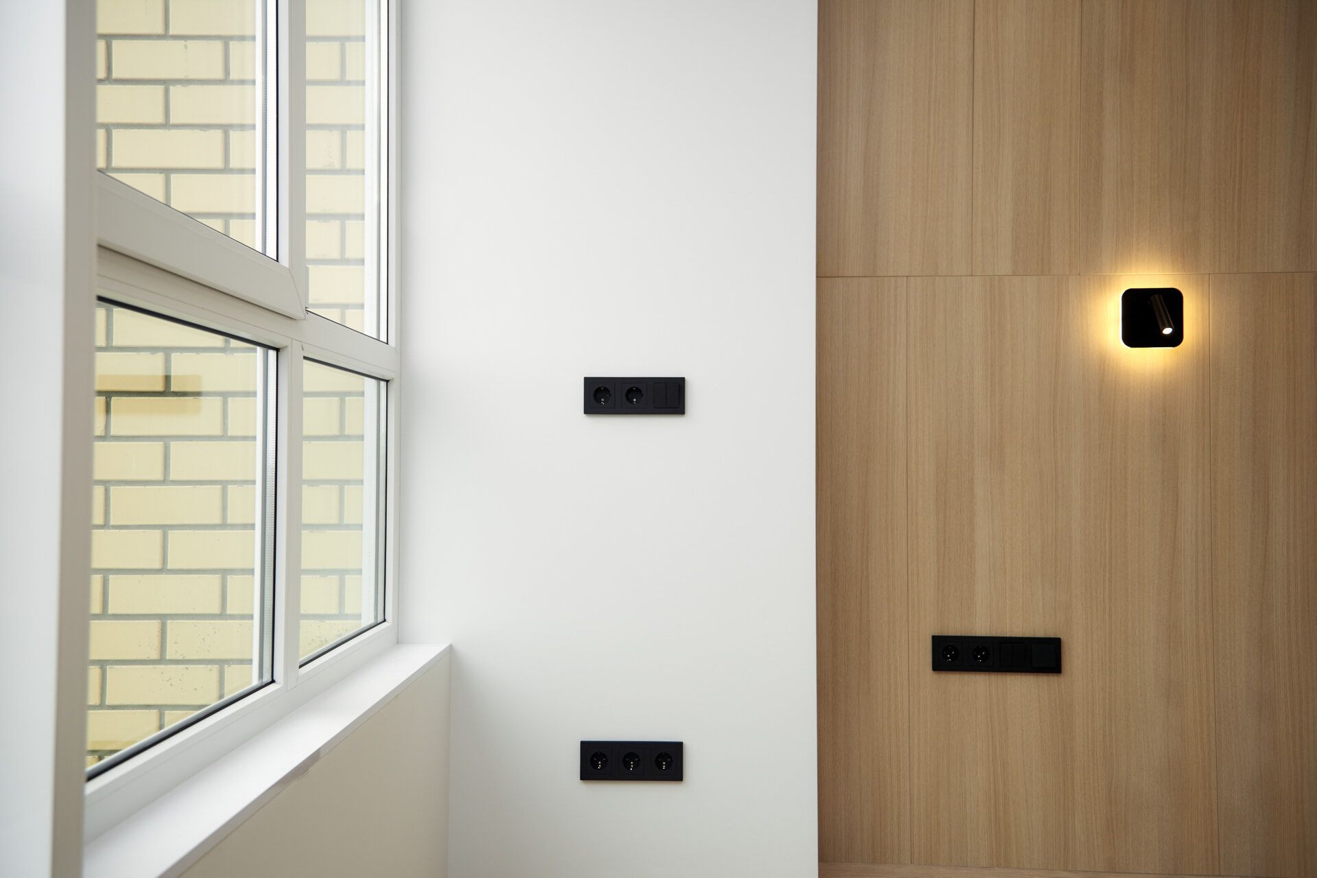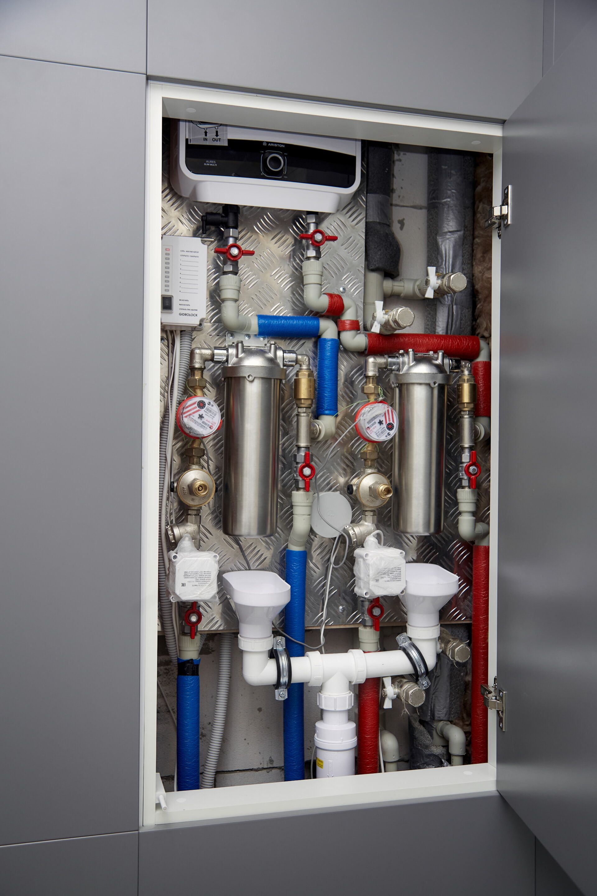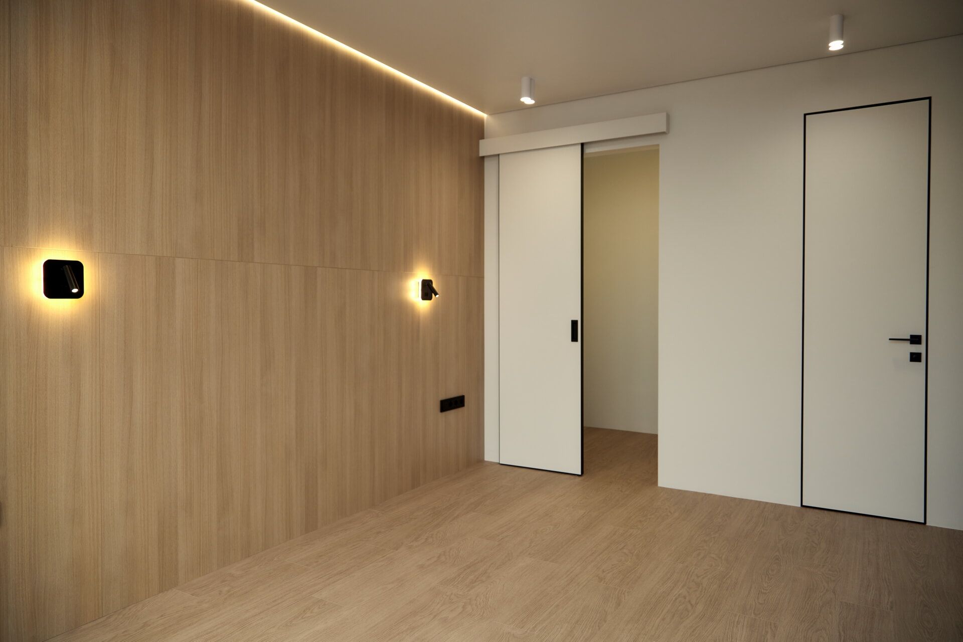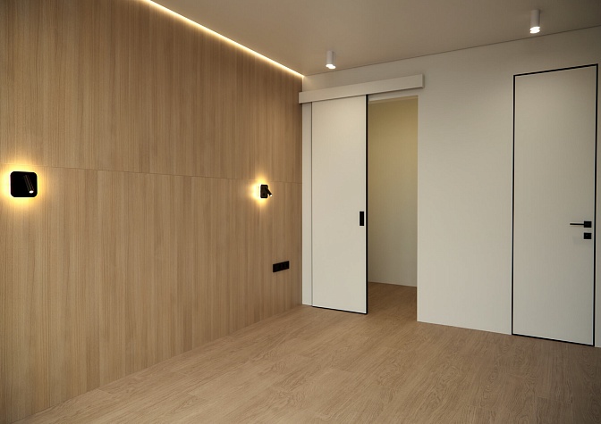 В коридоре установили панель, которая показывает состояние датчиков системы от протечек воды. В мастер-спальне предусмотрели входы в личную гардеробную и личный санузел. Утеплили лоджию и присоединили ее к основной площади комнаты. Установили сплит-систему и выход для бризера. В гардеробную установили раздвижную дверь. В санузле установили инсталляцию, смесители скрытого монтажа, душевую кабину и «тёплую стену».
