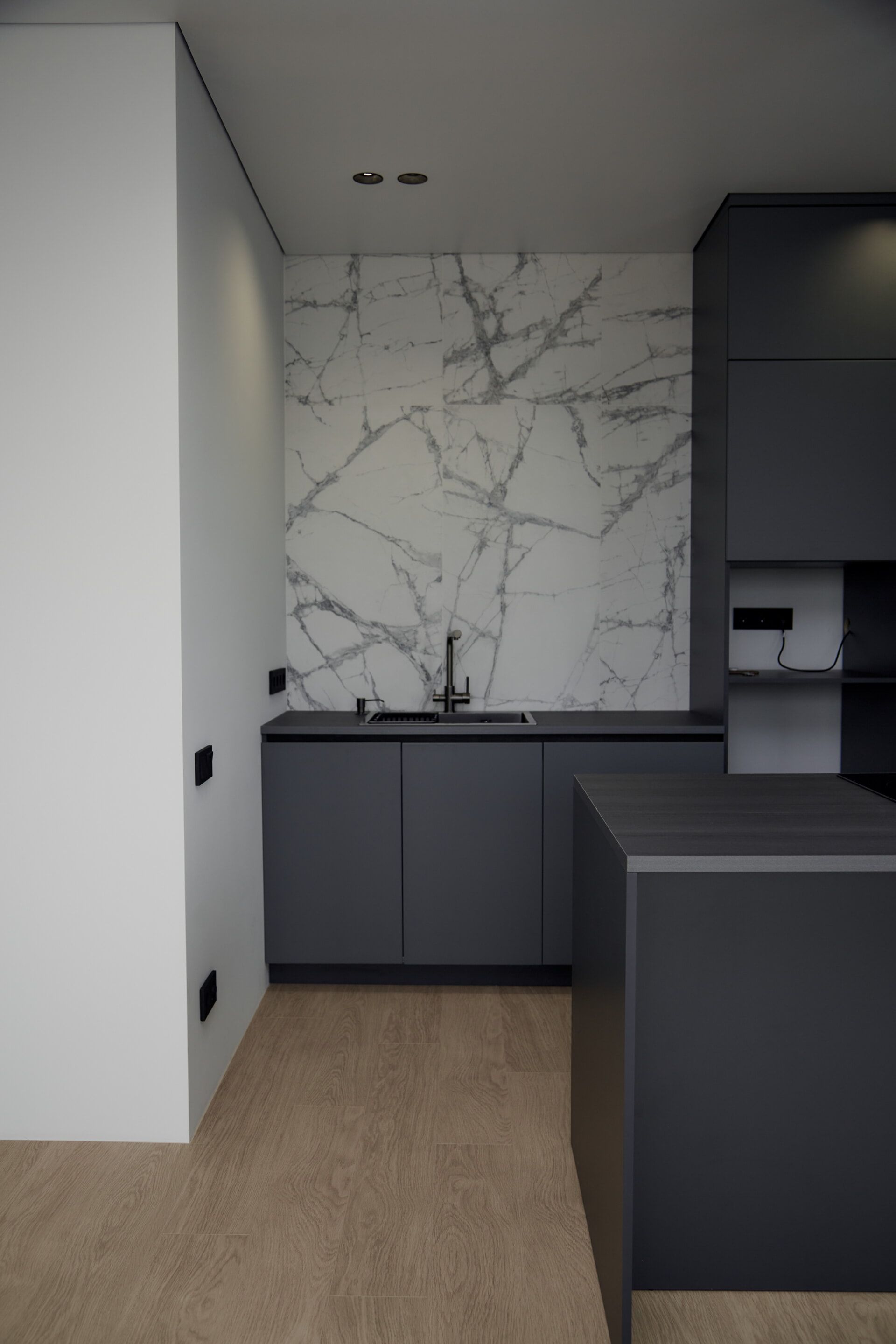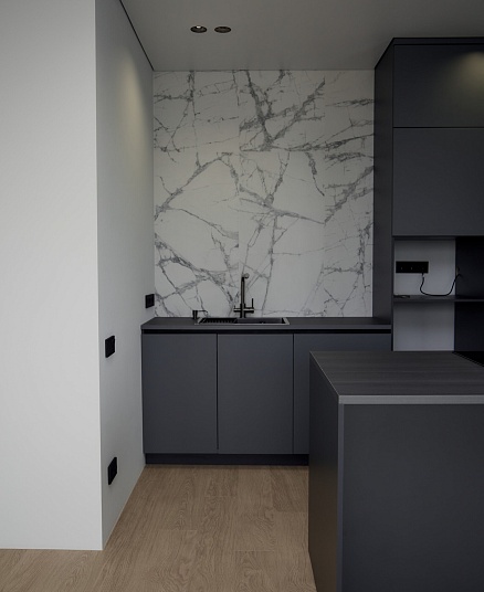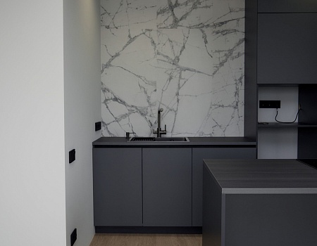 В кухне установили кухонный гарнитур и остров с вытяжкой, встроенной техникой и большим количеством электроустановок для удобства. Под раковиной установили систему обратного осмоса для очистки воды, фильтры, регуляторы давления и другие коммуникации. В ванной комнате установили инсталляцию с подвесным унитазом и гигиенический душ, акриловую ванну, раковину с тумбой, душевую конструкцию с тропическим душем, а также две системы: «тёплый пол» и «тёплая стена» в качестве альтернативы полотенцесушителю. Люк с коммуникациями спрятали за мебельную конструкцию с системами хранения.