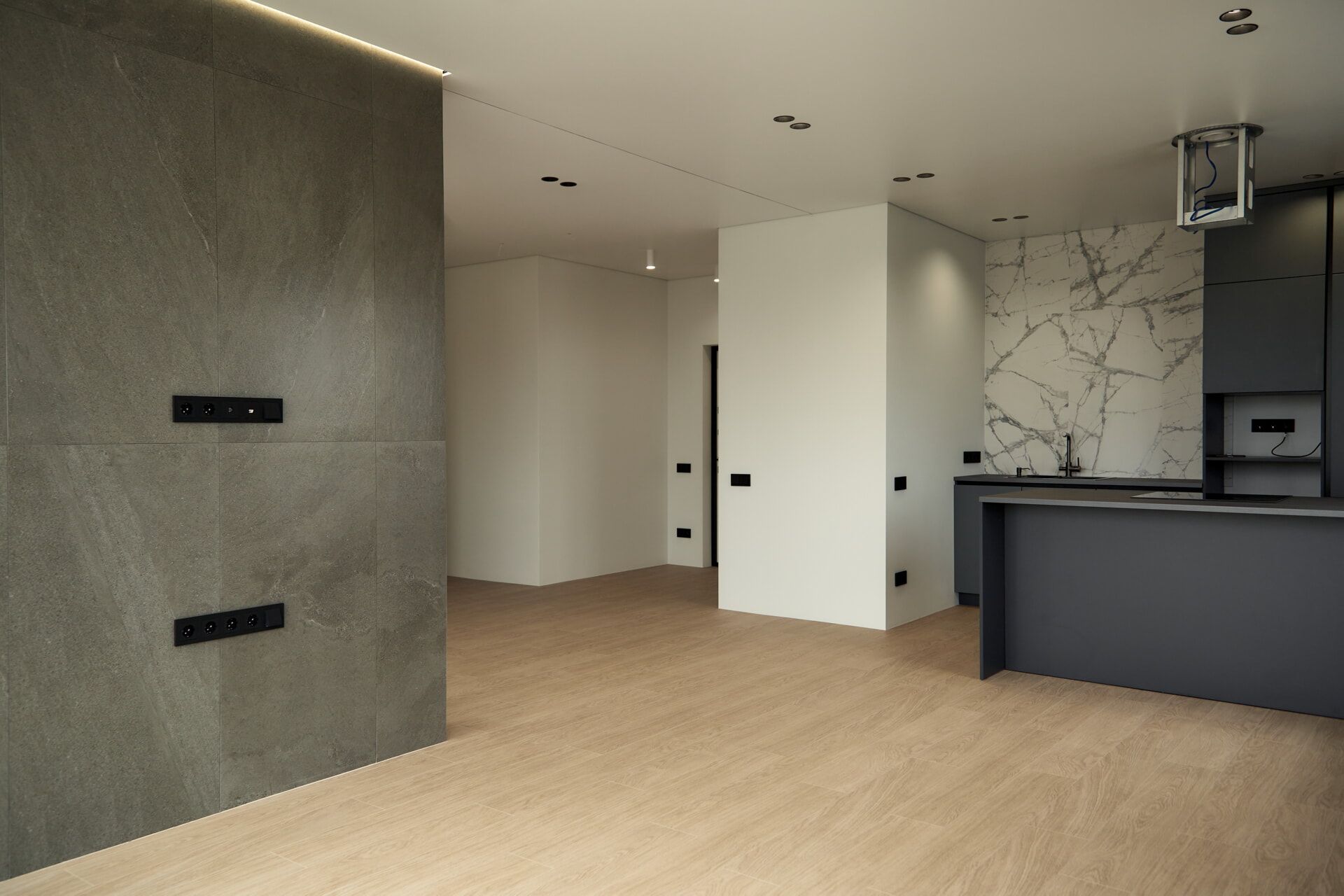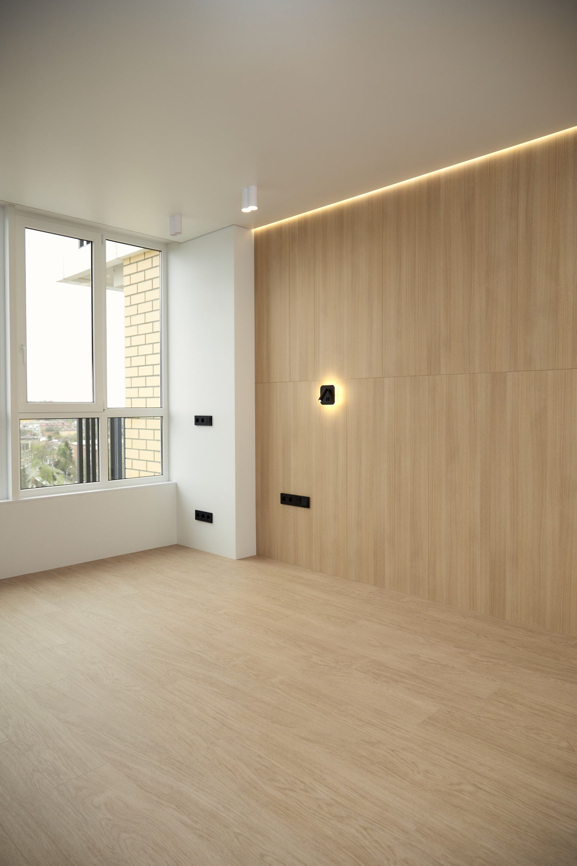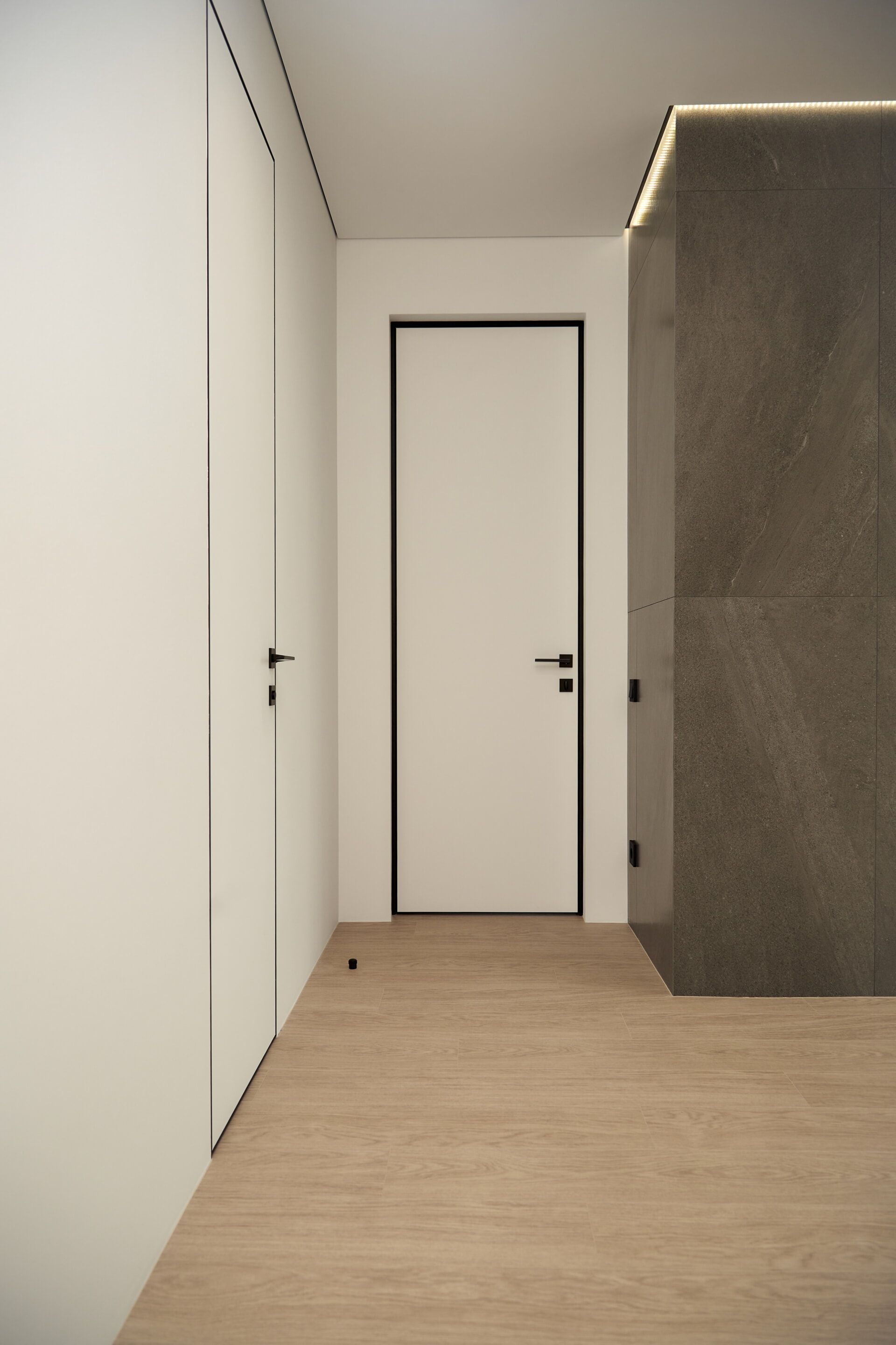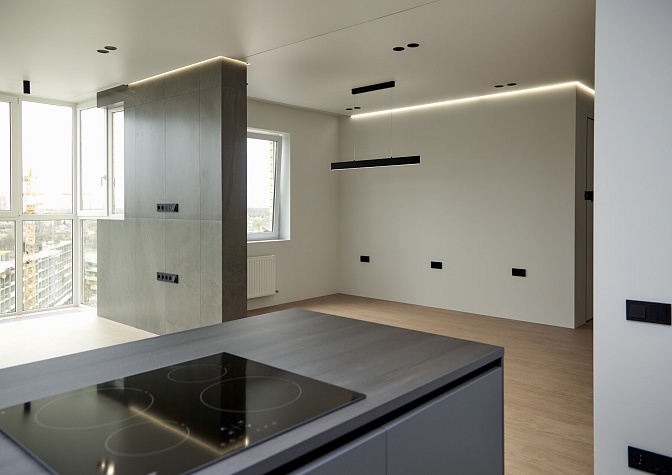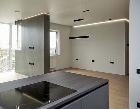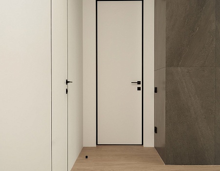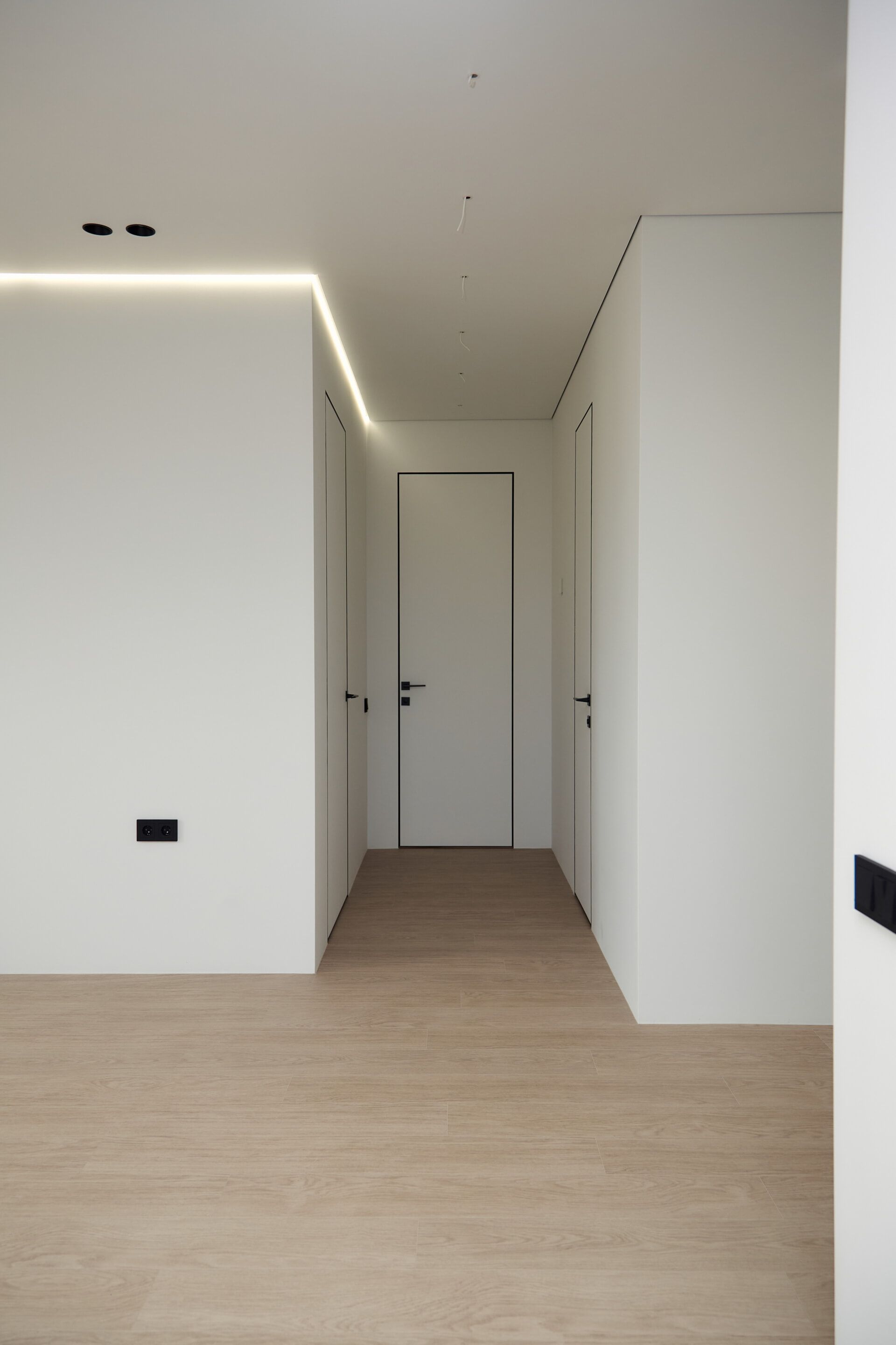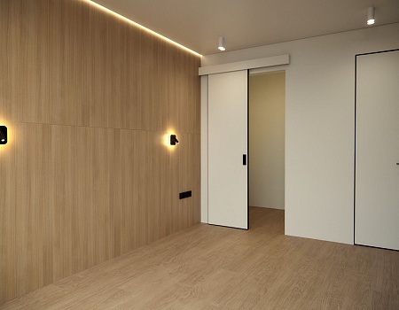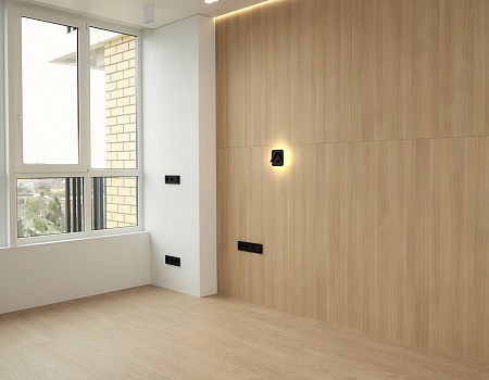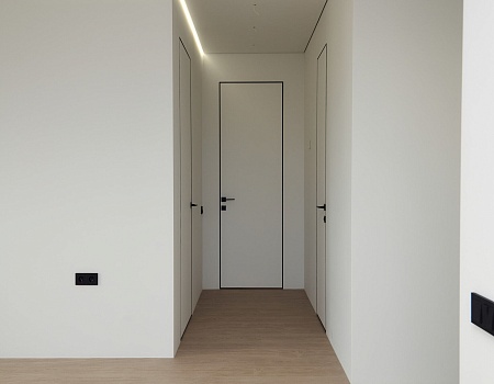 В отделке стен использовали белую, антивандальную краску ProfiTec. На пол уложили кварц-винил единым контуром. Потолок — натяжной, с теневым профилем и нишами под шторы. Заменили входную дверь от застройщика.