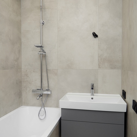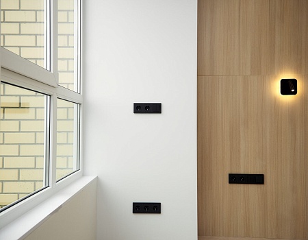 В прихожей обустроили нишу под встроенный шкаф, в котором расположили электрический щит и место для установки wi-fi-роутера. В гостиной облицевали ТВ-зону крупноформатным керамогранитом со скрытым кабель-каналом для проводов. Присоединенную зону лоджии основательно утеплили.