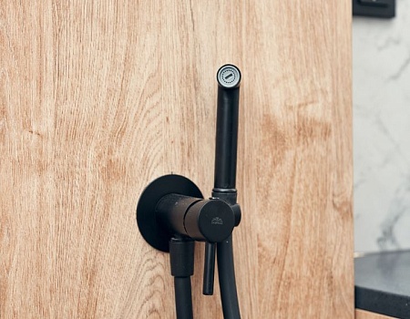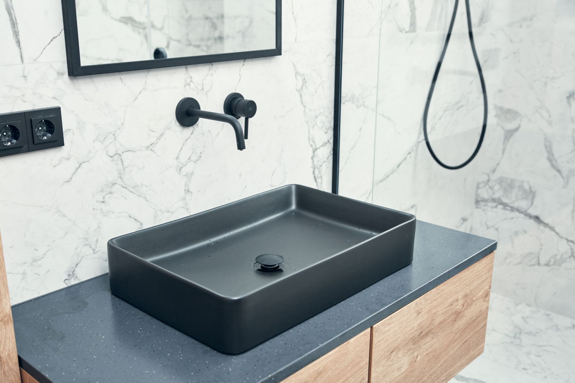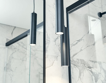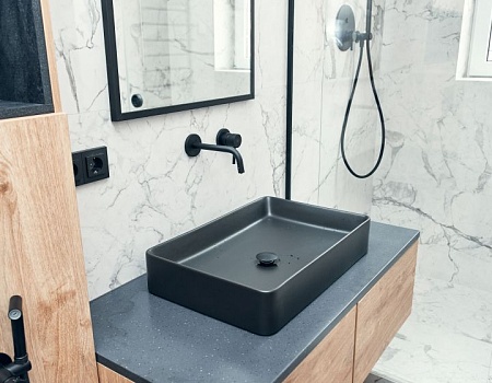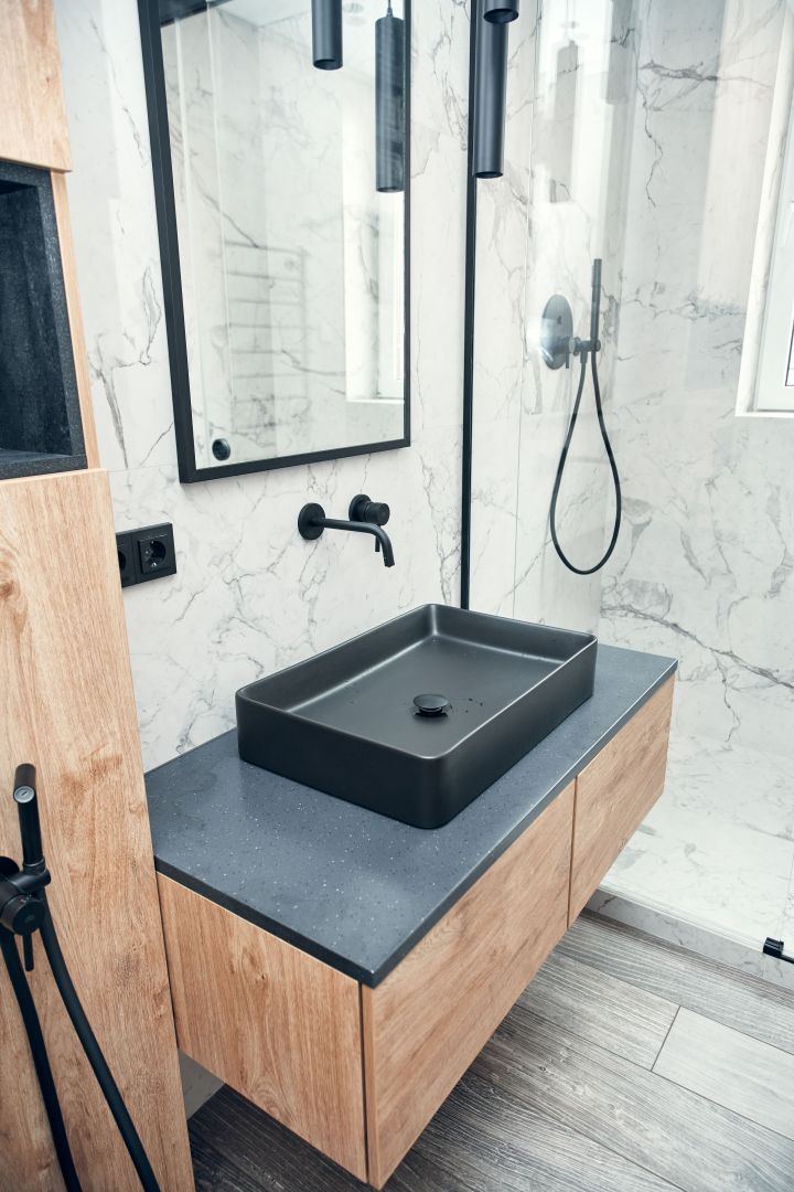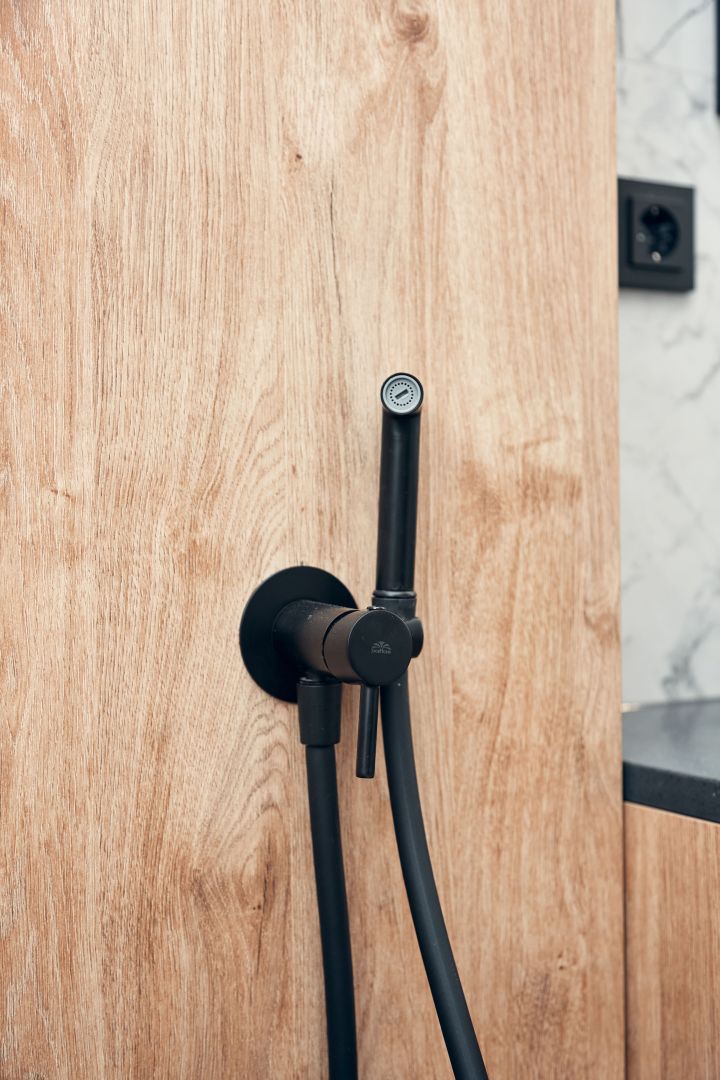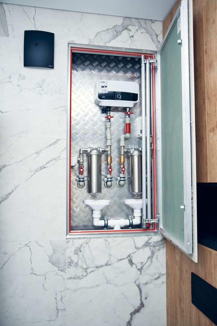 Гостиную разделили на две зоны для отдыха и работы. ТВ-зону декорировали керамогранитом с рисунком под мрамор, а также провели скрытый кабель-канал, чтобы спрятать провода. Установили множество систем хранения, рабочий стол, сплит-систему. В душевой комнате установили инсталляцию с подвесным унитазом, гигиенический душ, электрический полотенцесушитель, мебельные конструкции с системами хранения, тумбу с накладной раковиной и зеркалом. Смесители скрытого монтажа бренда Paffoni в чёрном цвете. На одной из стен спрятали люк, в котором расположились фильтры грубой очистки воды, система против протечек, проточный водонагреватель, сифон с сухим затвором. Душевую зону выполнили в строительном исполнении с уклоном в сторону трапа. Установили раздвижную стеклянную перегородку и тропический душ.