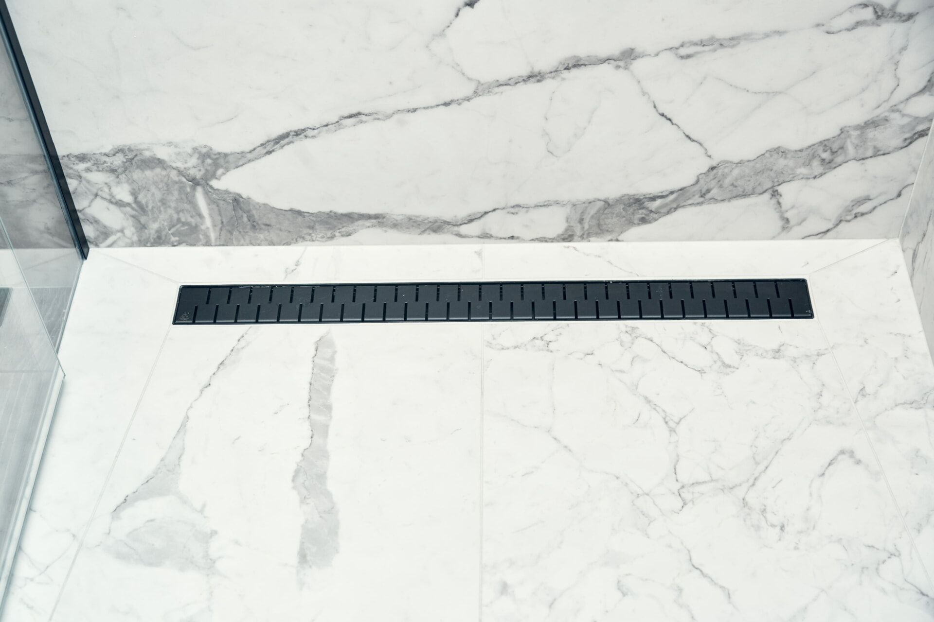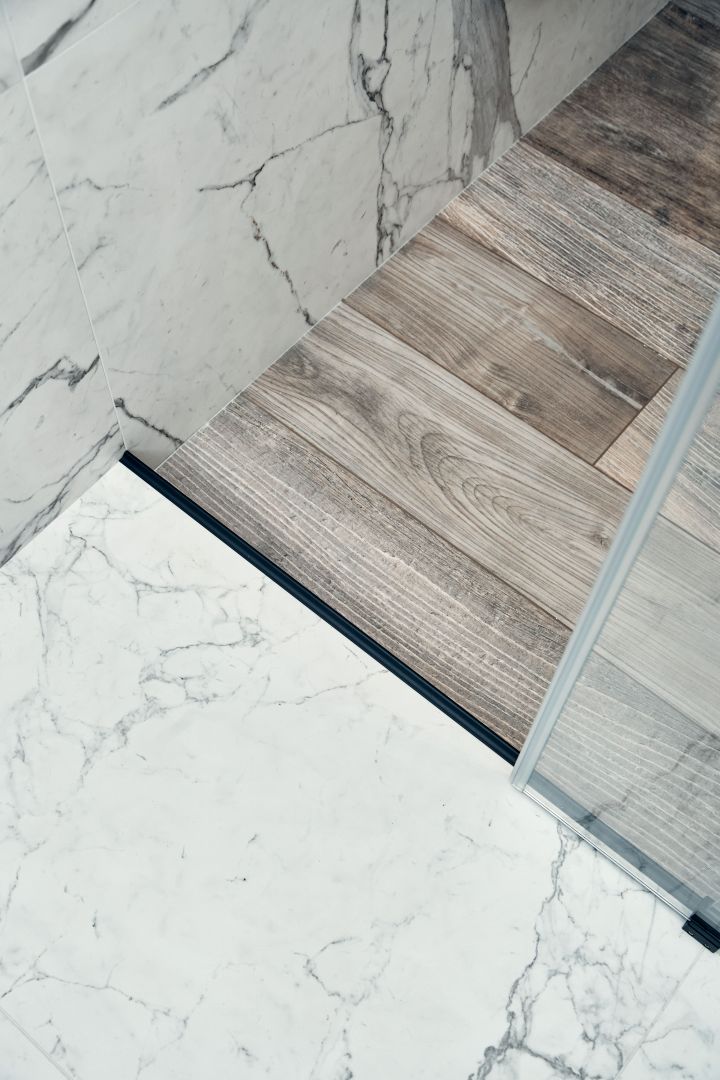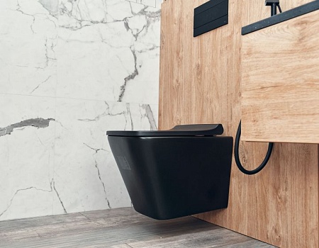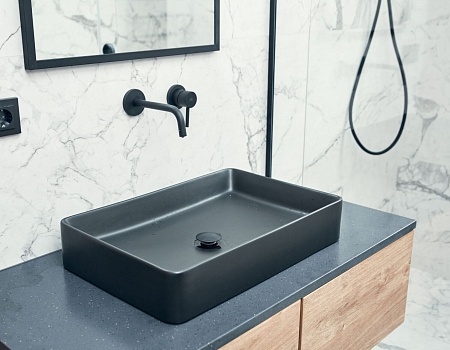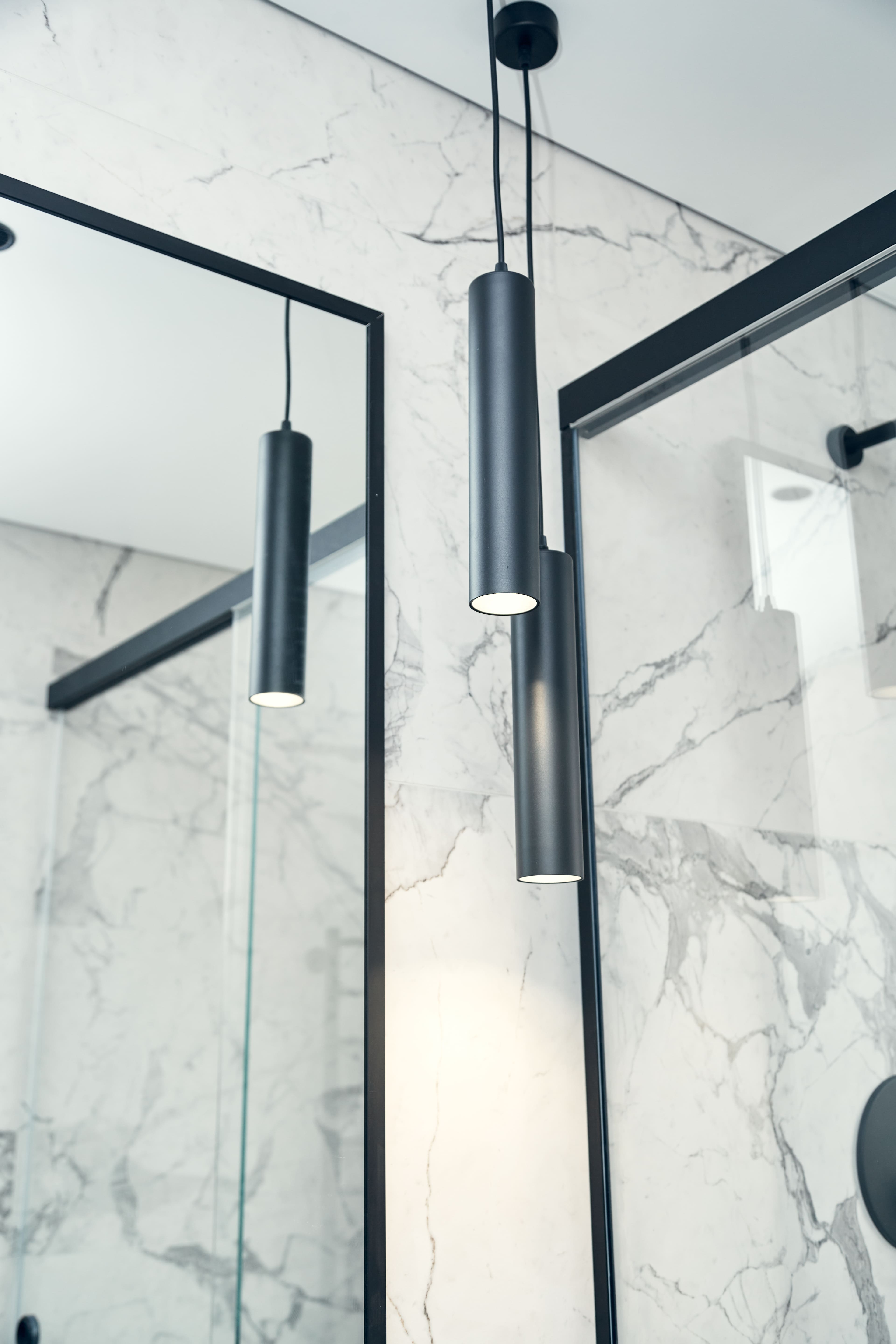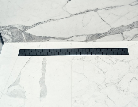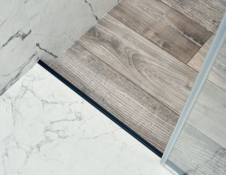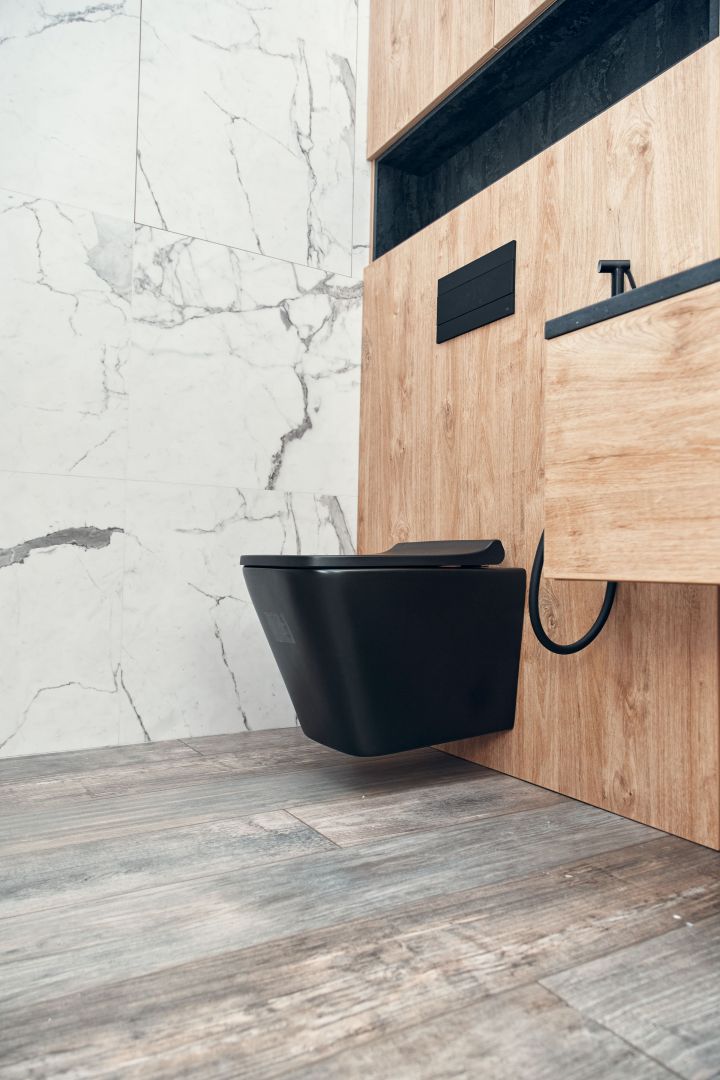 Гостиную разделили на две зоны для отдыха и работы. ТВ-зону декорировали керамогранитом с рисунком под мрамор, а также провели скрытый кабель-канал, чтобы спрятать провода. Установили множество систем хранения, рабочий стол, сплит-систему. В душевой комнате установили инсталляцию с подвесным унитазом, гигиенический душ, электрический полотенцесушитель, мебельные конструкции с системами хранения, тумбу с накладной раковиной и зеркалом. Смесители скрытого монтажа бренда Paffoni в чёрном цвете. На одной из стен спрятали люк, в котором расположились фильтры грубой очистки воды, система против протечек, проточный водонагреватель, сифон с сухим затвором. Душевую зону выполнили в строительном исполнении с уклоном в сторону трапа. Установили раздвижную стеклянную перегородку и тропический душ.