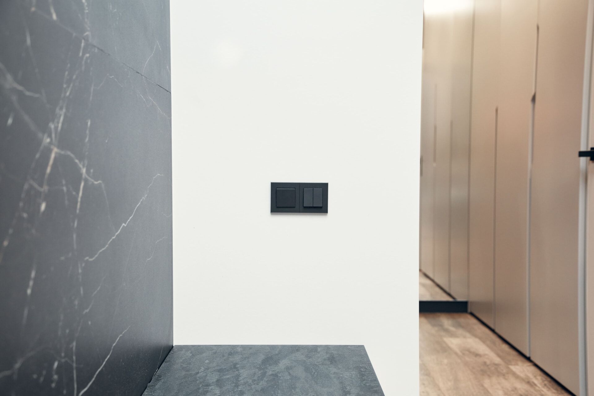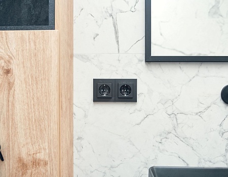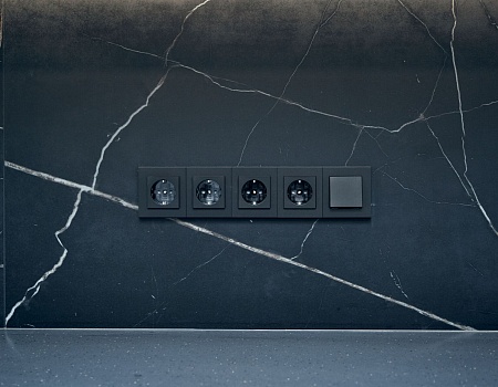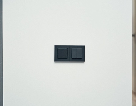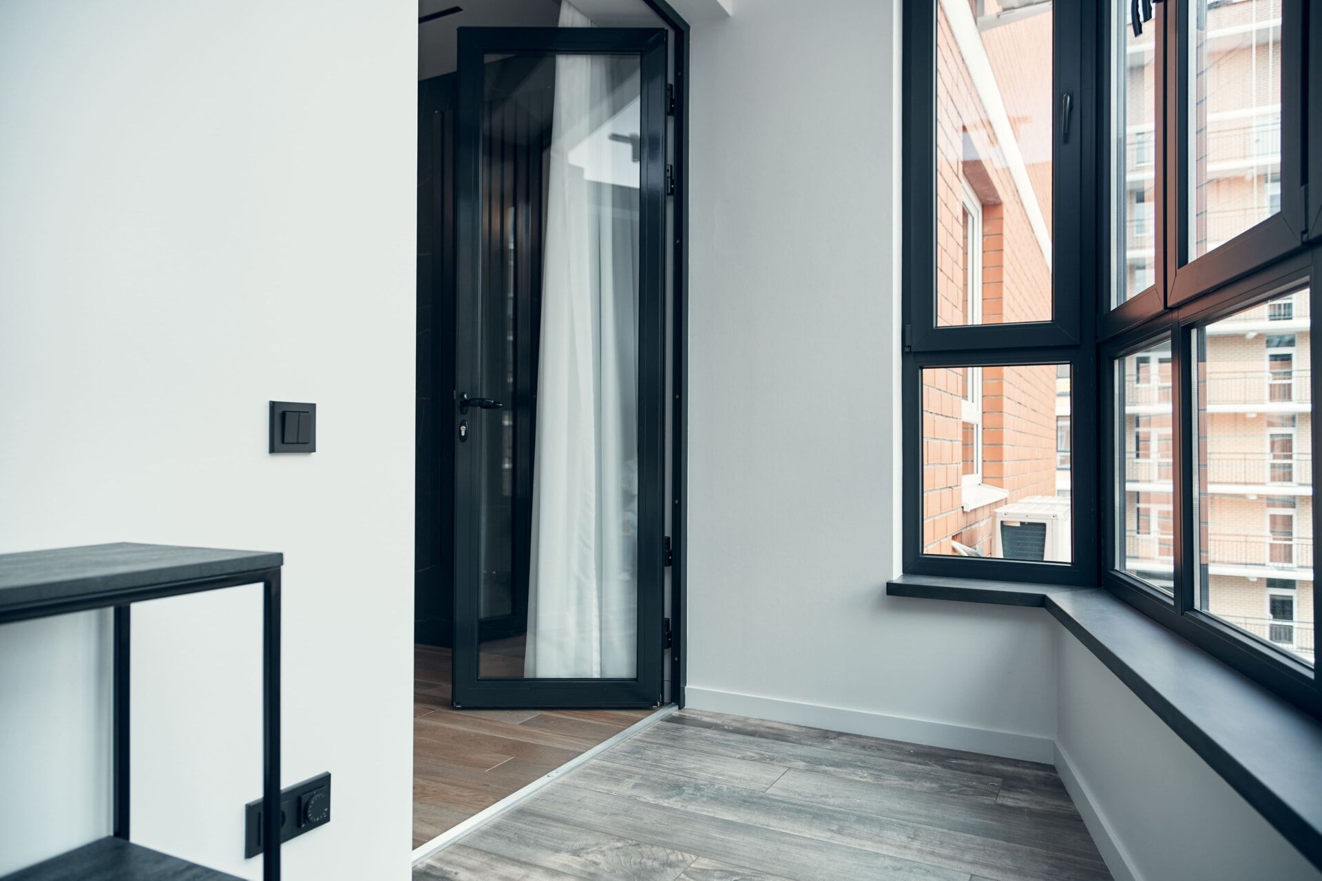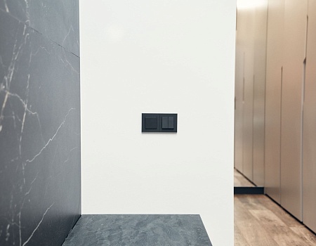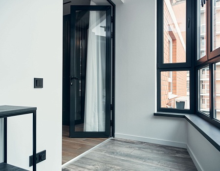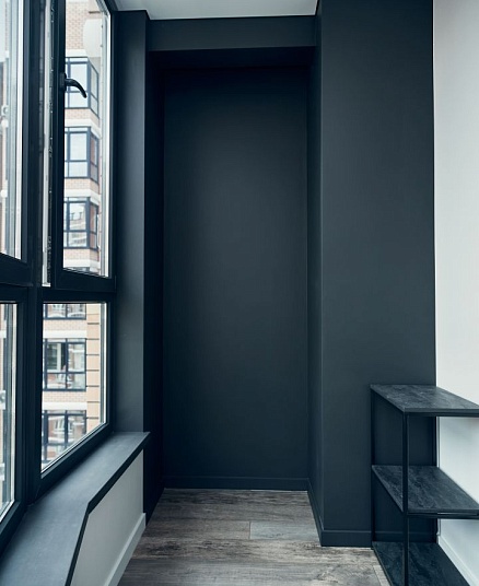 На лоджии установили электрический «теплый пол», подоконники выполнили из архитектурного бетона, окрасили остекление от застройщика в чёрный, матовый цвет. Для освещения выбрали трековые светильники Donolux, а в качестве электроустановок — бренд ABB, серию Levit.