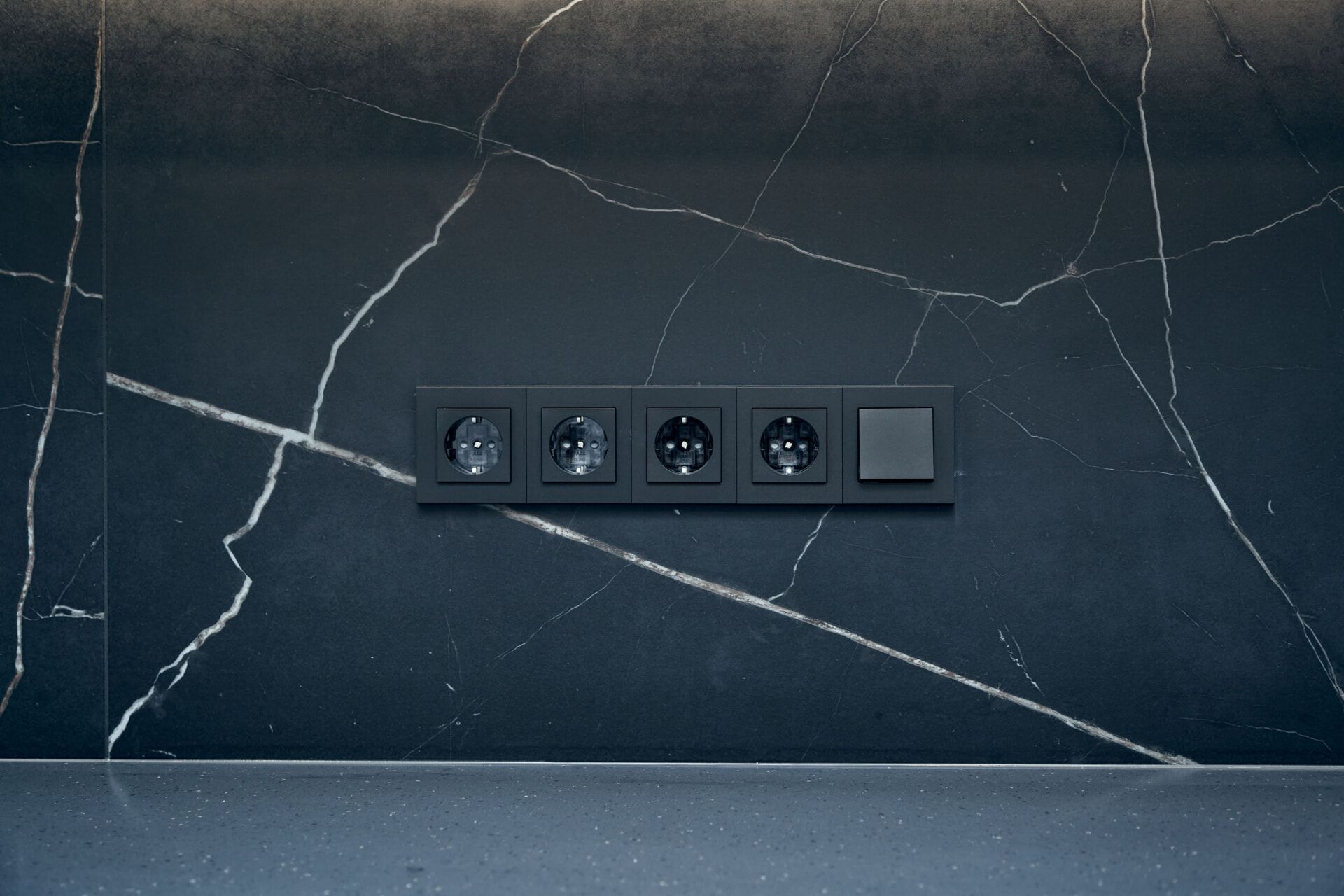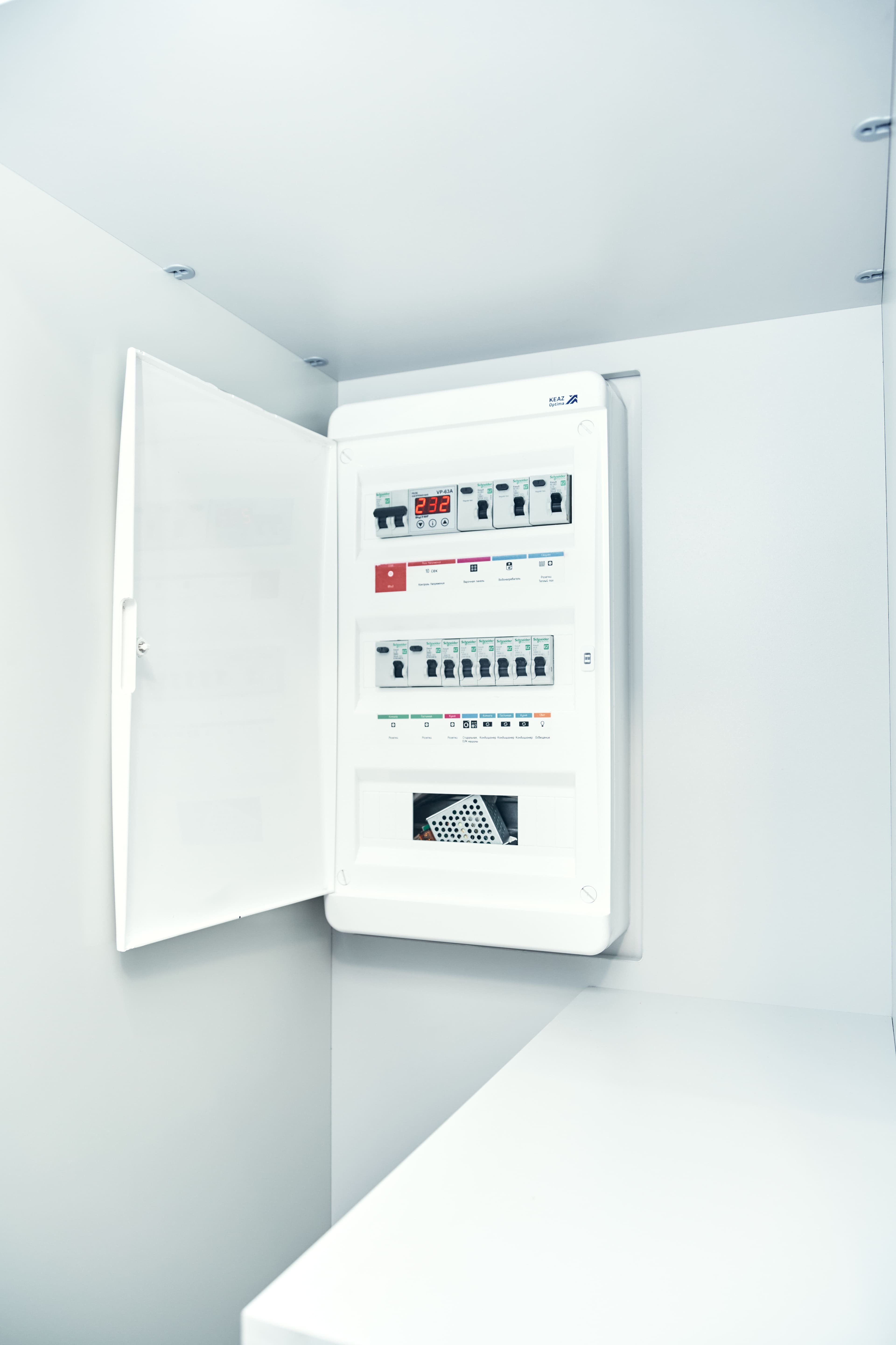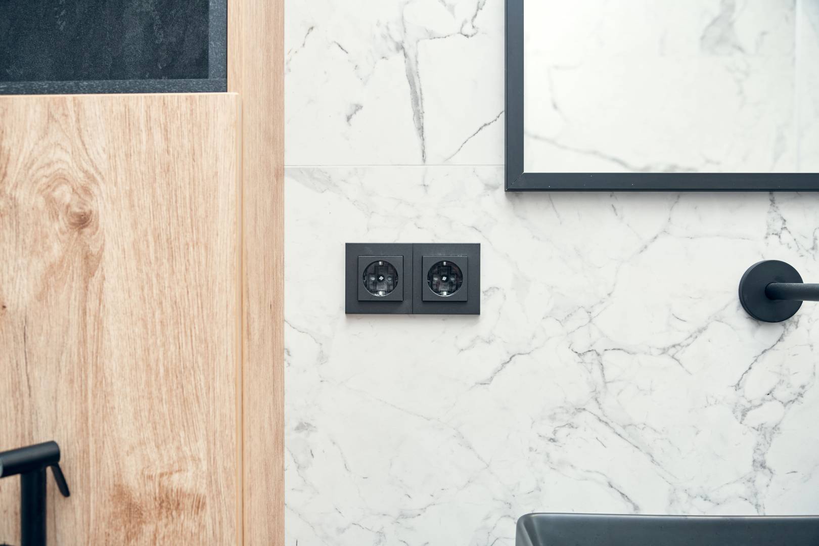 На лоджии установили электрический «теплый пол», подоконники выполнили из архитектурного бетона, окрасили остекление от застройщика в чёрный, матовый цвет. Для освещения выбрали трековые светильники Donolux, а в качестве электроустановок — бренд ABB, серию Levit.